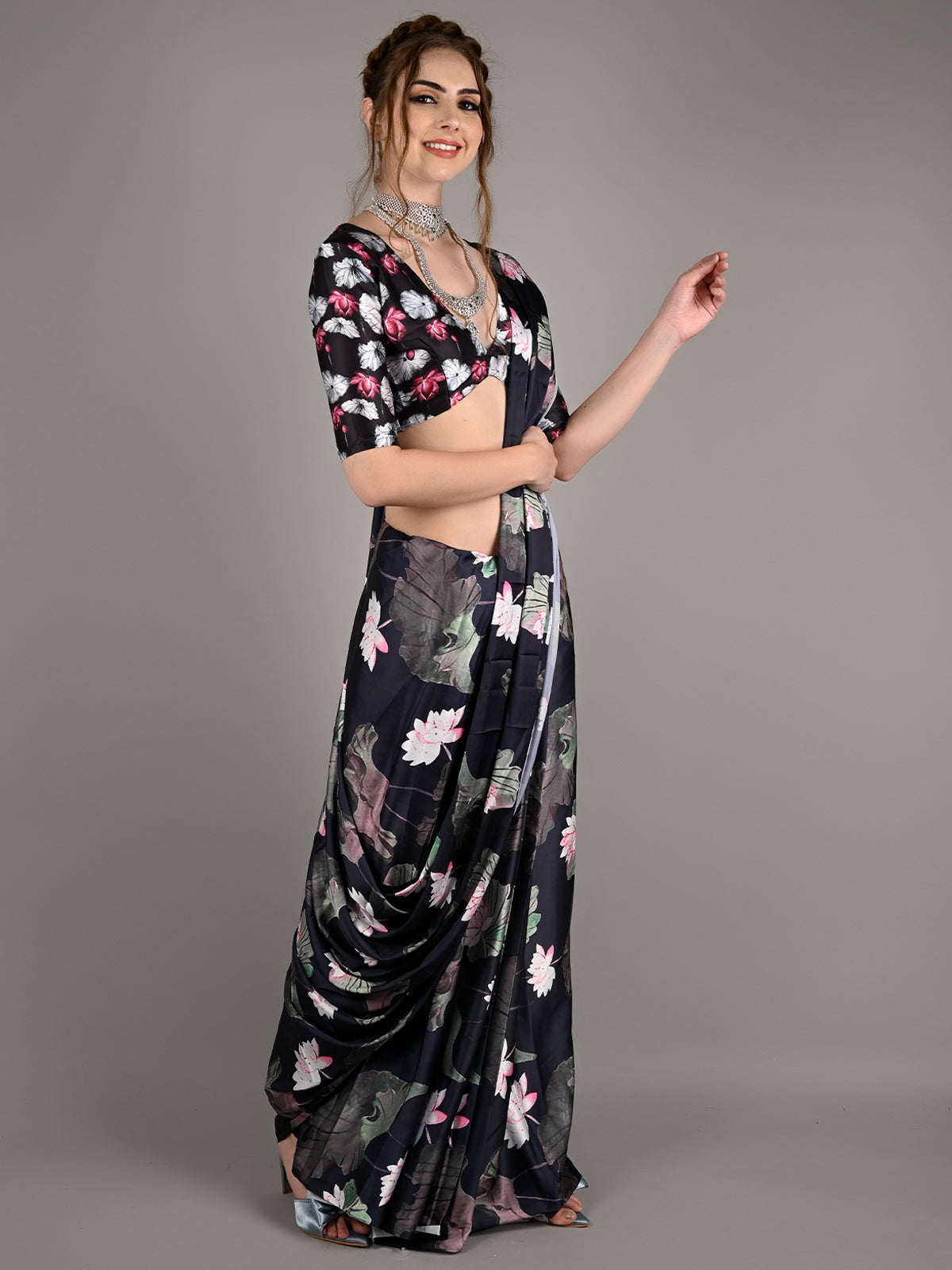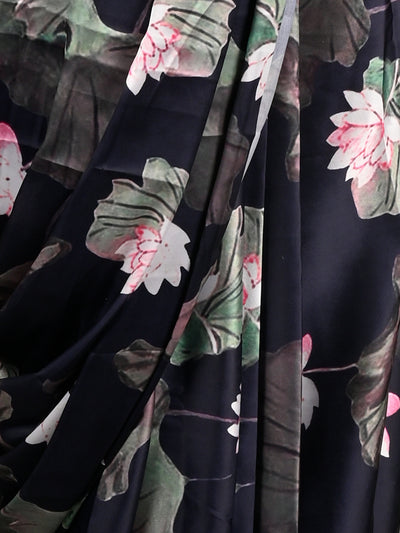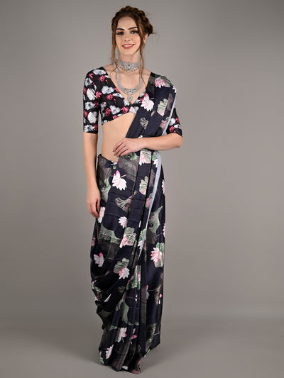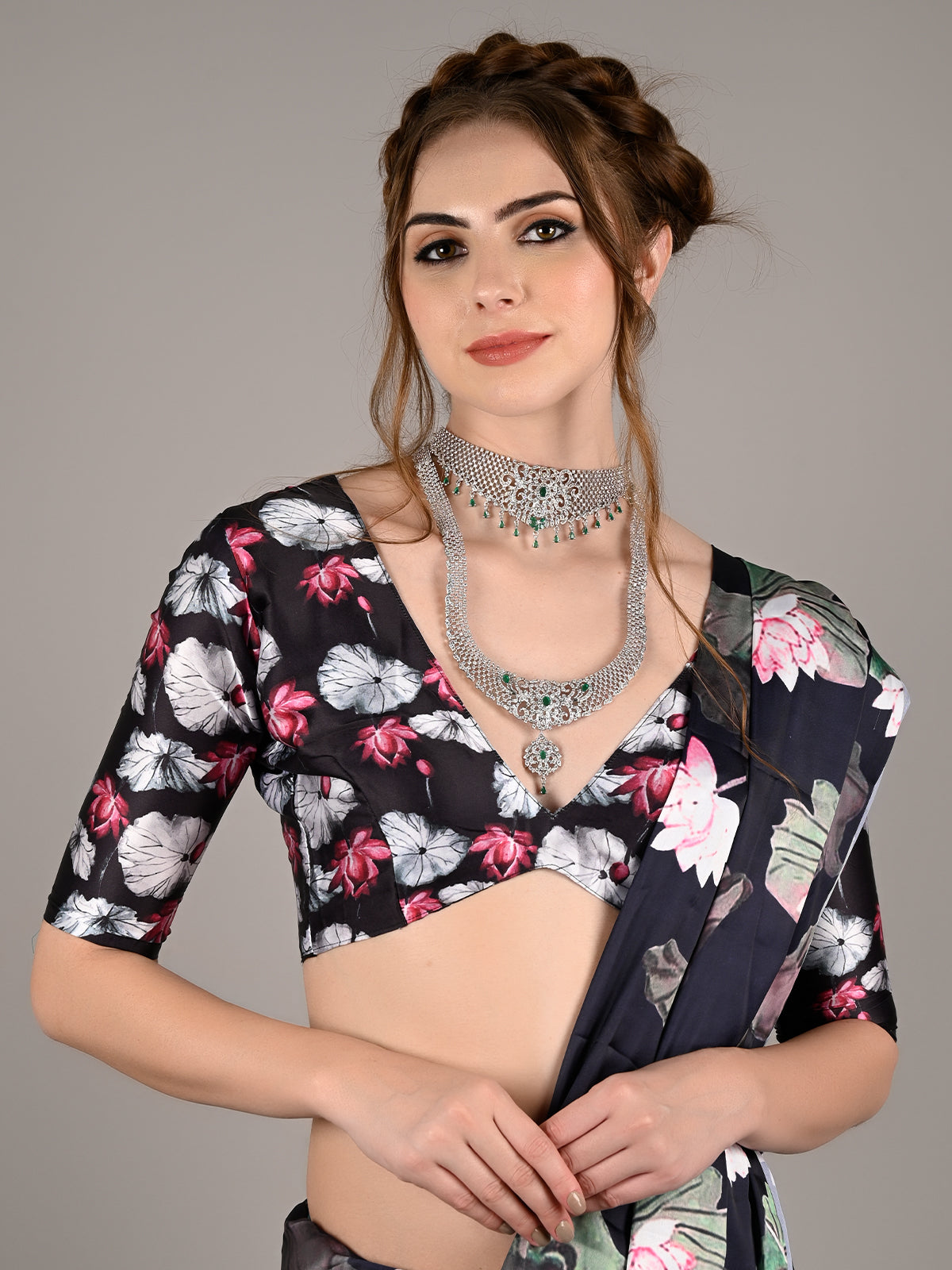 Black Silk Blend Digital Floral Print Saree With Unstitched Blouse