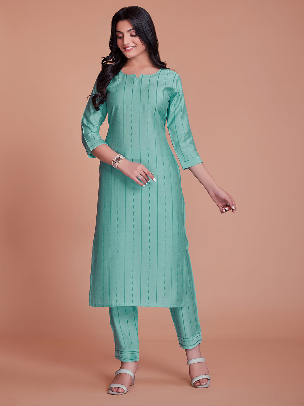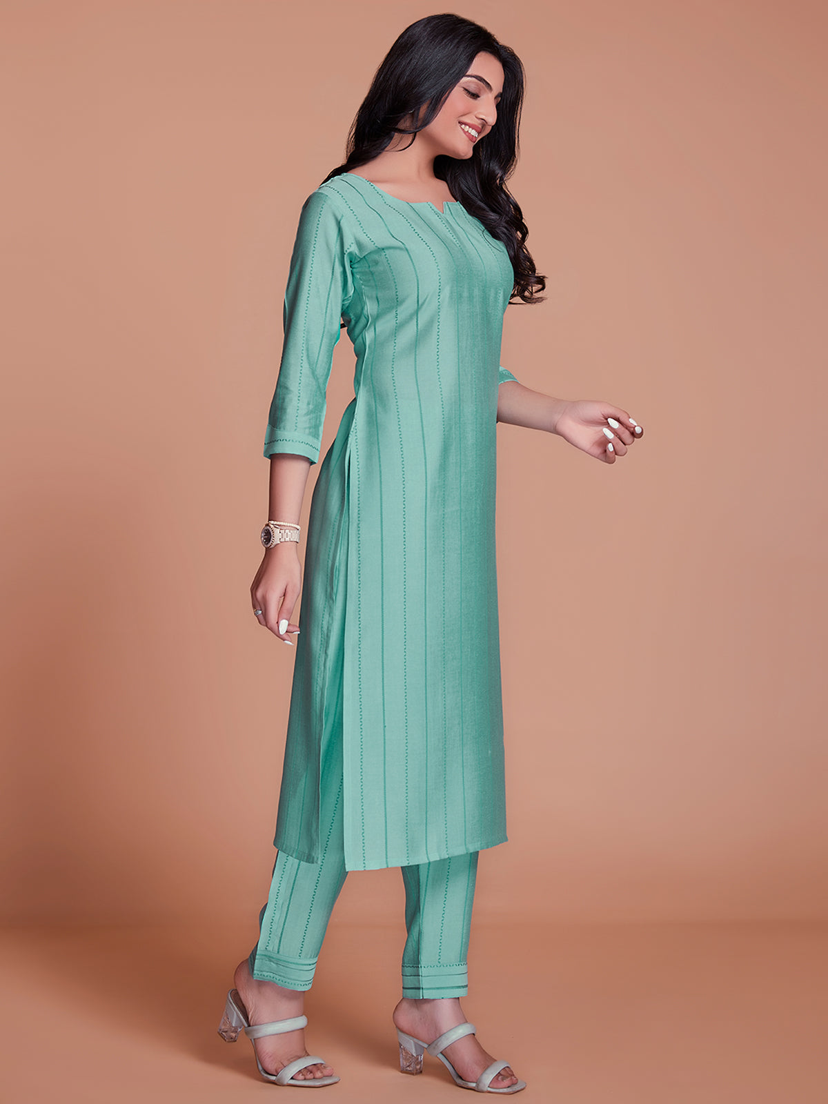 Blue colored suit is prettified with weaving work as shown which makes it appear classy. This top is made of viscose fabric which is accompanied with bottom.