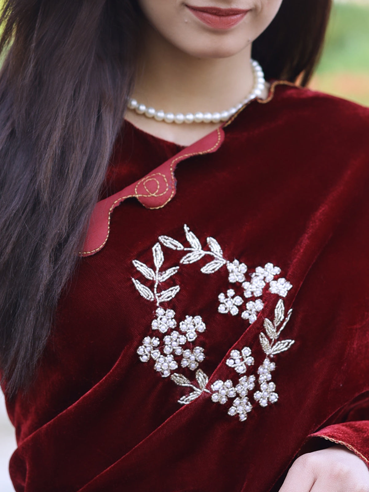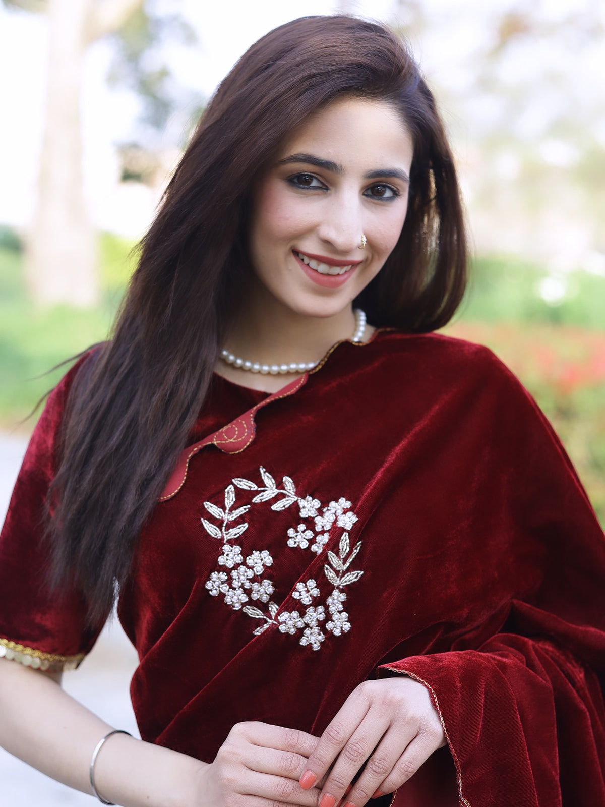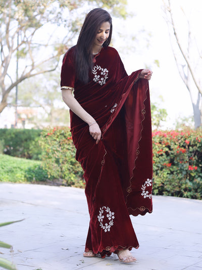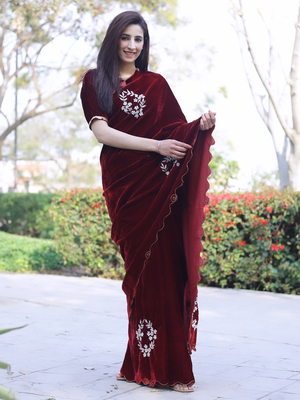 Odette Women Velvet Embroidered Red Saree With Blouse Piece