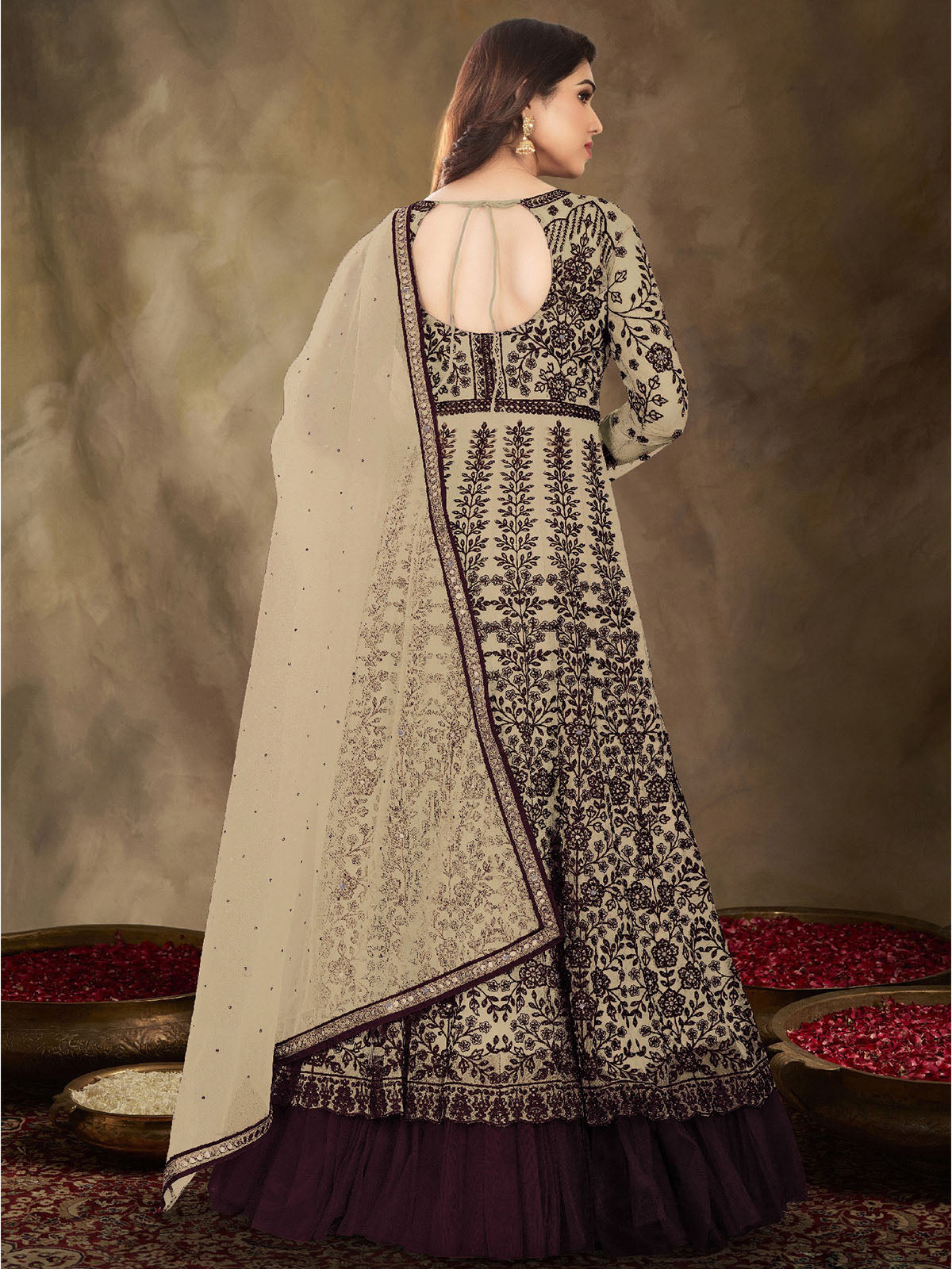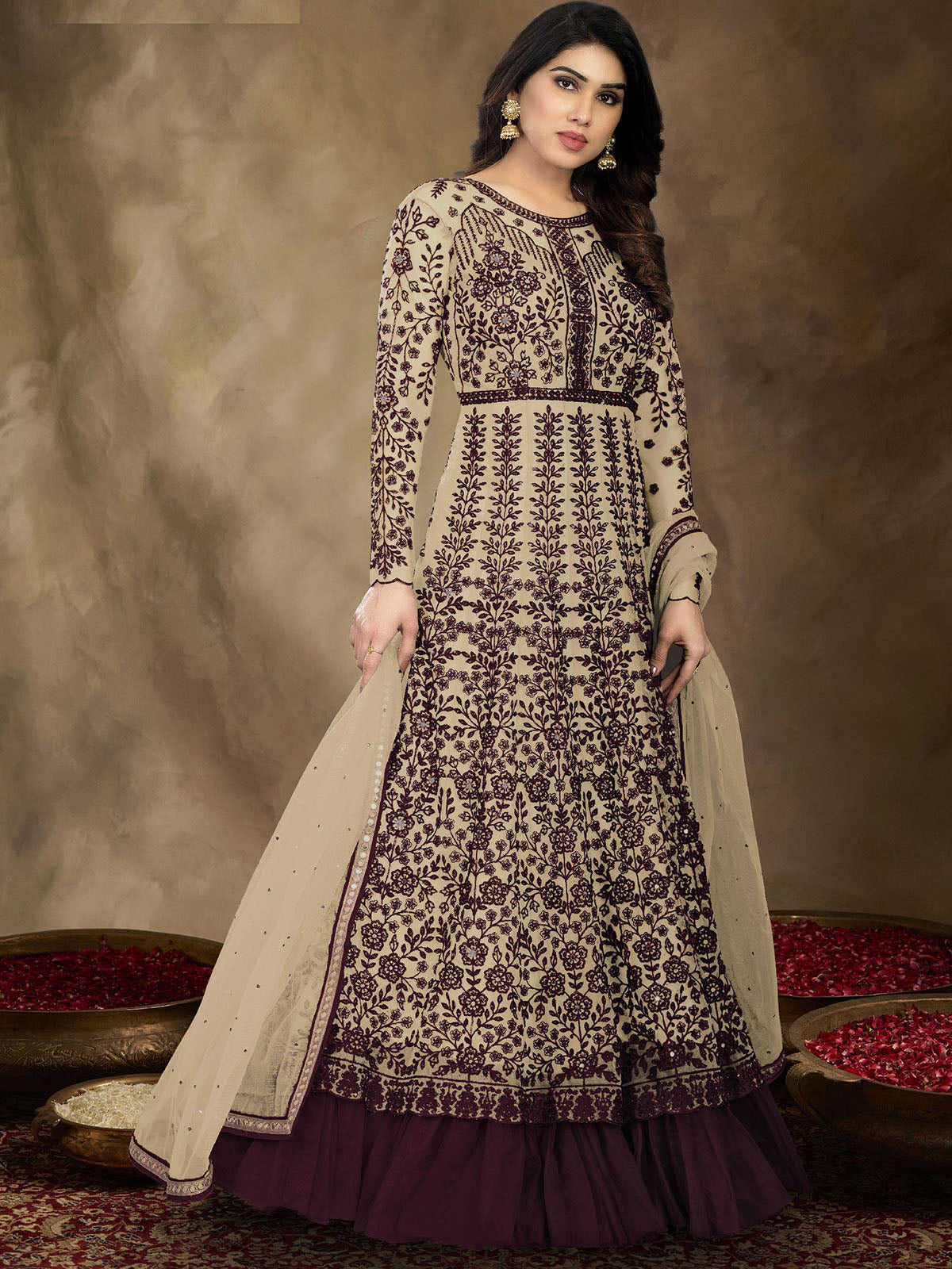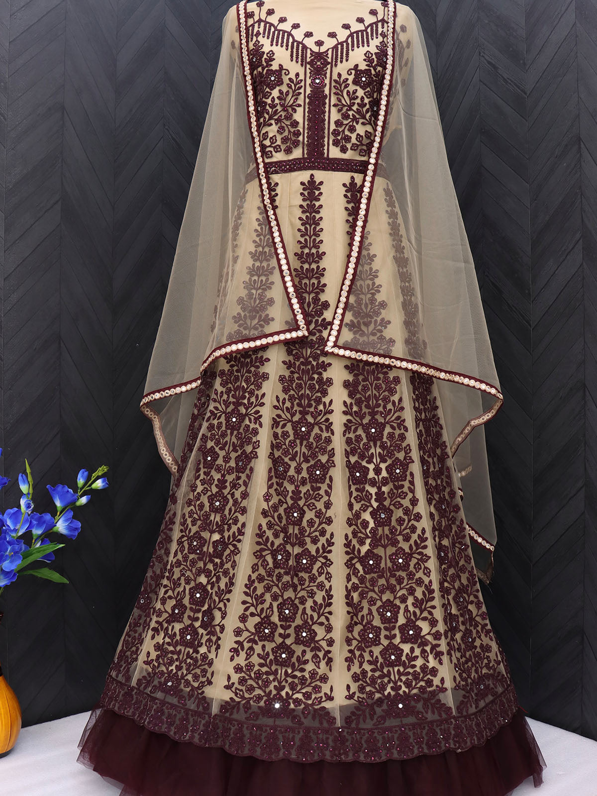 Odette Women Brown Colored Partywear Embroidered Netted Semi Stitched Anarkali Suit