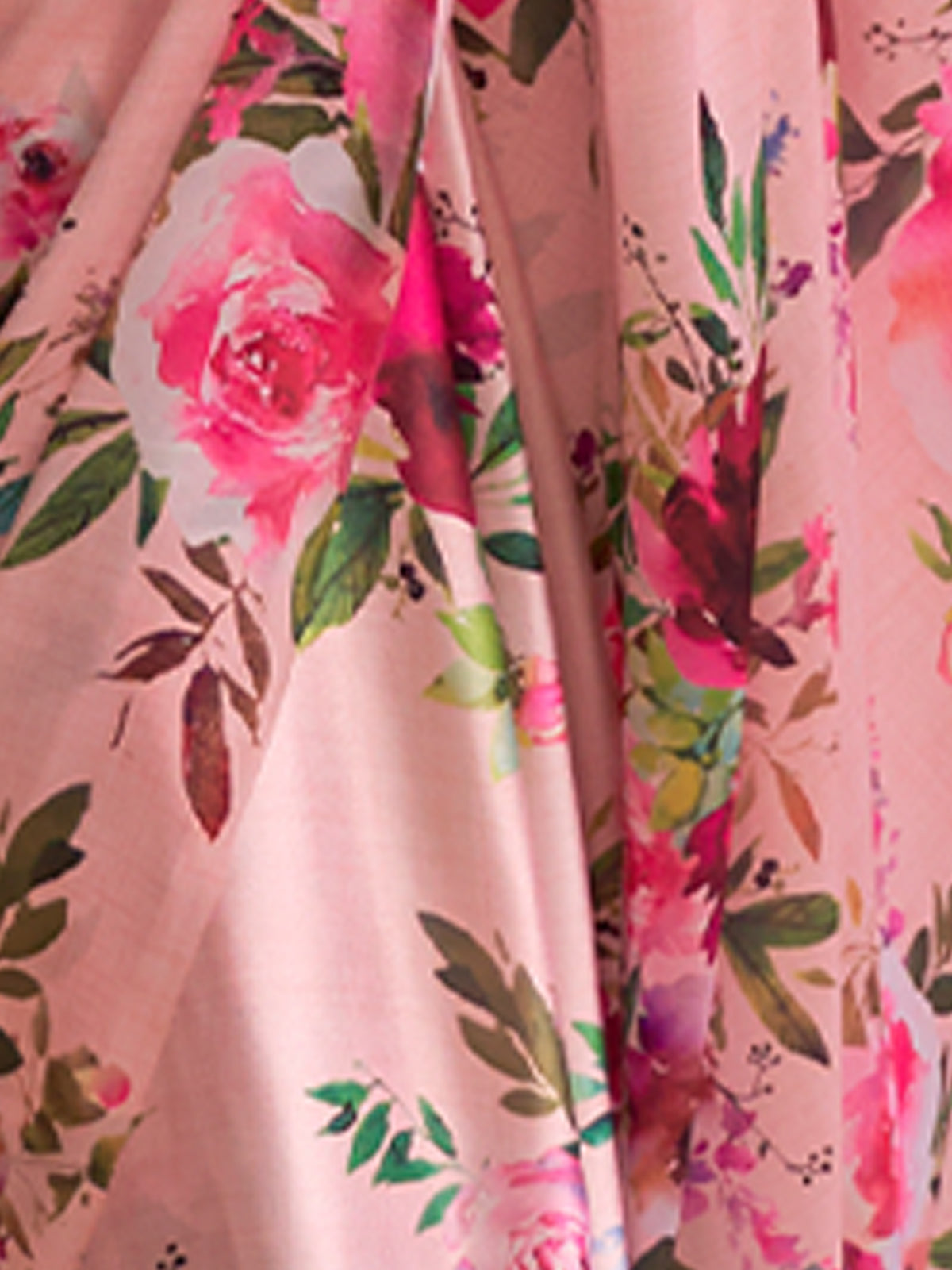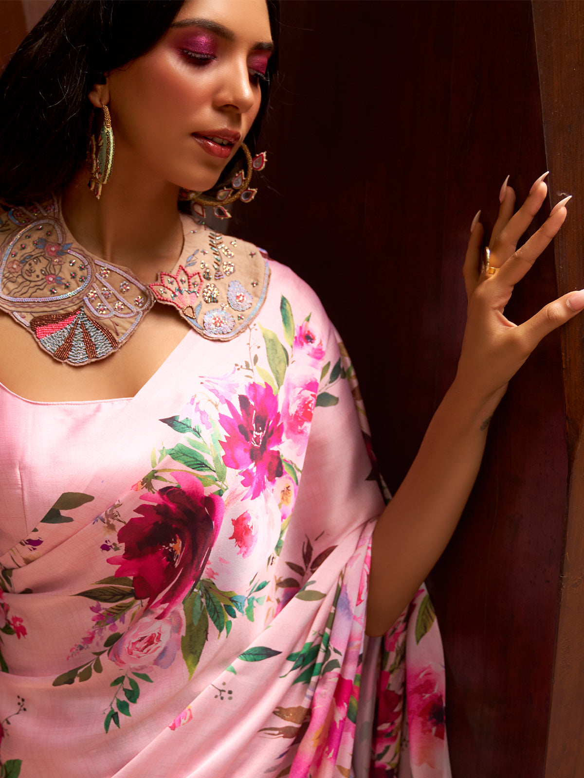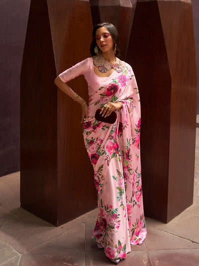 Odette Women Festive Pink Satin Printed Saree With Unstitched Blouse
