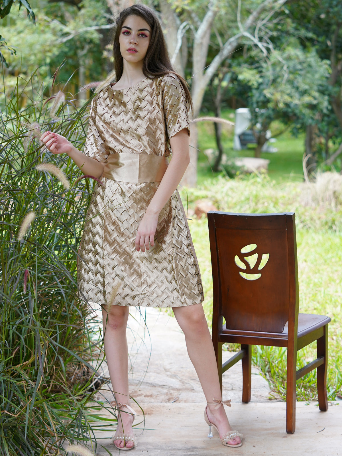 Odette Women Golden Shiny Polyester Satin Self Design Dress