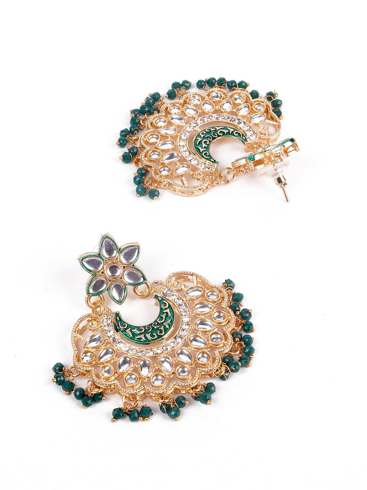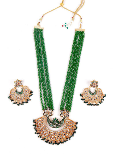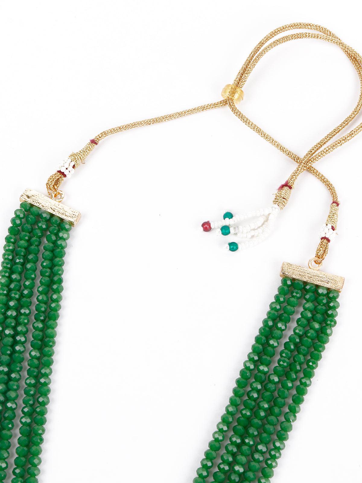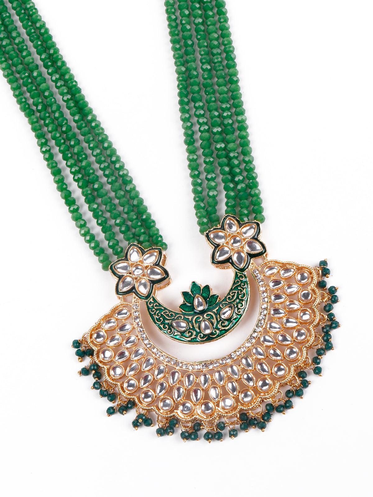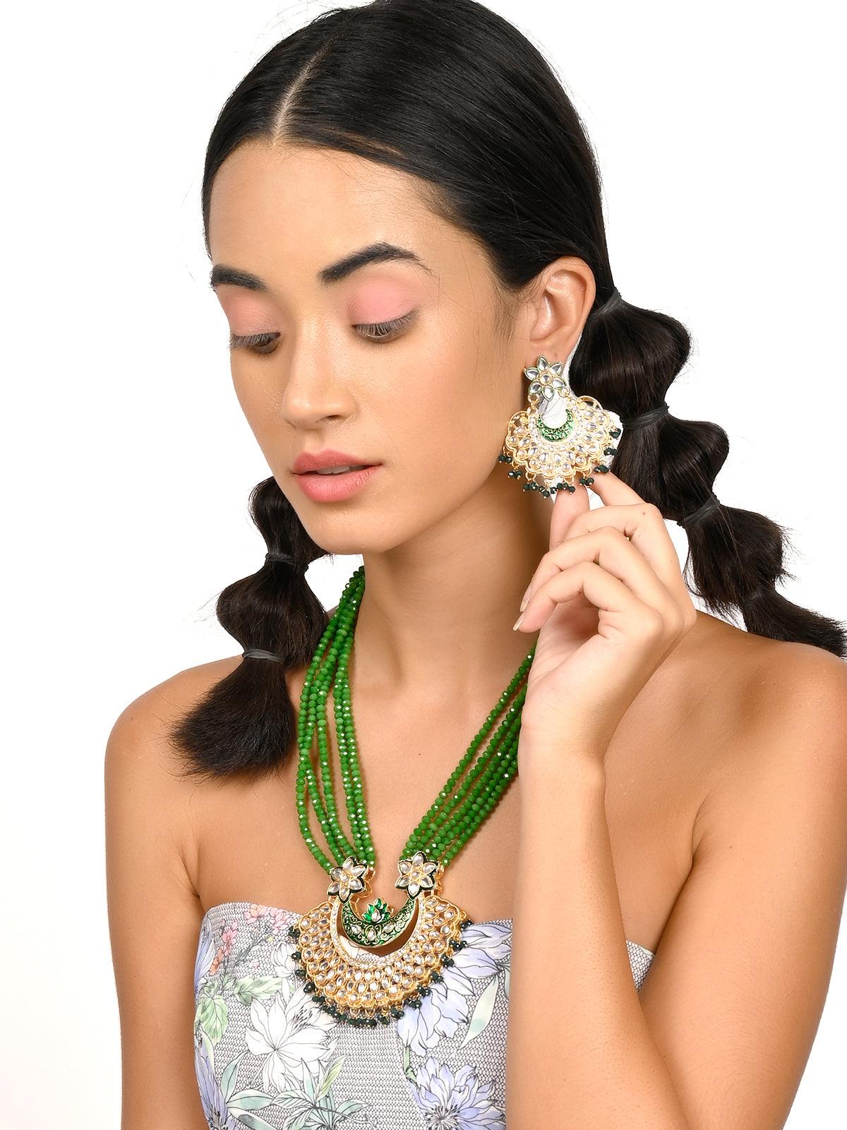 Odette presents this gorgeous necklace set that is embellished with Kundan work and green beads. The necklace looks ethically gorgeous and is sure to compliment all your traditional wear. The set comes with complimenting earrings. The earrings are secured with push-lock closure and the necklace is secured with a drawstring closure.