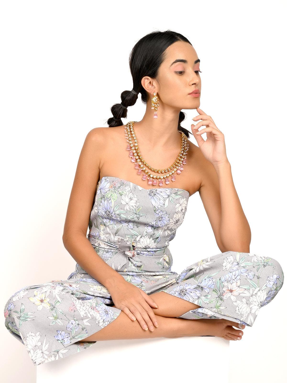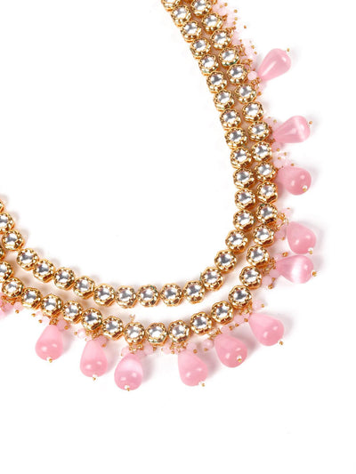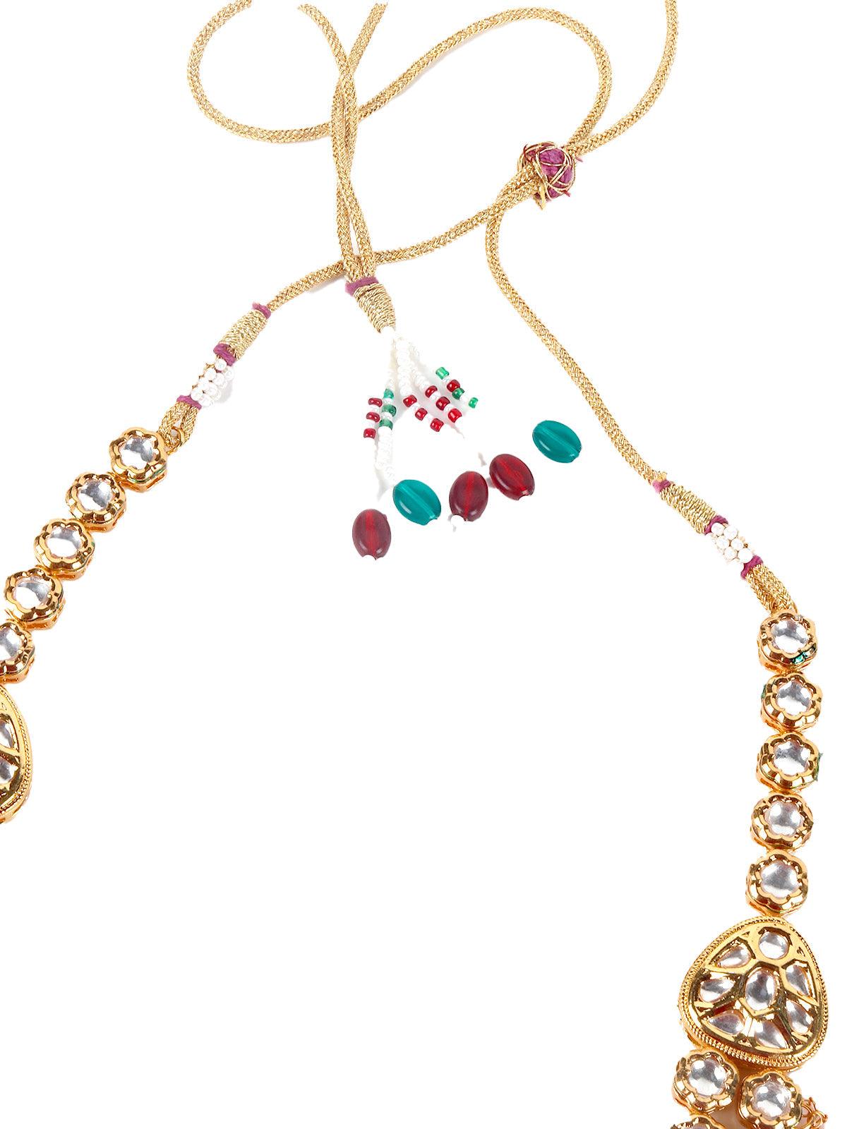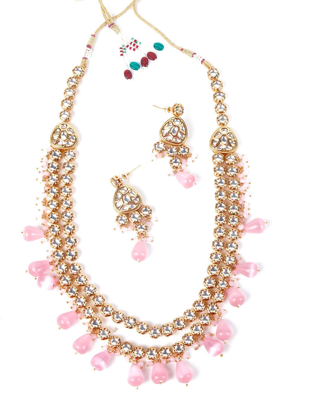 Odette presents this stunning necklace set, the necklace is double layered and looks stunning with artificial diamonds embellished in them. They come with stunning complimenting earrings. The necklace is secured with a drawstring closure and the earrings are secured with a push back closure fastening.