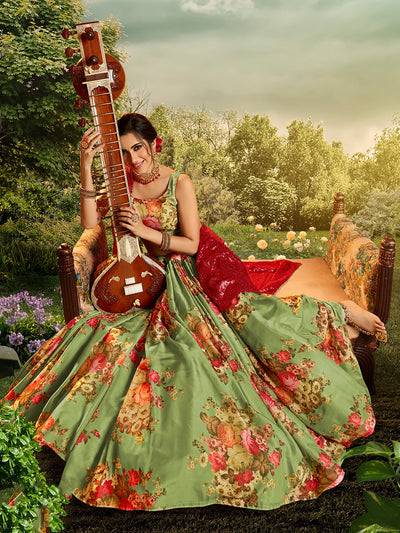 Odette Women Green Elegant Semi Stitched Lehenga With Unstitched Blouse