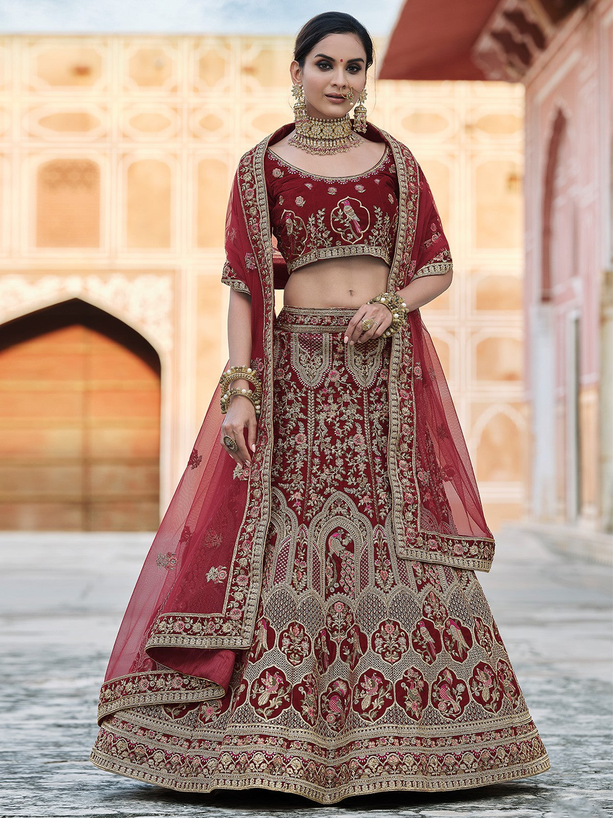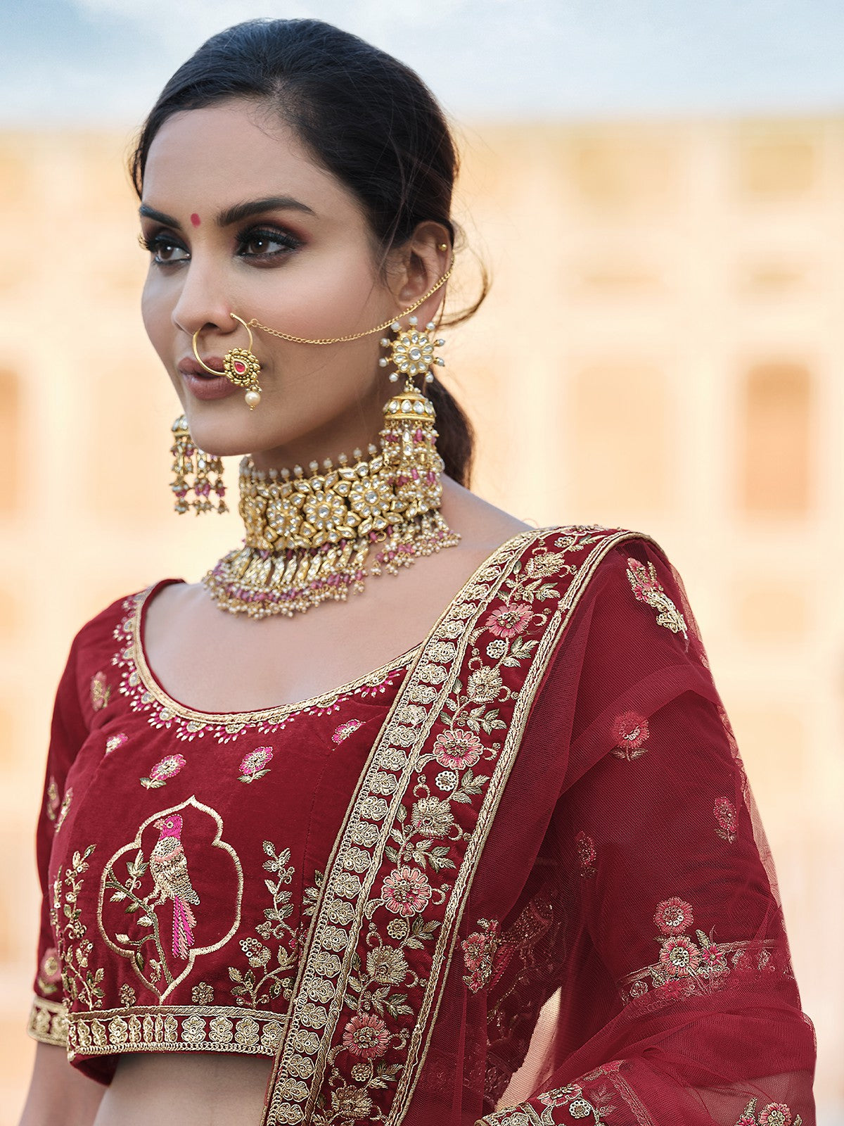 Add light to the celebration called life beaming in this lehenga, choli and dupatta set. Crafted on Velvet, the set is beautified with Hand Work and Embroidery.