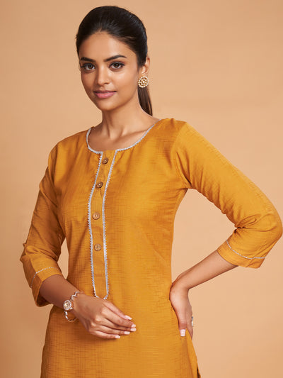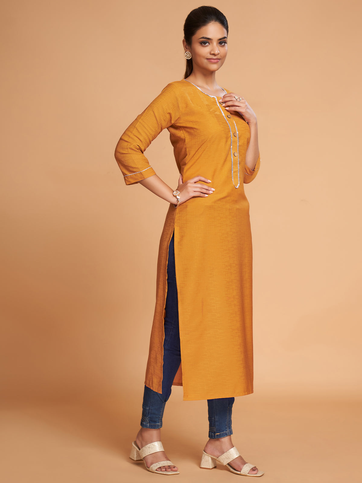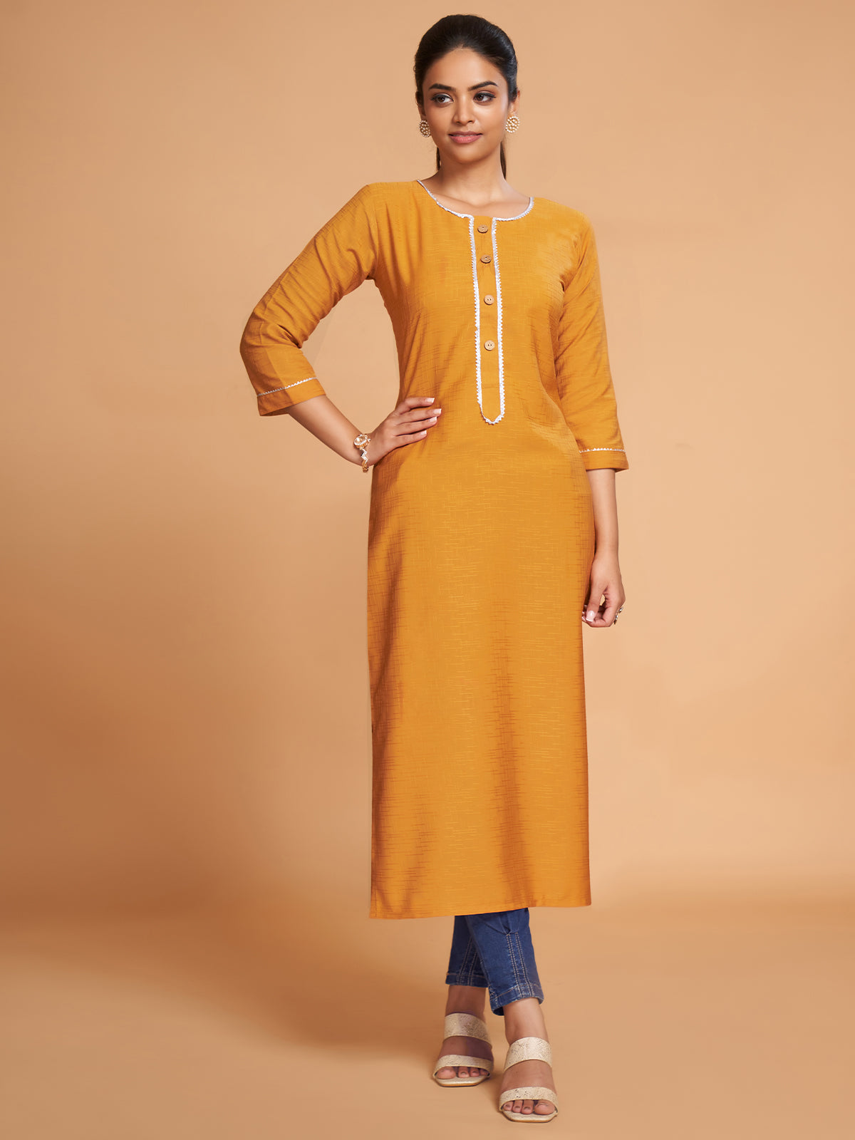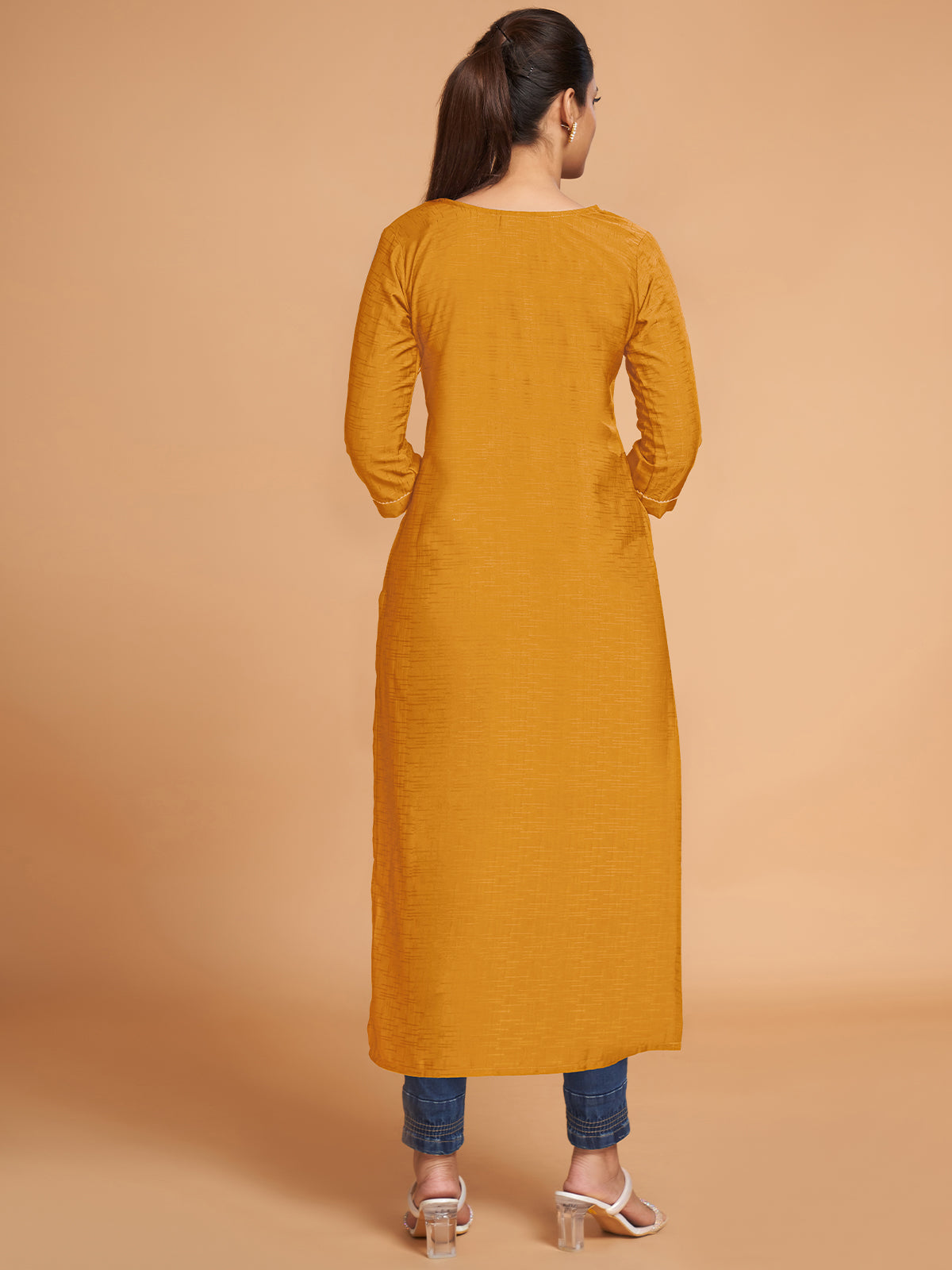Flaunt a the casual look with this staright cut kurta with pattern at the neck. This silk blend suit makes a comfortable evening wear, office wer and dailywear. Team it with stylish accessories to make your looks more beautiful.