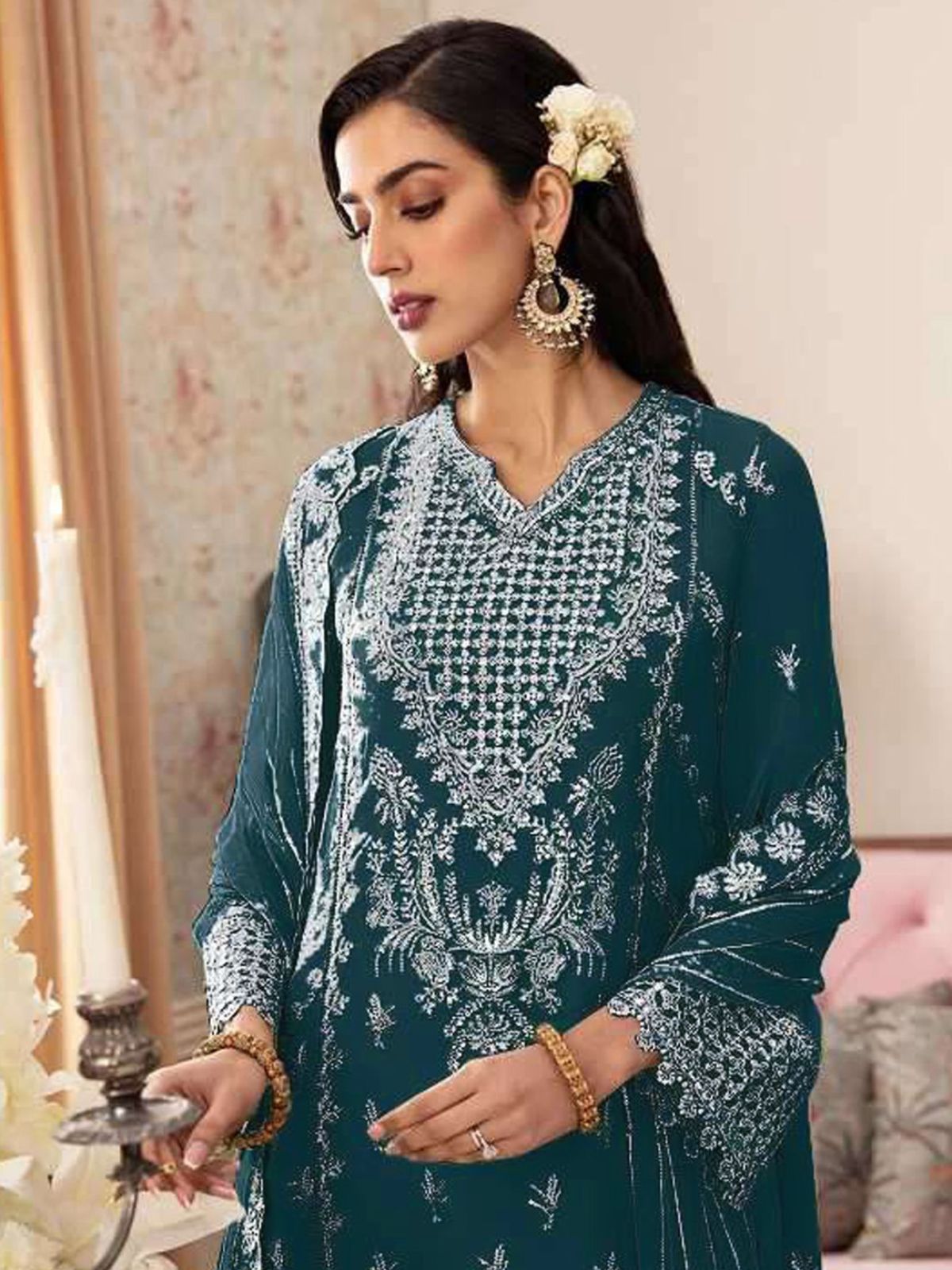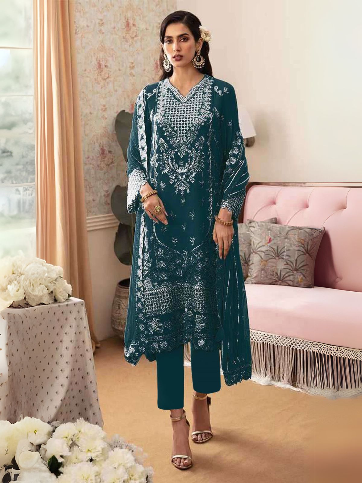 Odette Aqua Blue Georgette Embroidered Semi-Stitched Kurta Set For Women