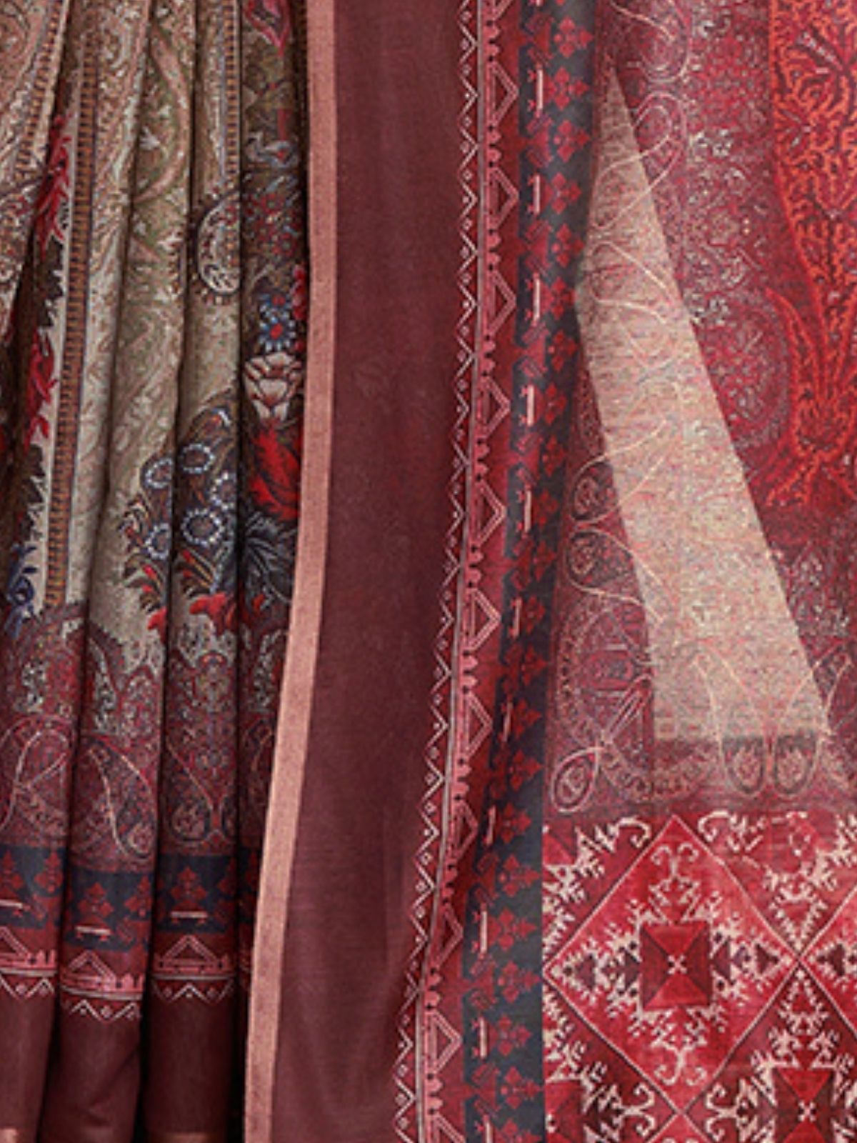 Odette Beige And Maroon Linen Printed Saree With Unstitched Blouse For Women