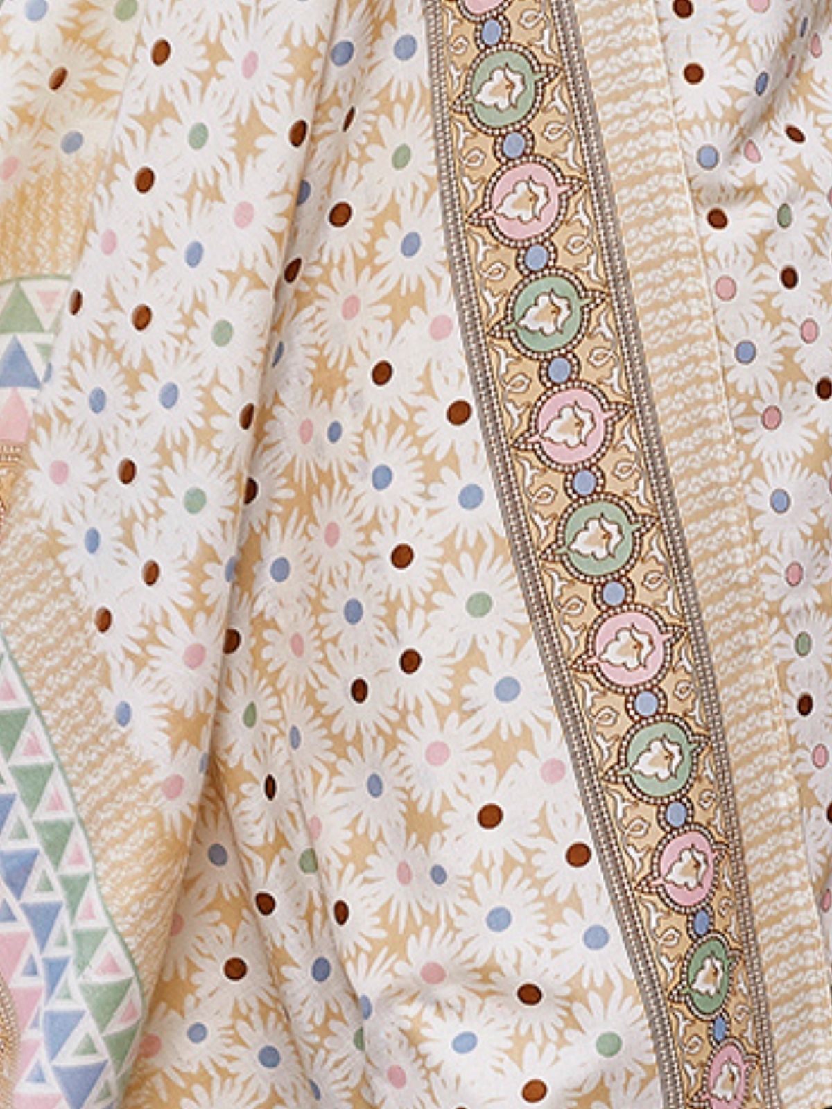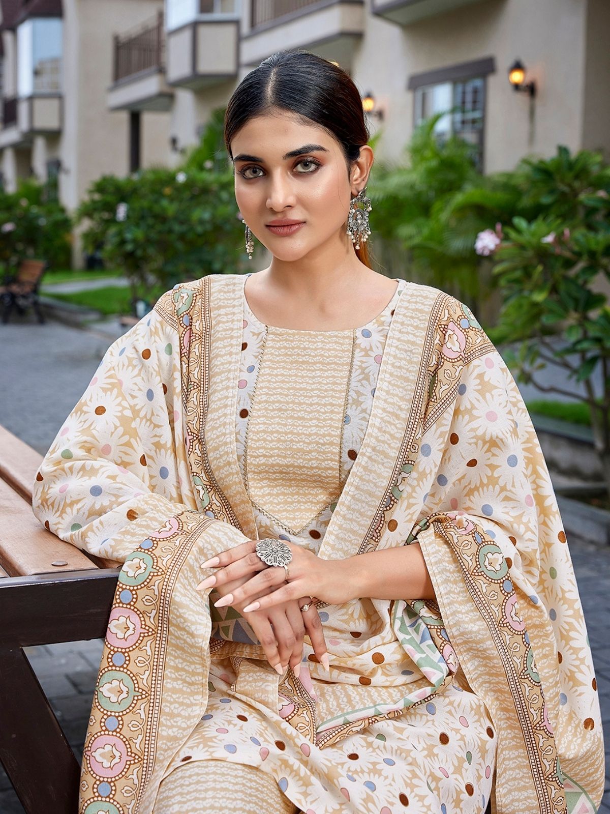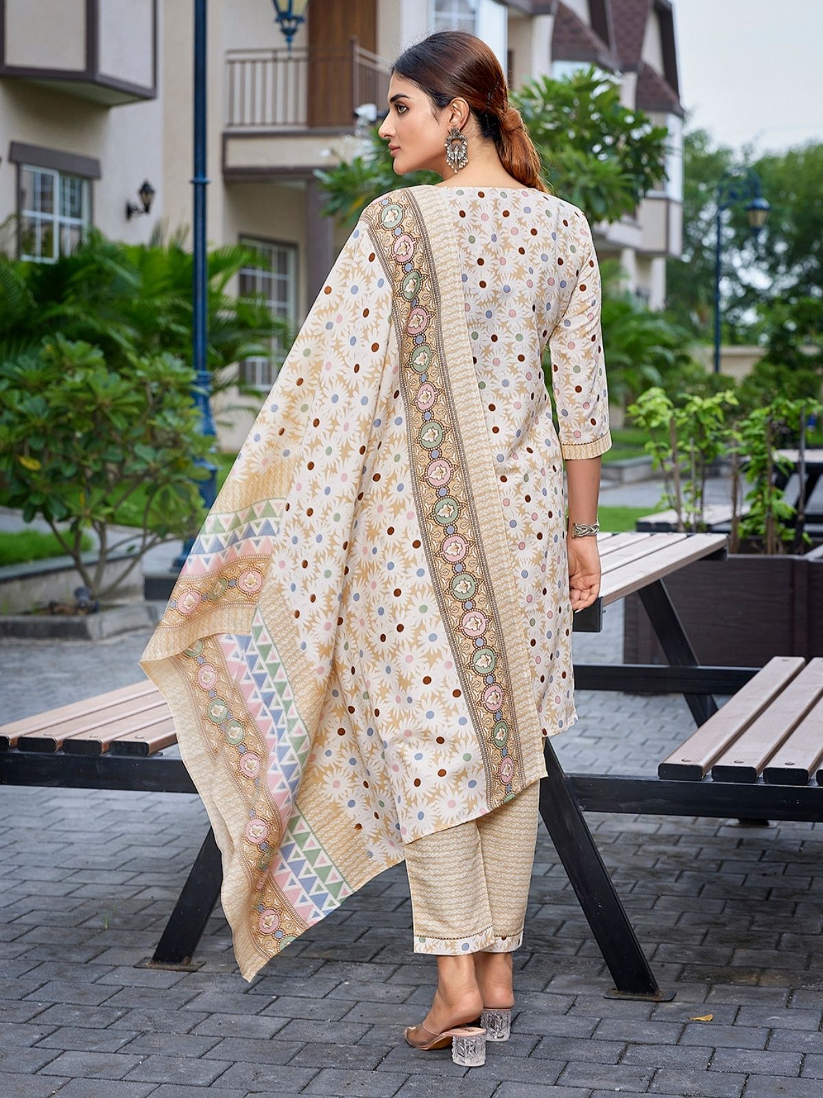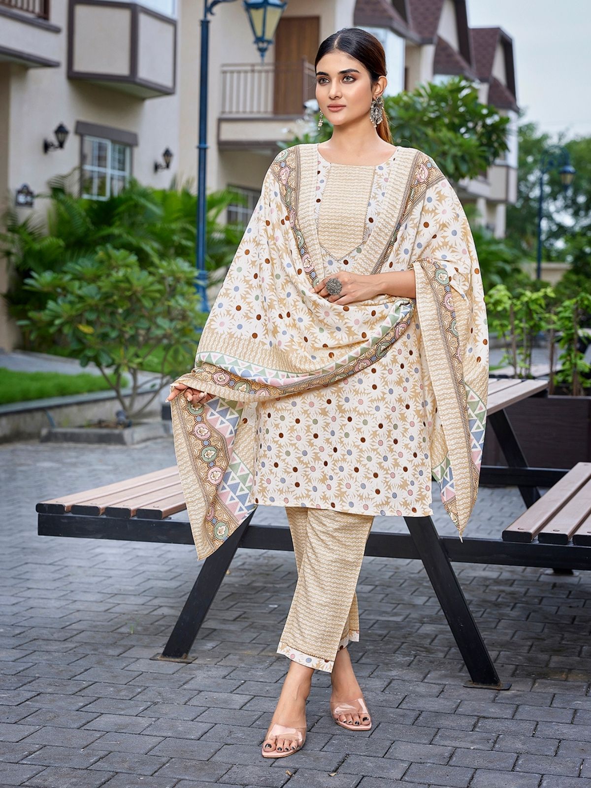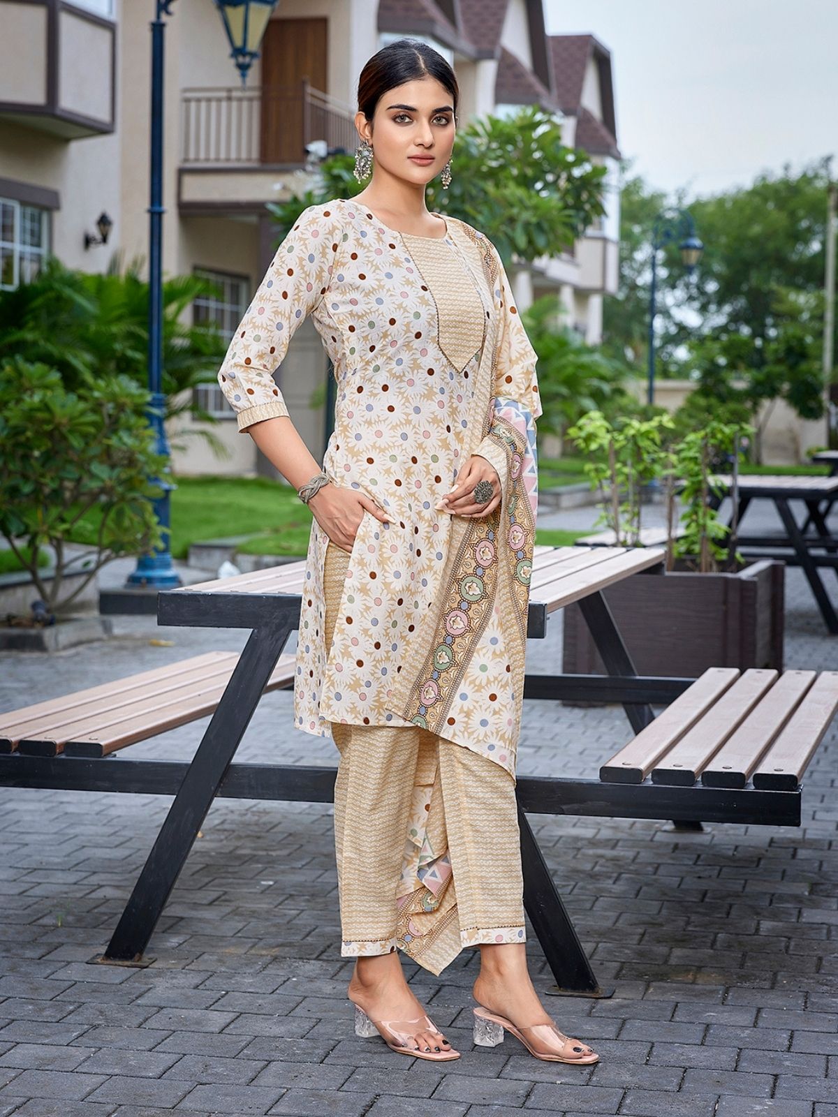 Odette Beige Cotton Blend Printed Stiched Kurta Set For Women