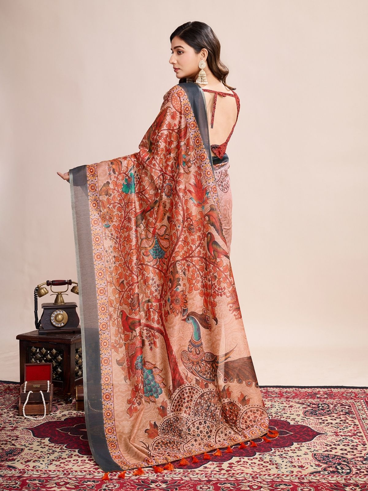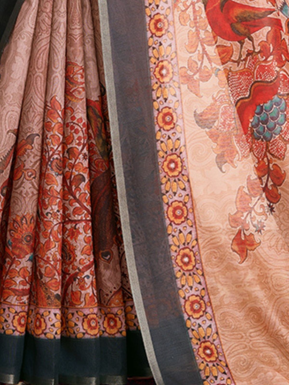 Odette Beige Linen Printed Saree With Unstitched Blouse For Women