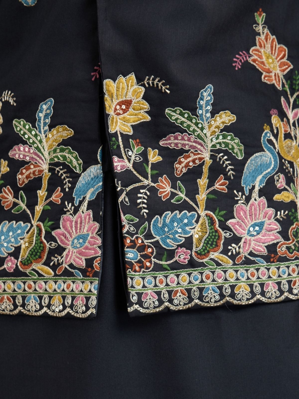 Odette Black Cotton Blend Embroidered Stitched Kurta For Men