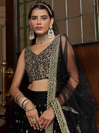 Odette Black Embroidered Soft Net Semi Stitched Lehenga With Blouse For Women