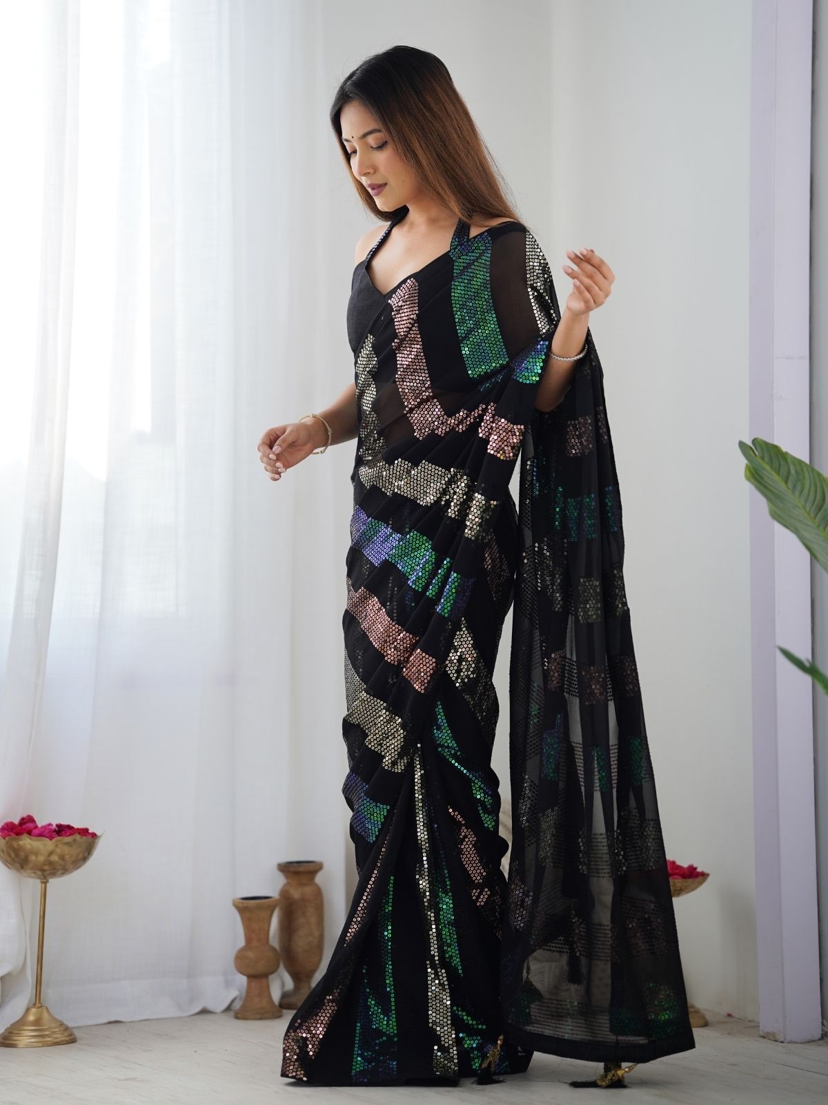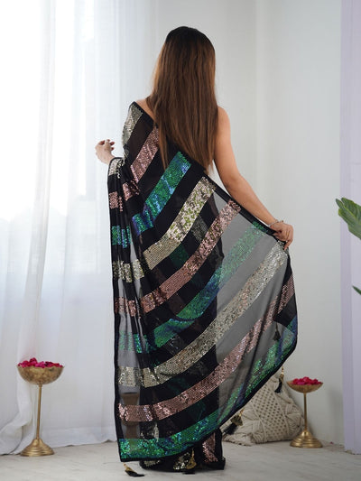 Odette Black Georgette Embellished Saree With Unstitched Blouse For Women