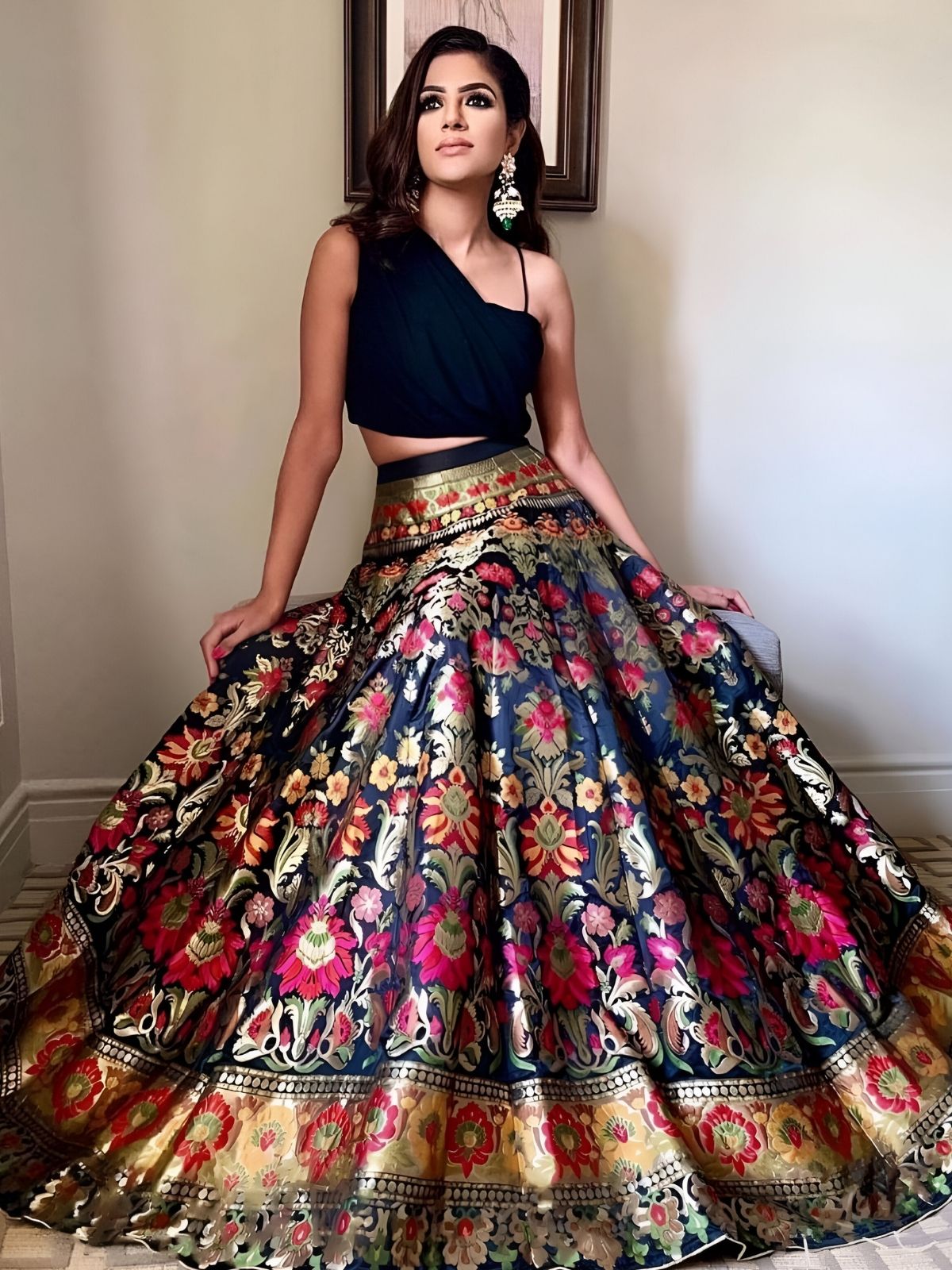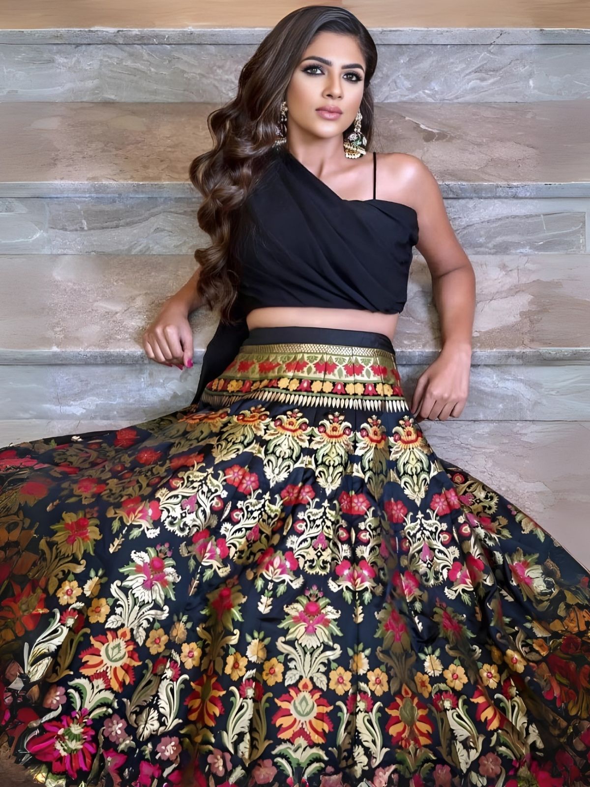 Odette Black Jacquard Silk Woven Semi-Stitched Lehenga For Women