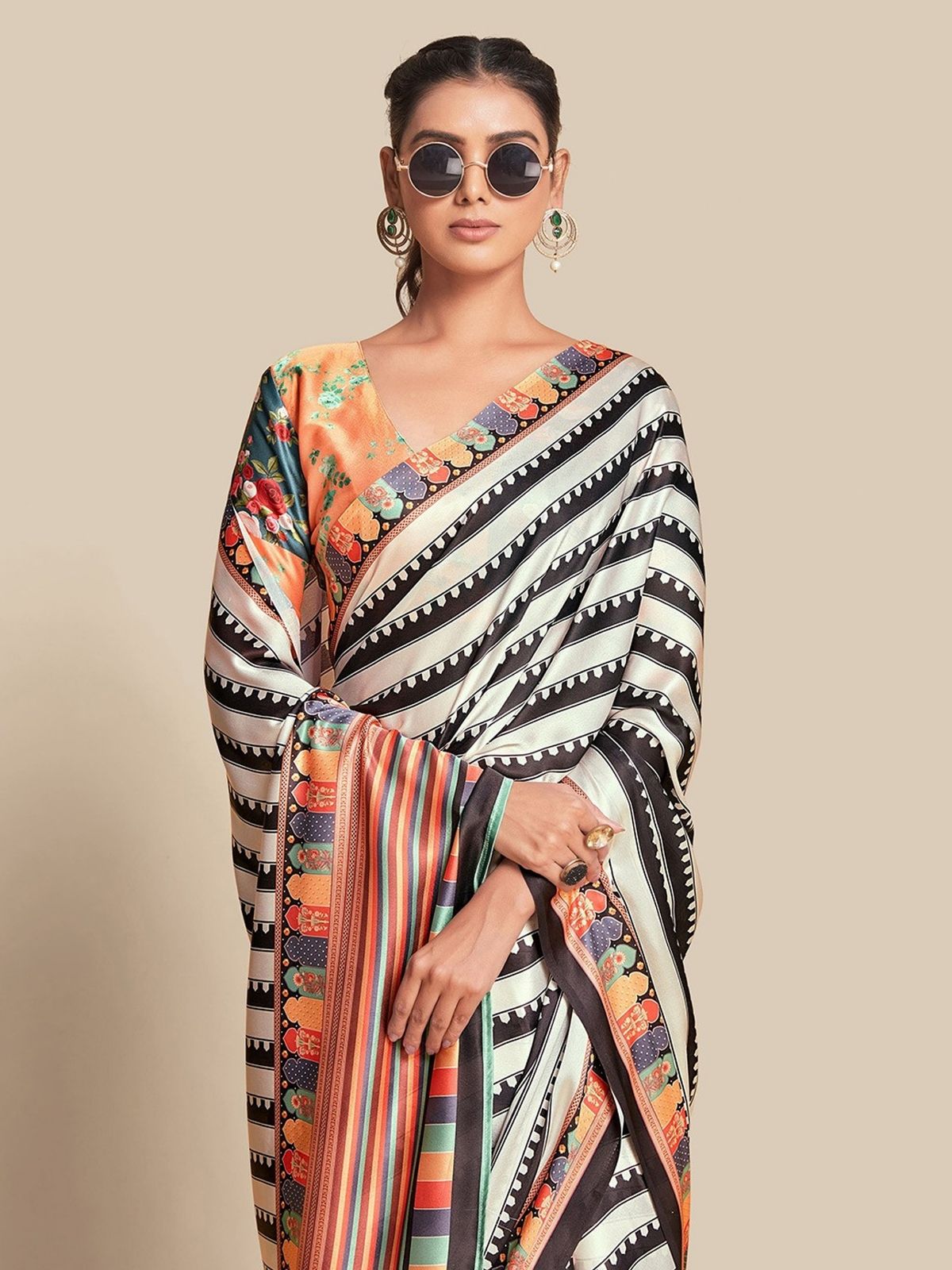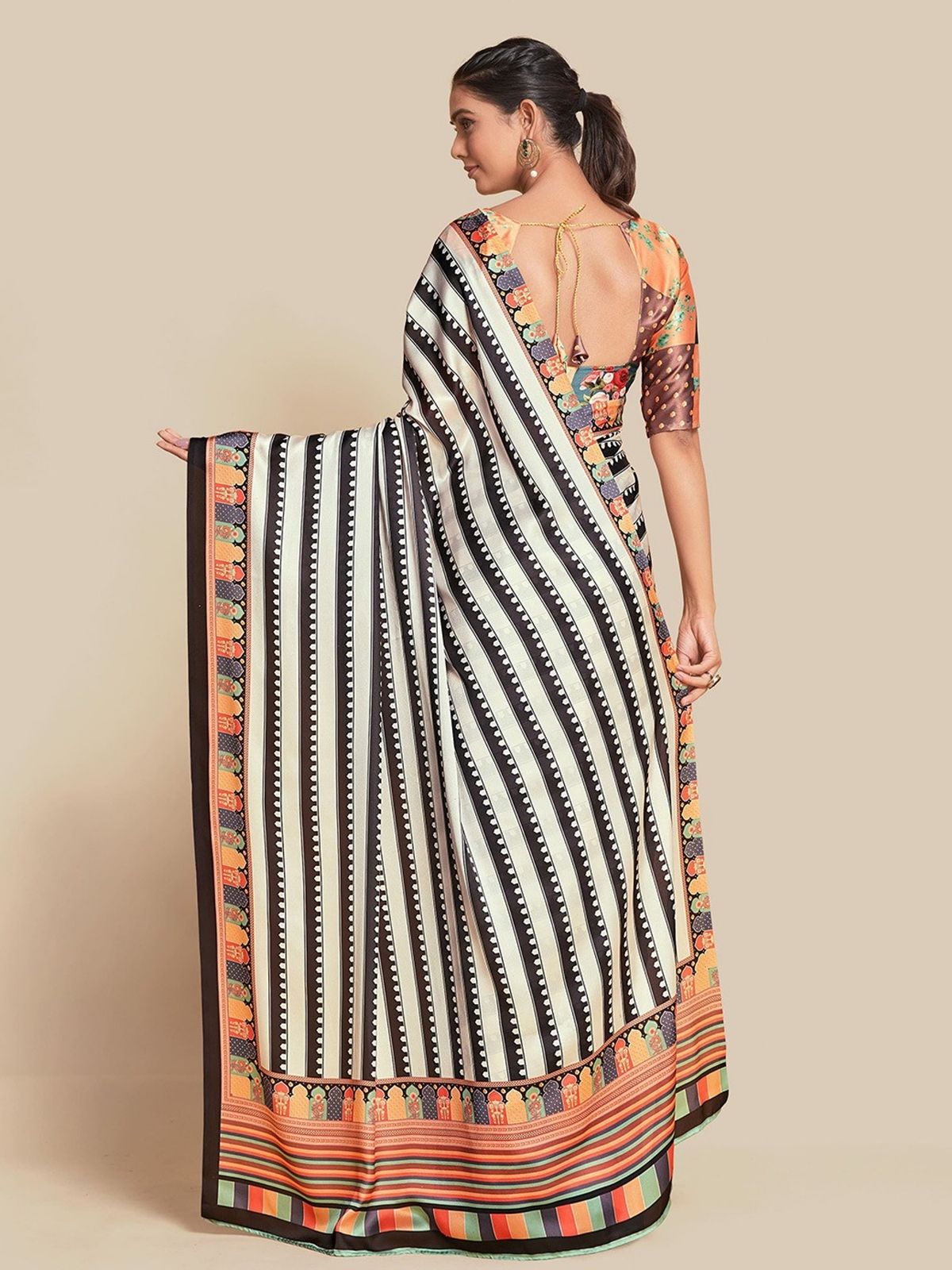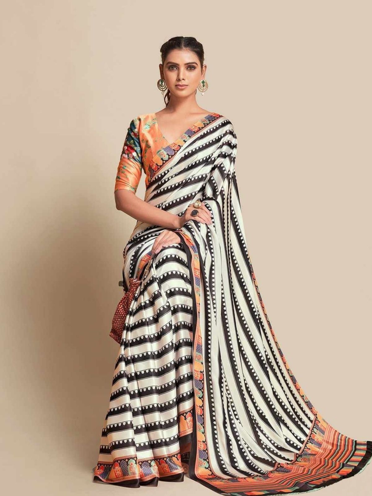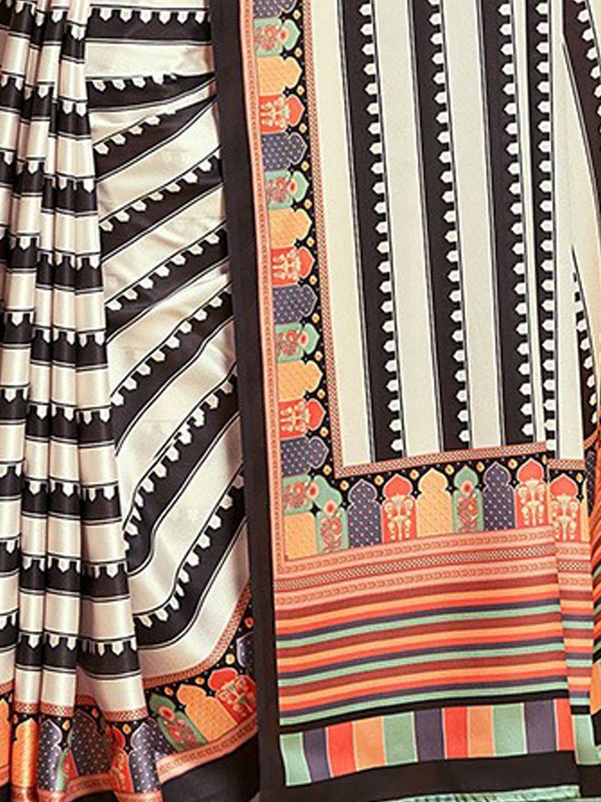 Odette Black & White Georgette Striped Saree With Unstitched Blouse For Women