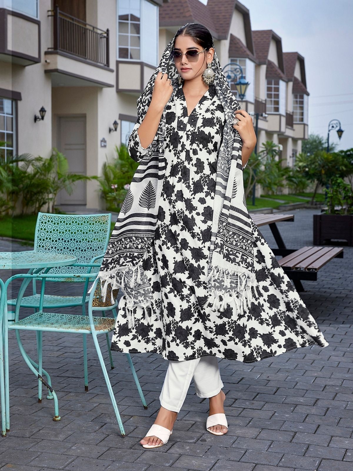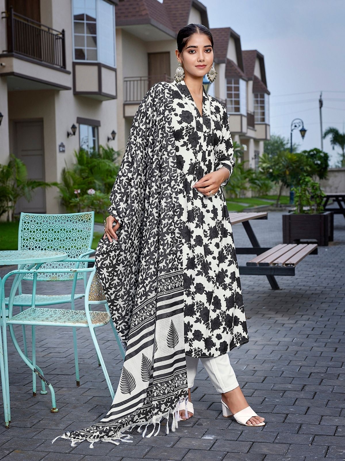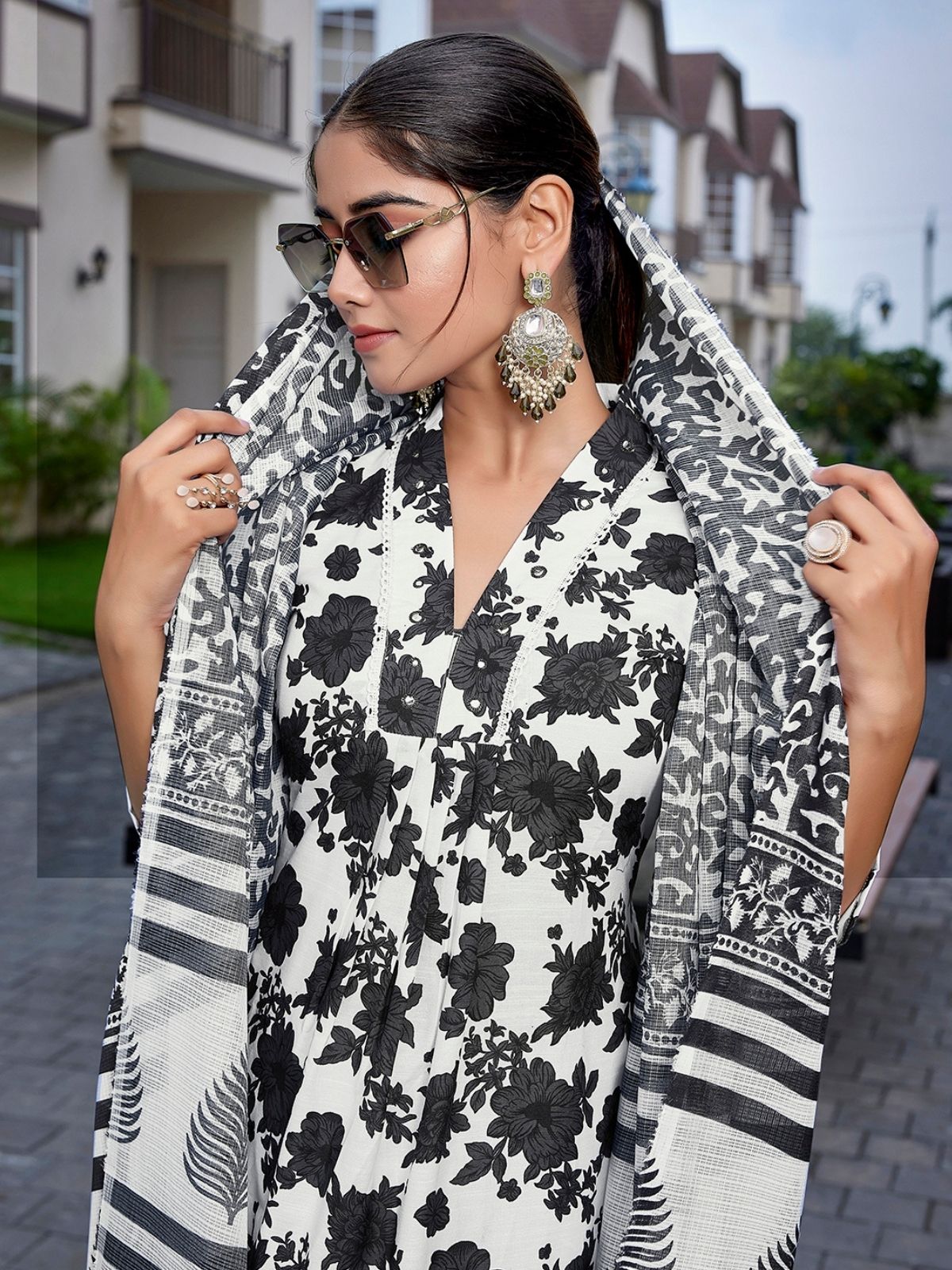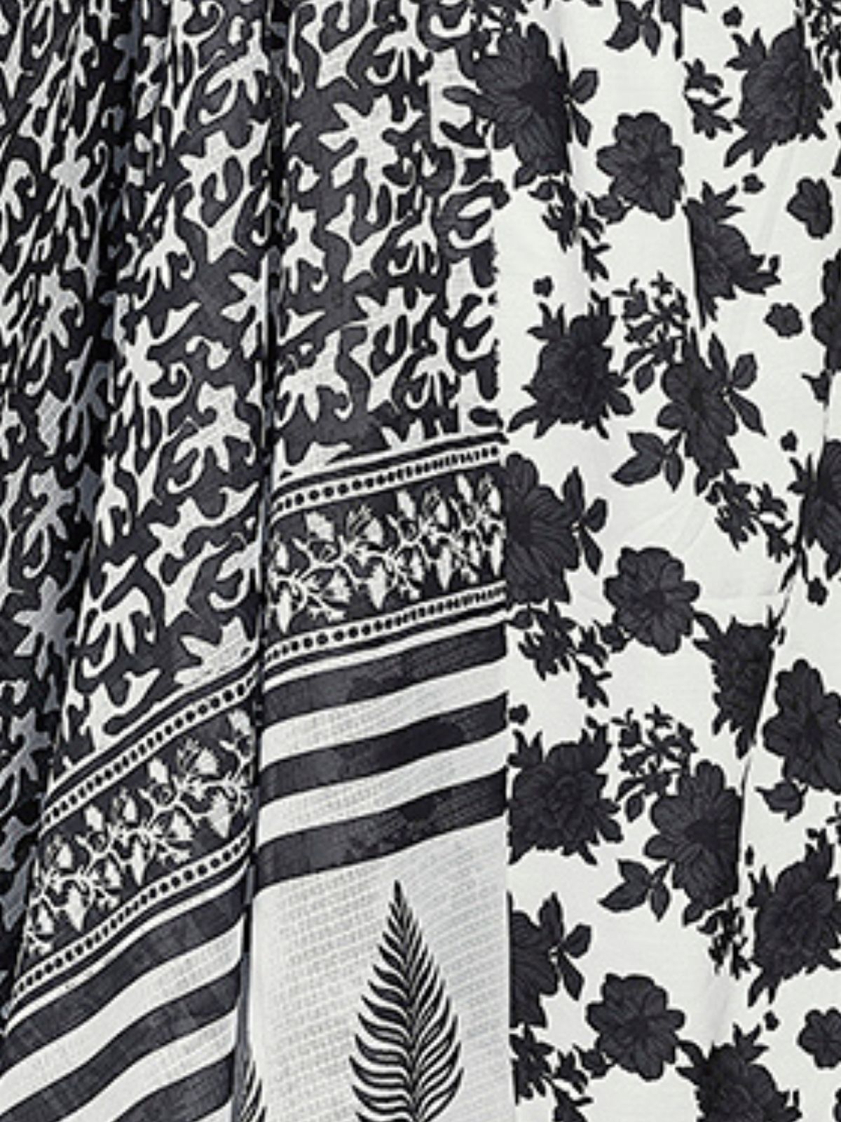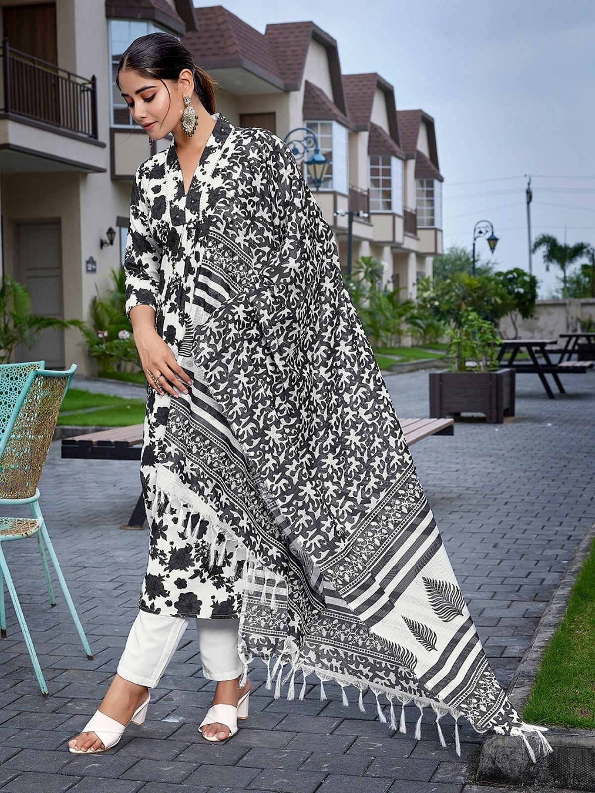 Odette Black & White Viscose Printed Stiched Kurta Set For Women