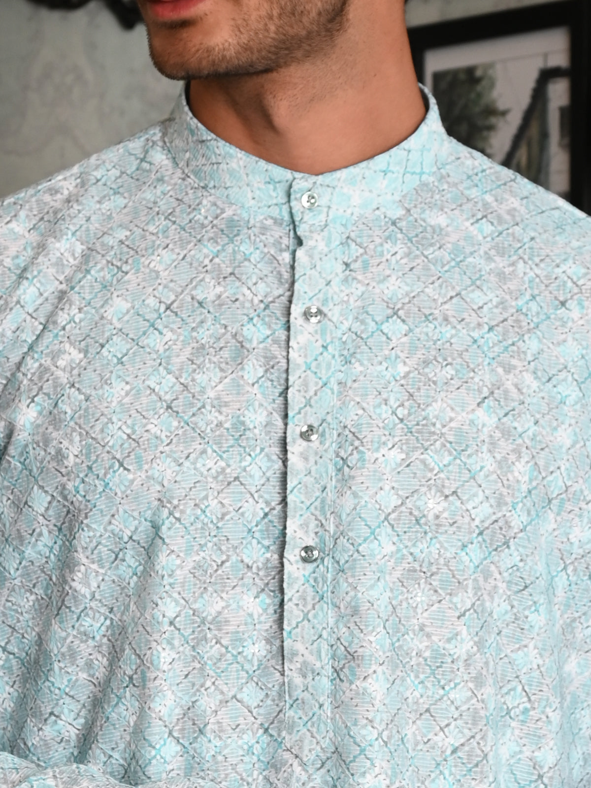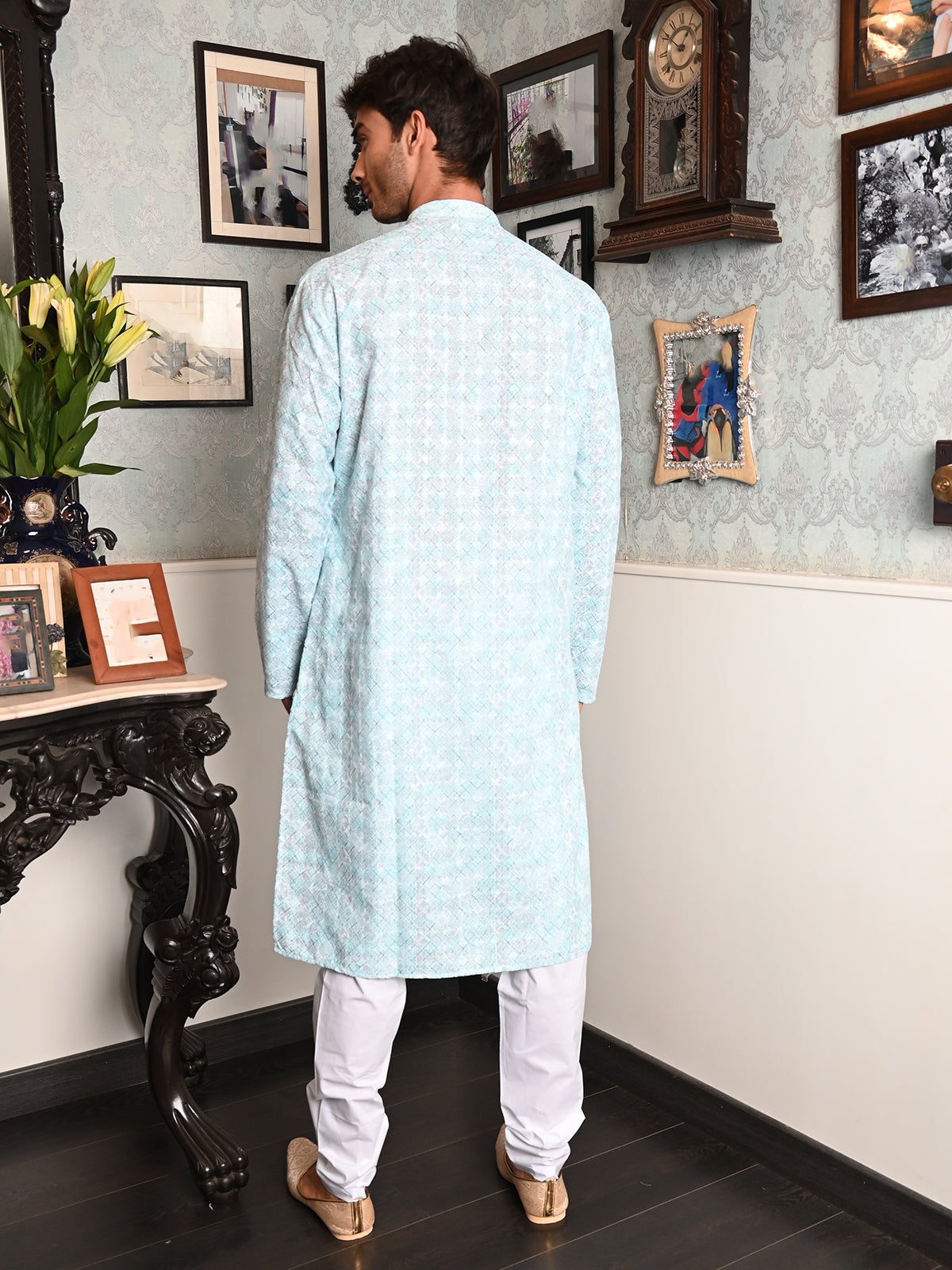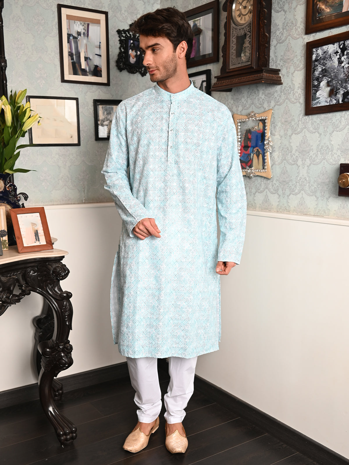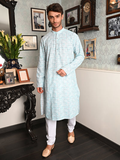 Odette Blue Embroidered Cotton Traditional Kurta Set For Men