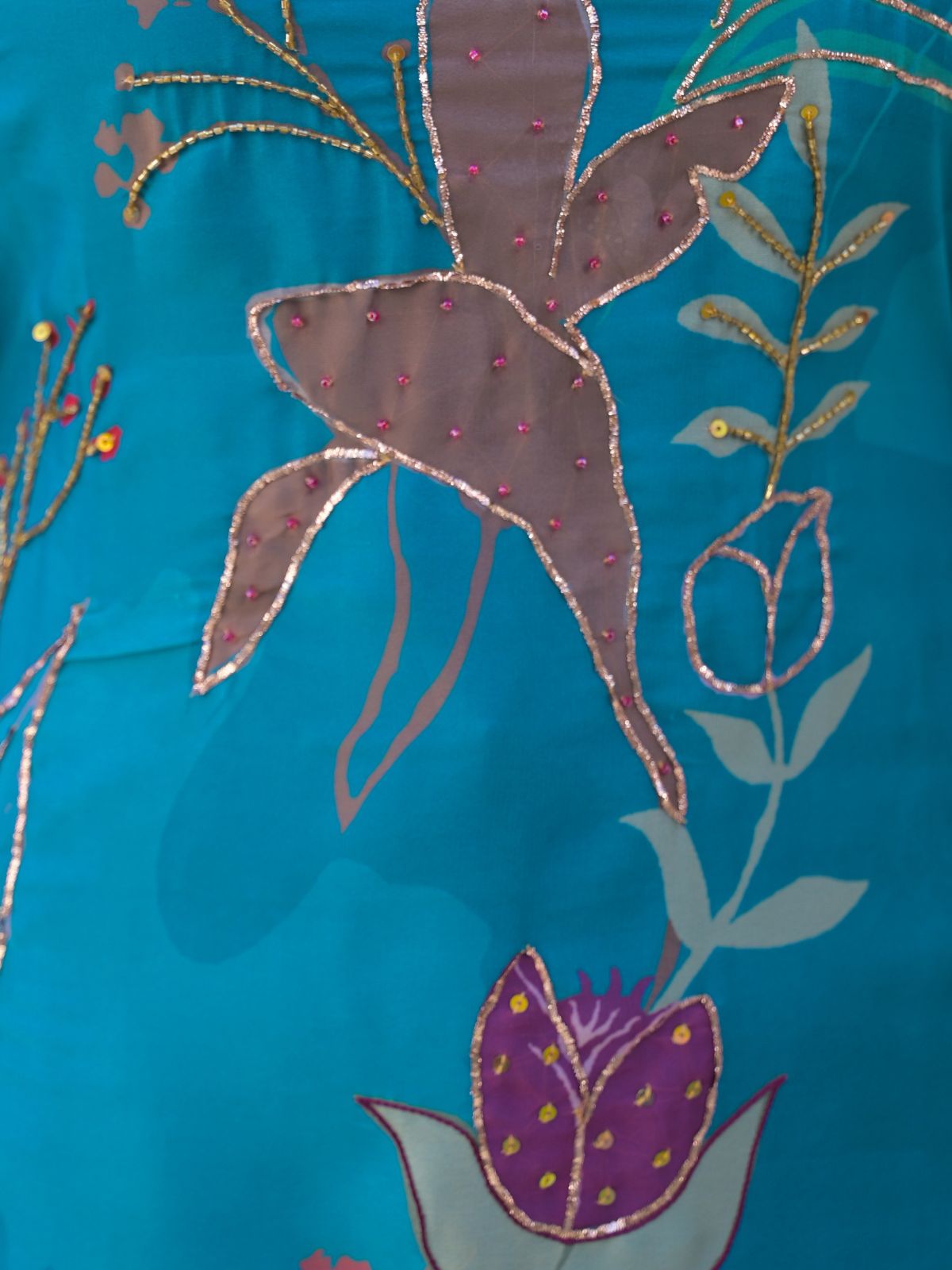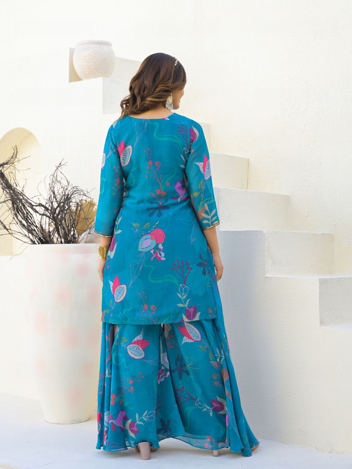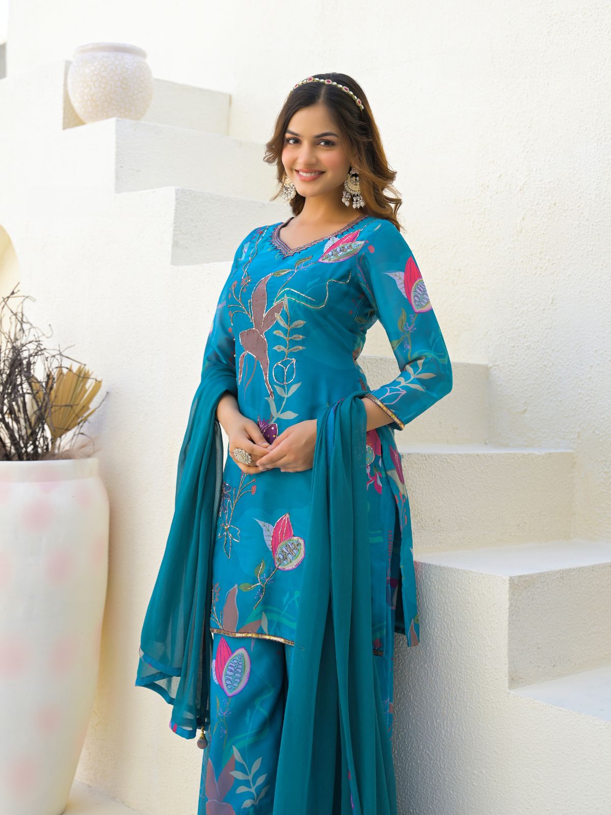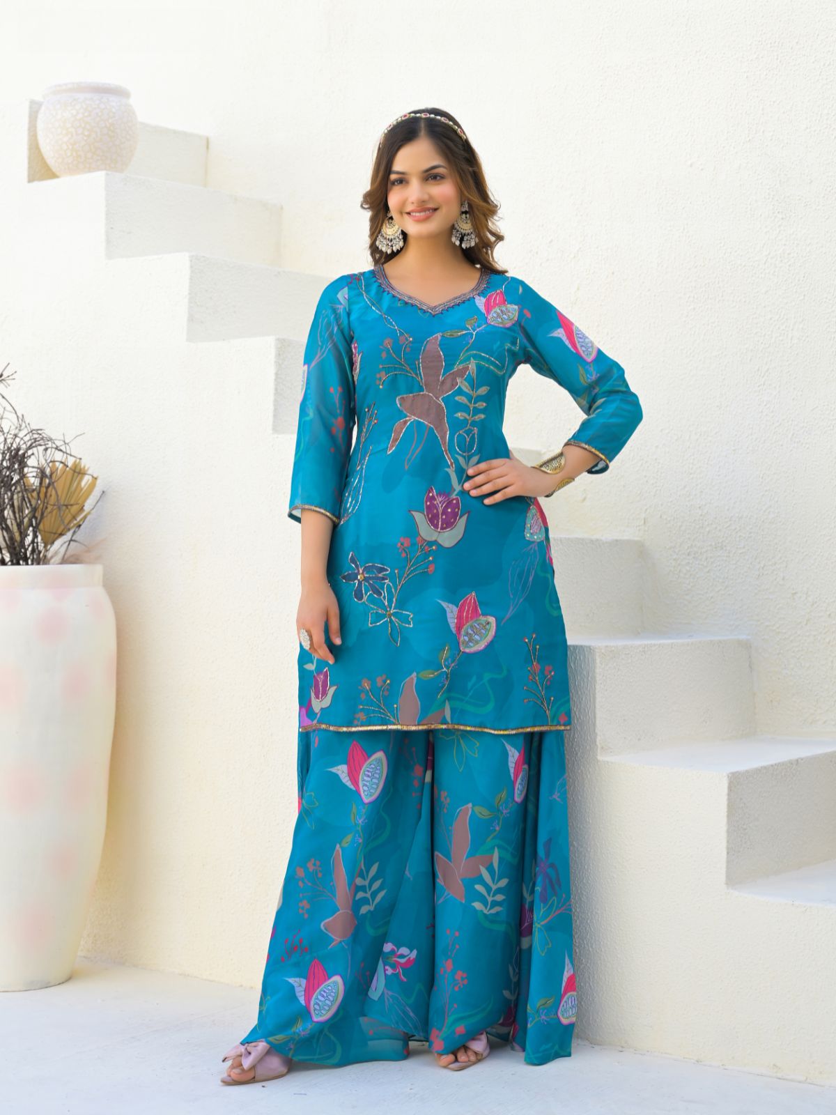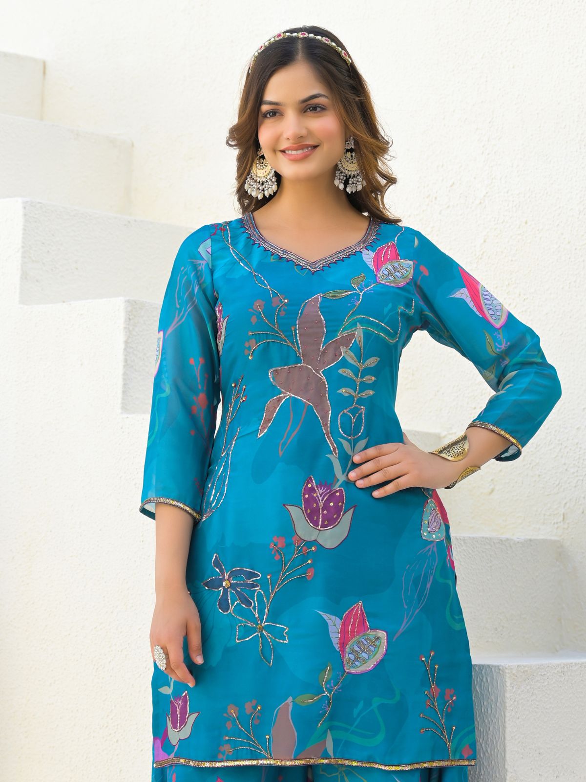 Odette Blue Georgette Embellished Stiched Kurta Set For Women