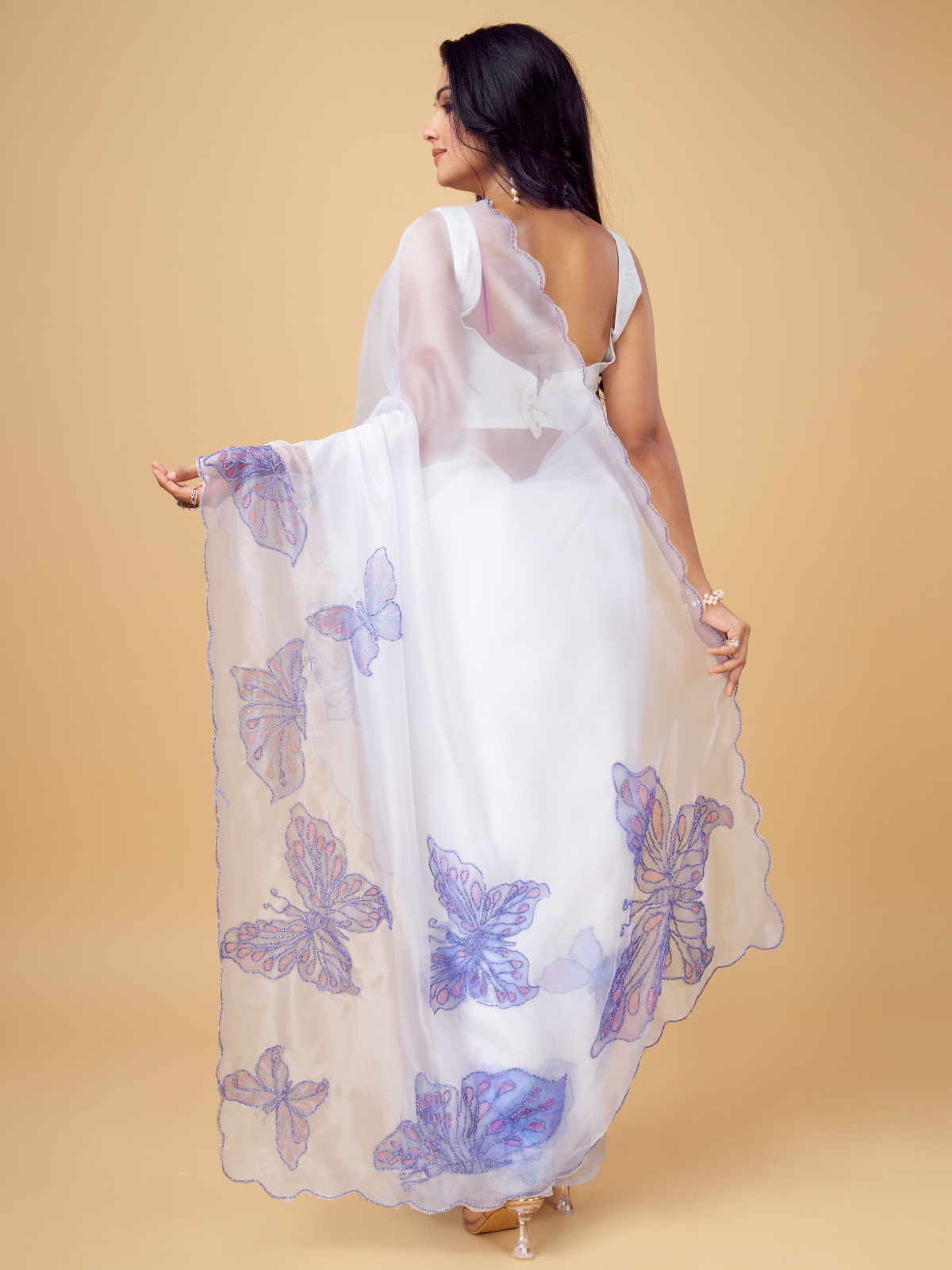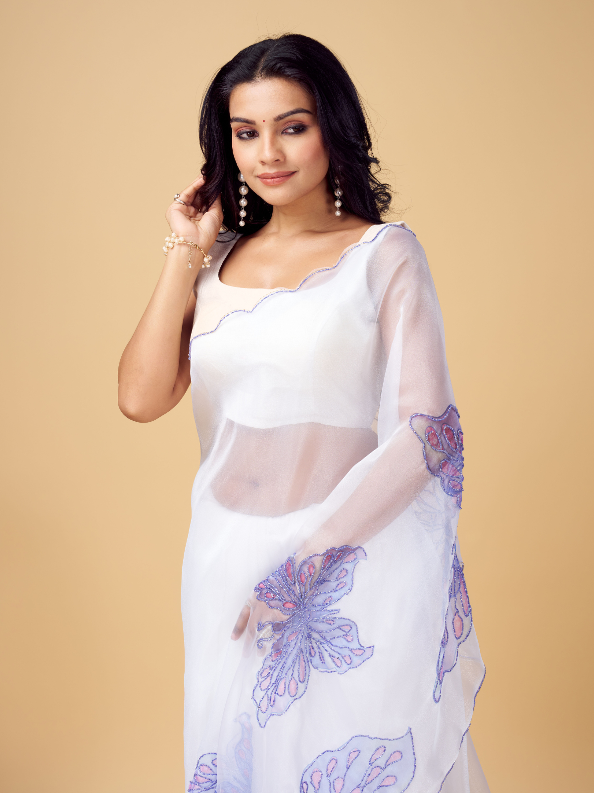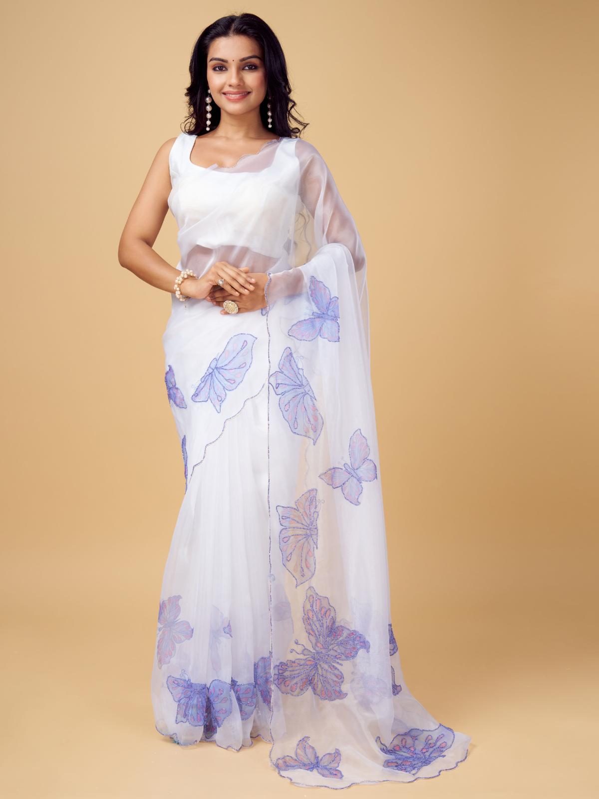 Odette White and Blue Organza Printed Saree With Unstitched Blouse For Women