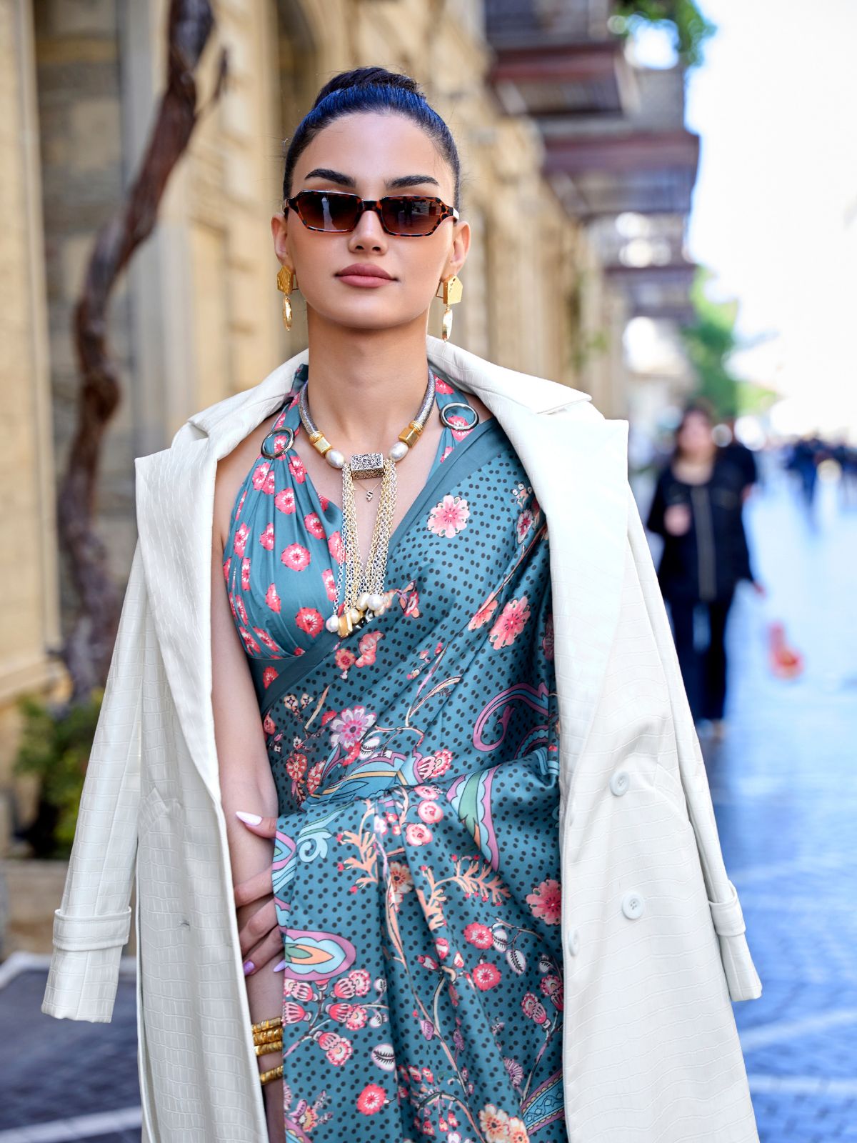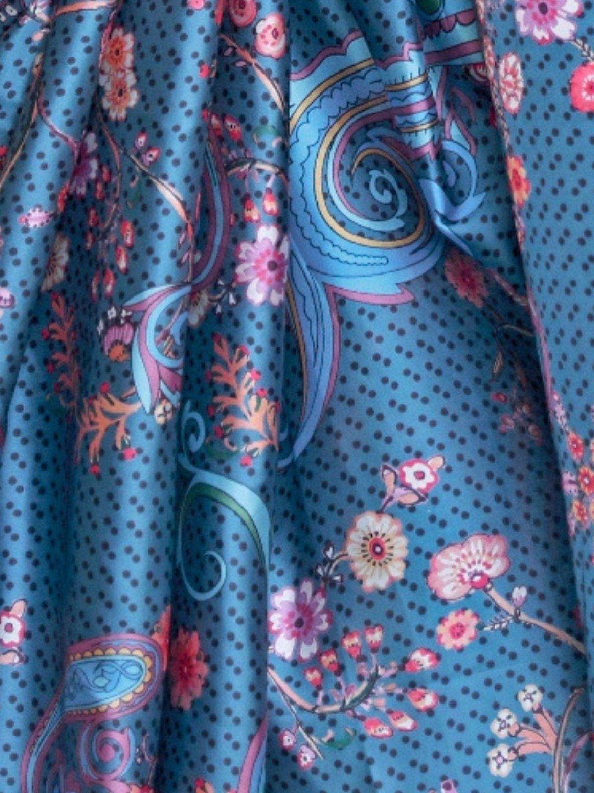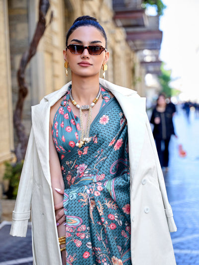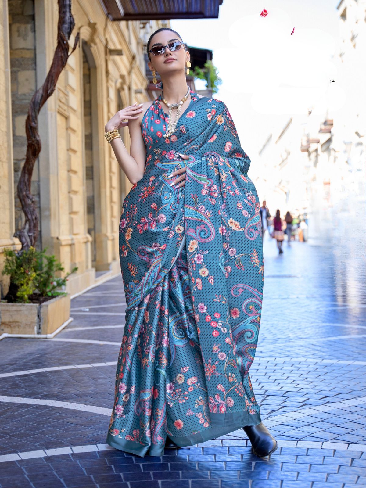 Odette Blue Satin Printed Saree With Unstitched Blouse For Women