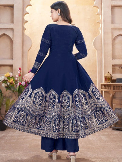 Odette Blue Silk Blend Embroidered Stitched Kurta Set For Women