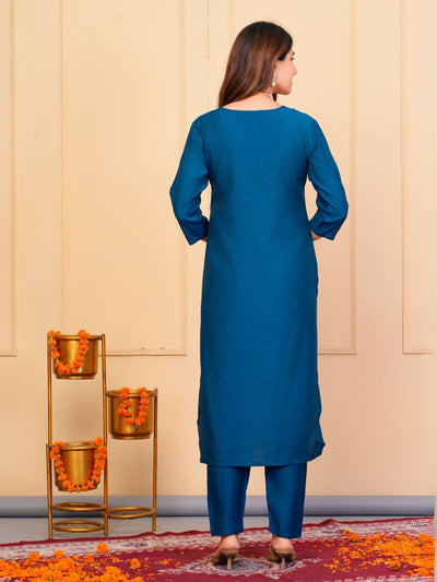 Odette Blue Viscose Embroidered Stitched Kurta Set For Women