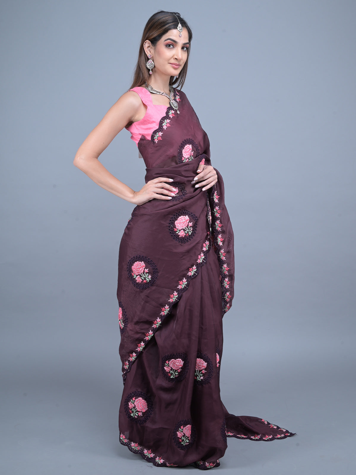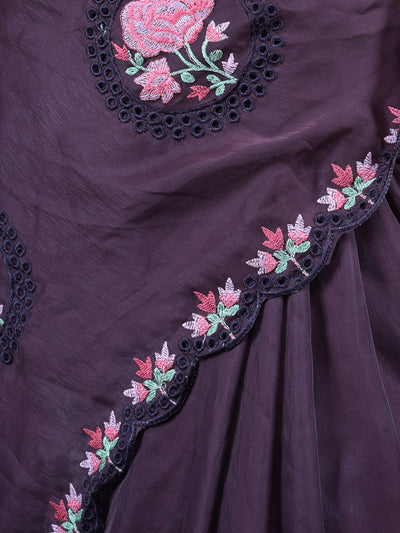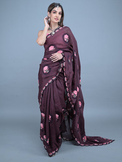 Odette Brown Floral Embroidered Georgette Saree with Unstitched Blouse for Women