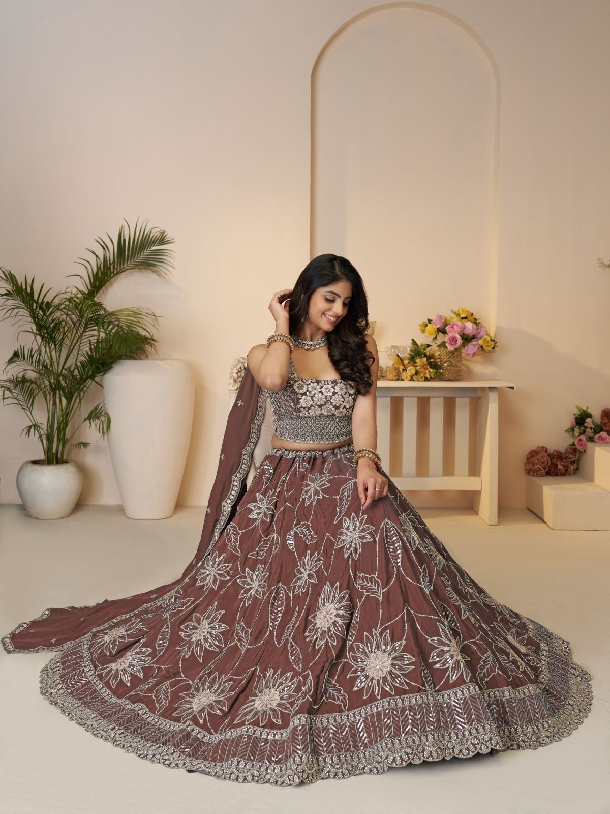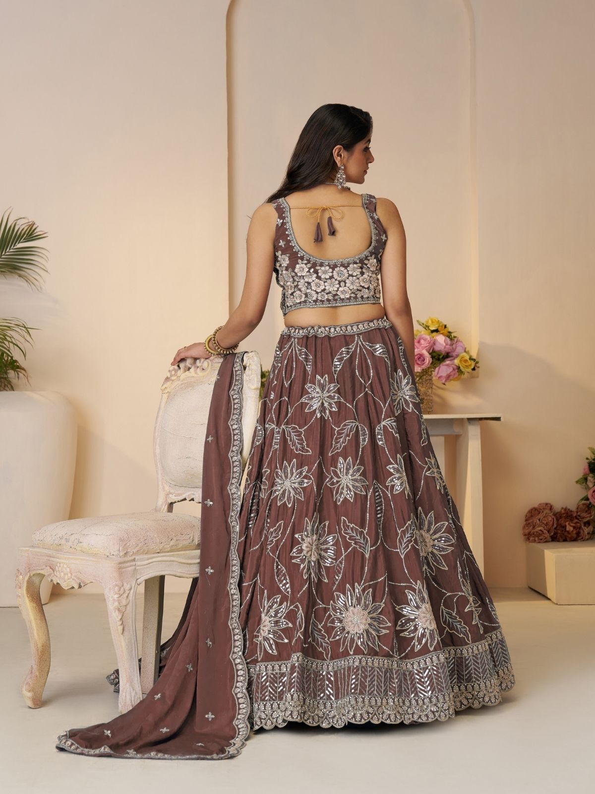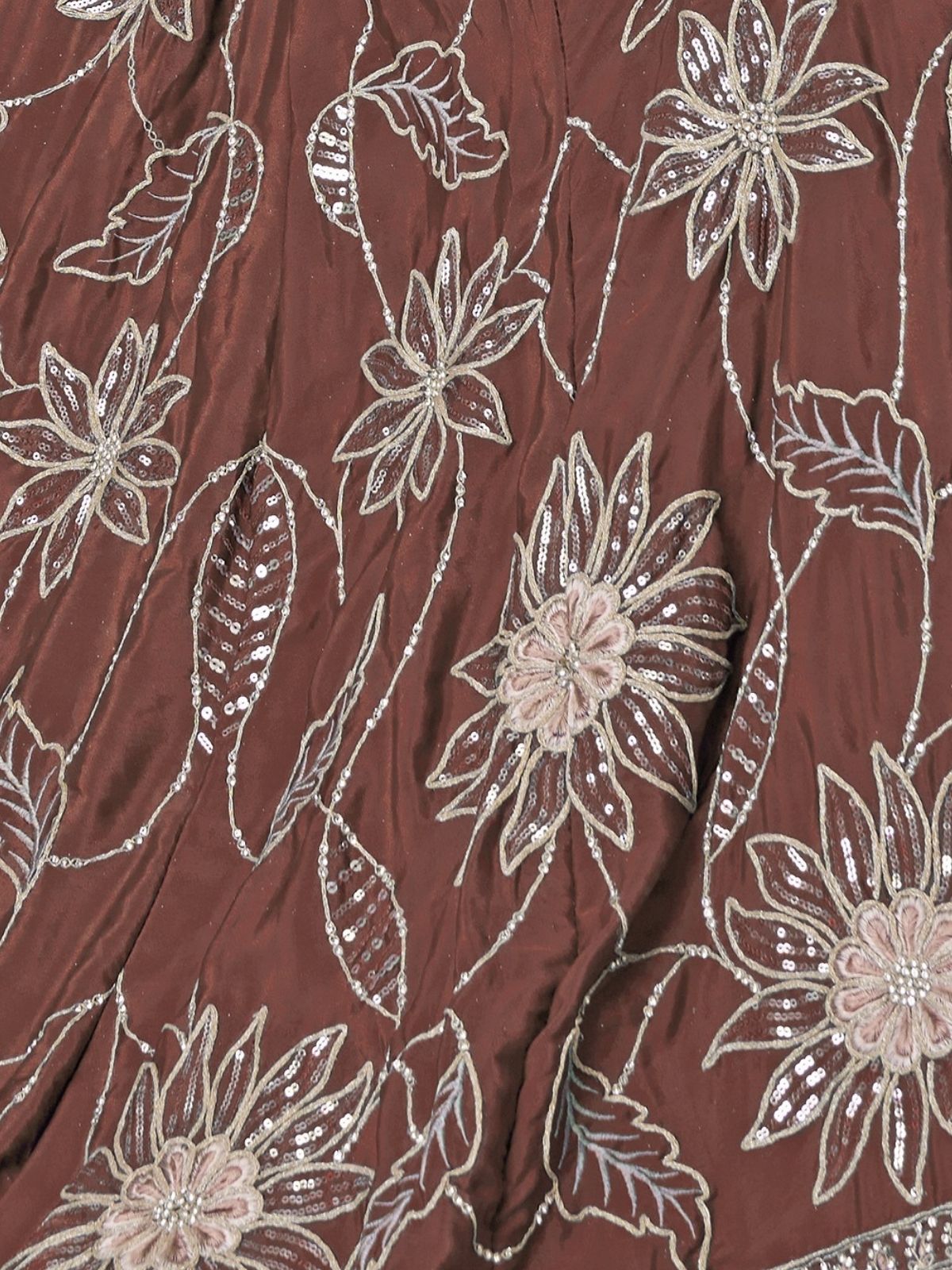 Odette Brown Silk Blend Embroidered Semi-Stitched Lehenga For Women