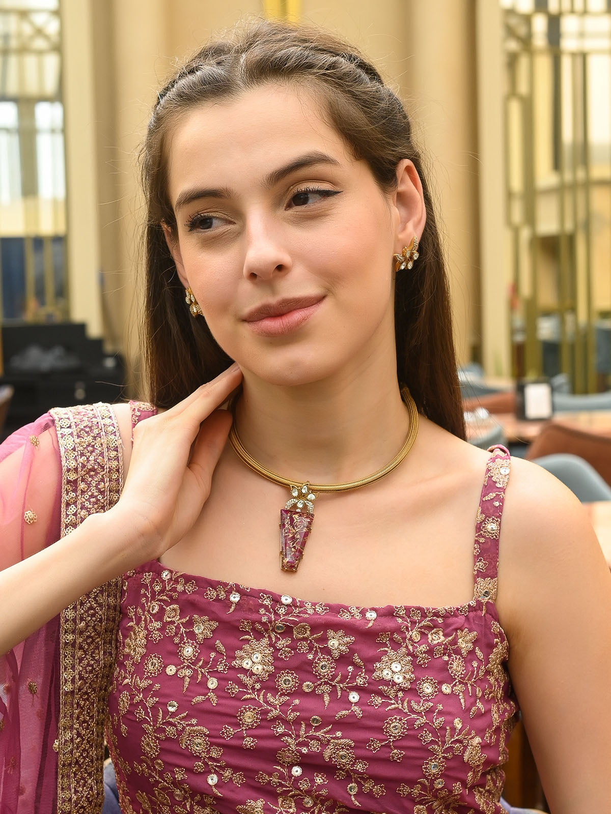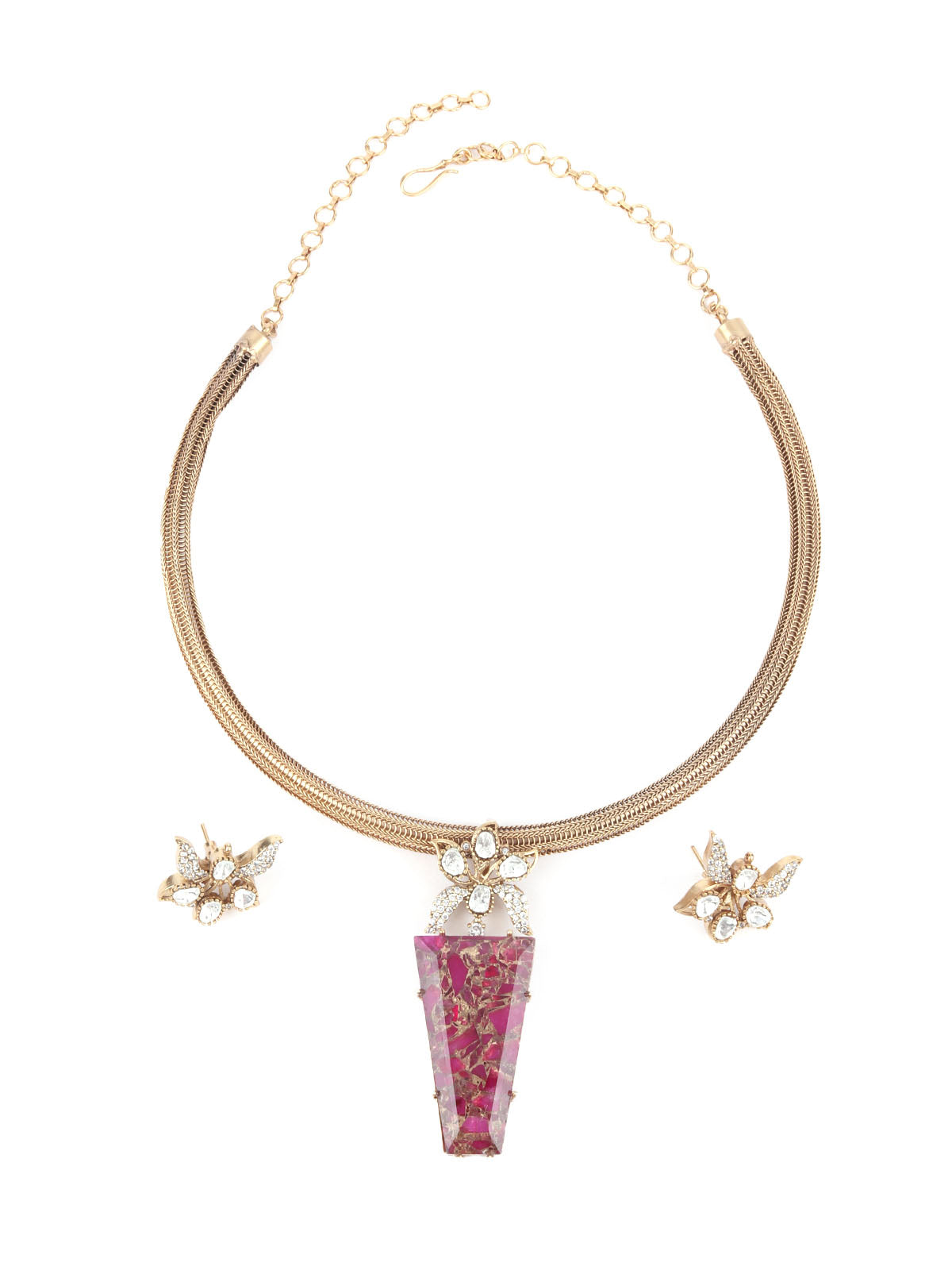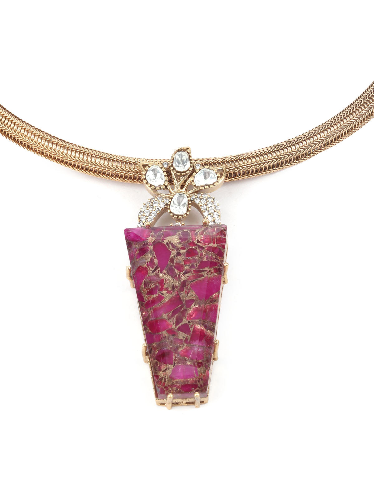 Odette Gold And Magenta Mixed Metal Embellished Neck Piece Set For Women
