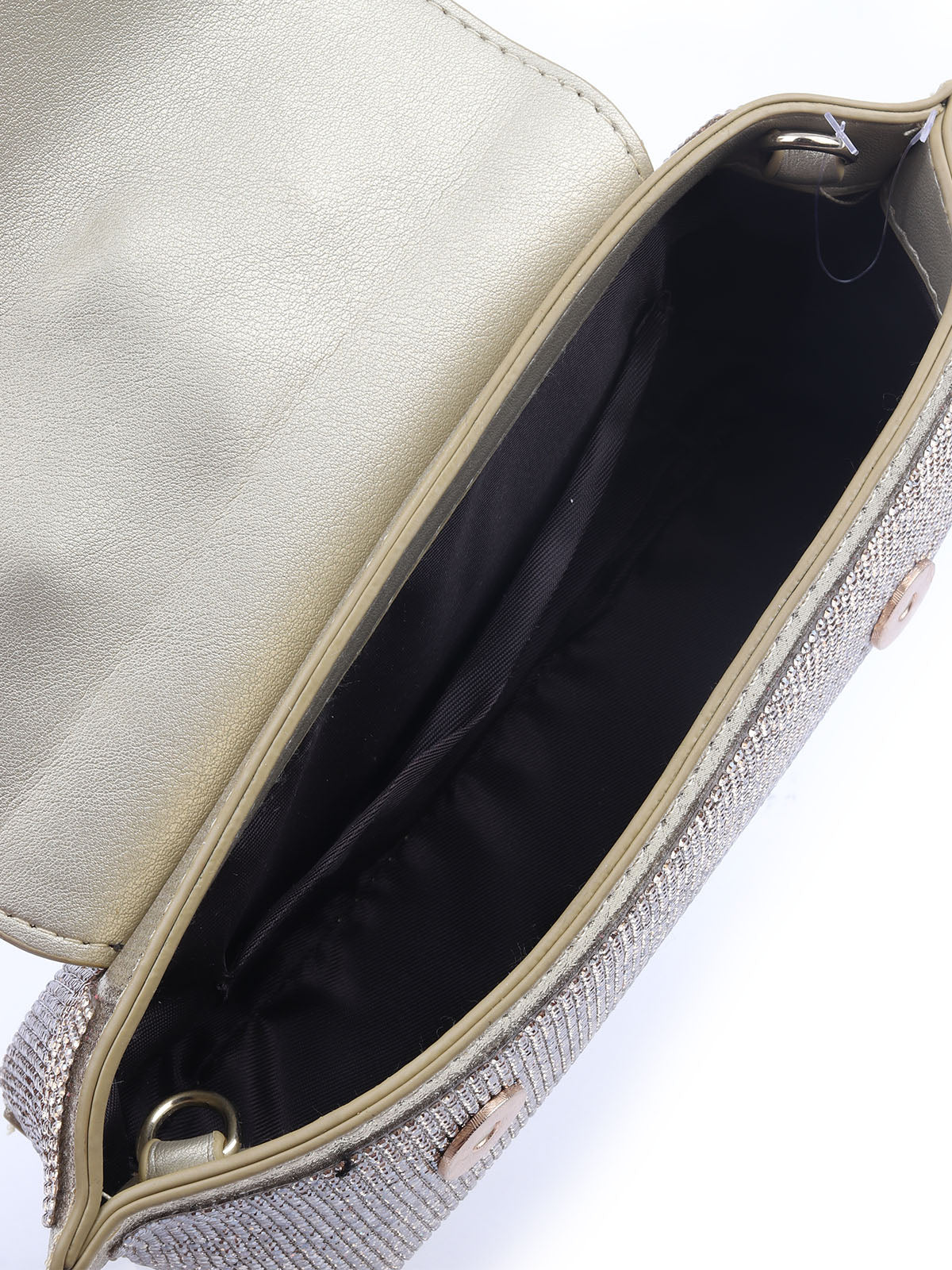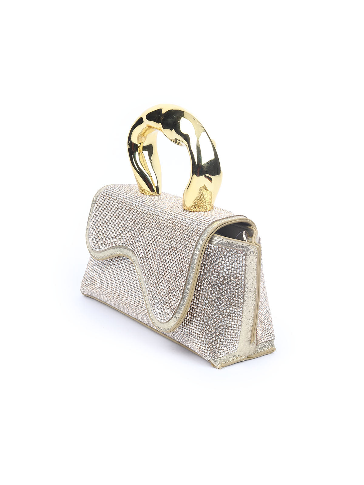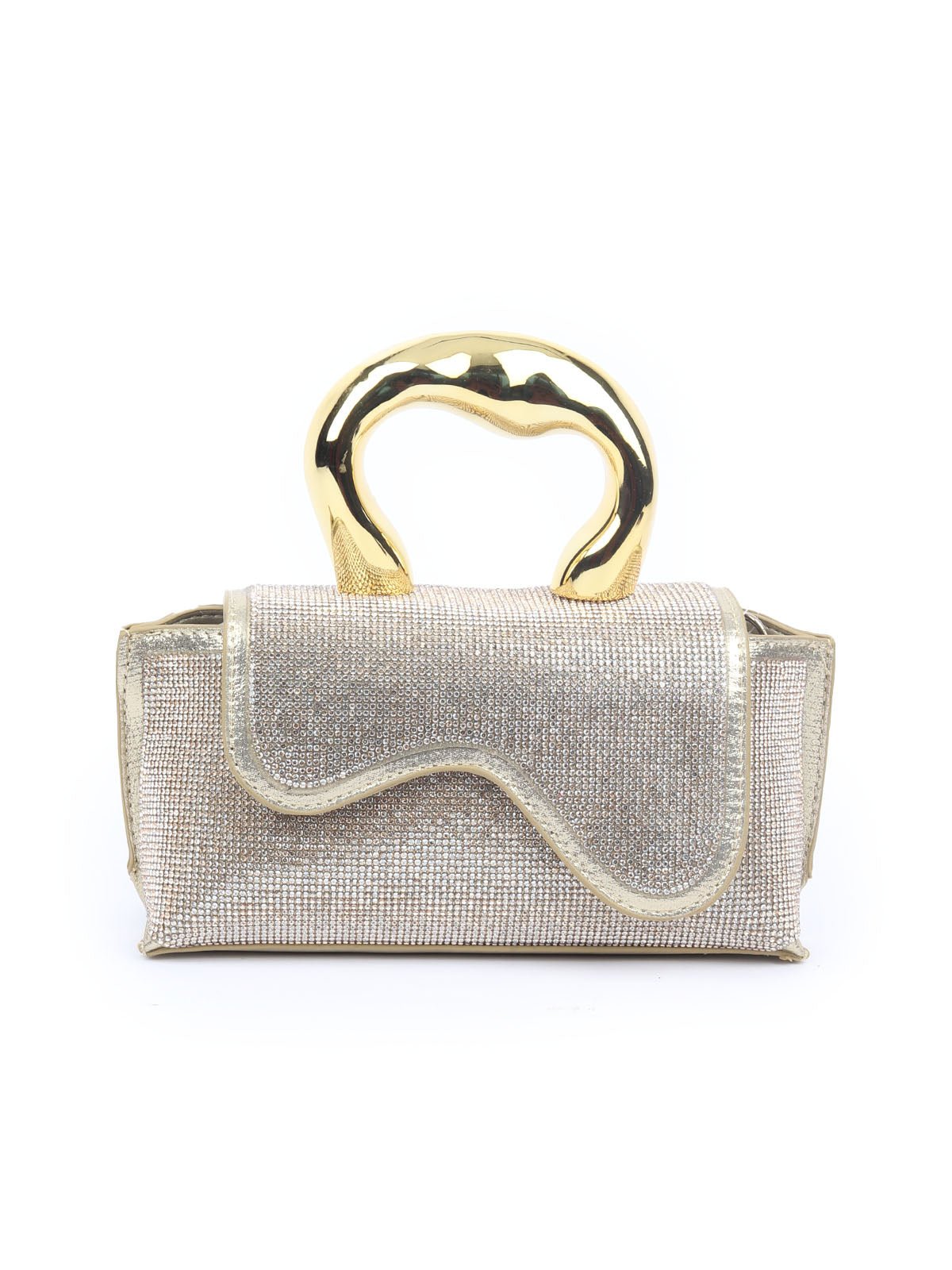 A luxurious golden handbag, beautifully detailed with golden stones and featuring an elegant flap design—perfect for adding a touch of sophistication to your party look.