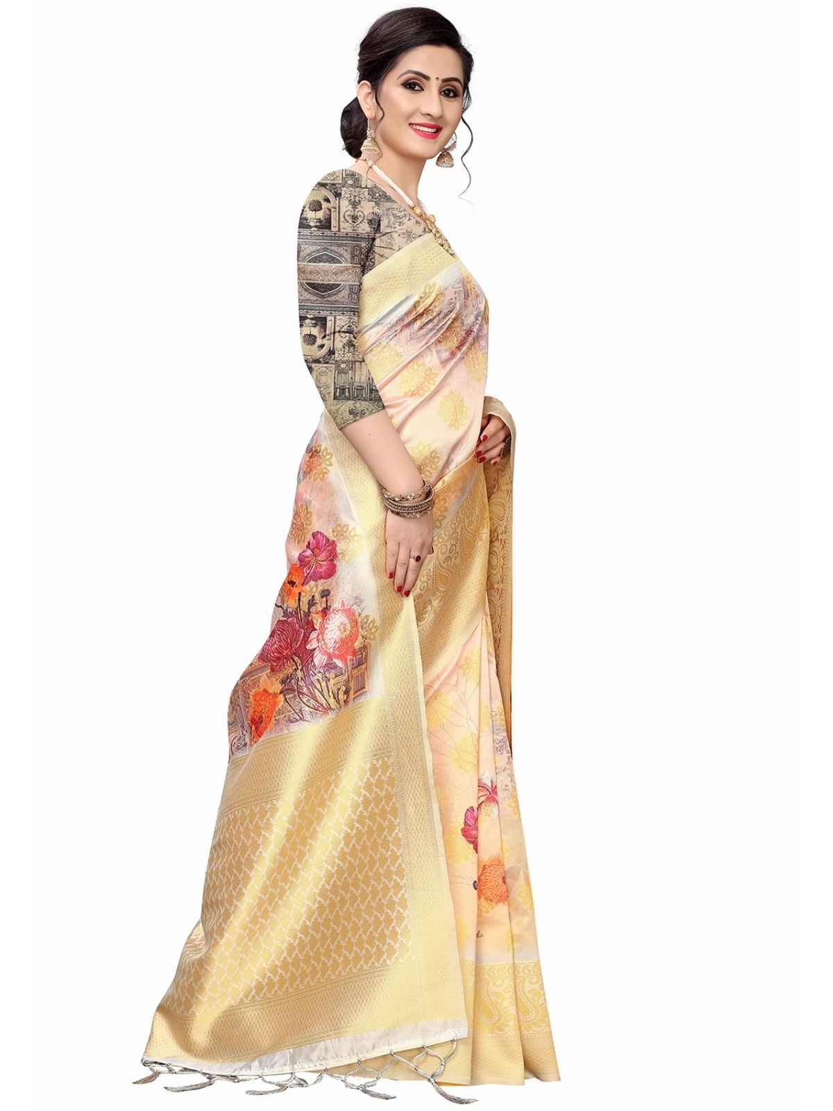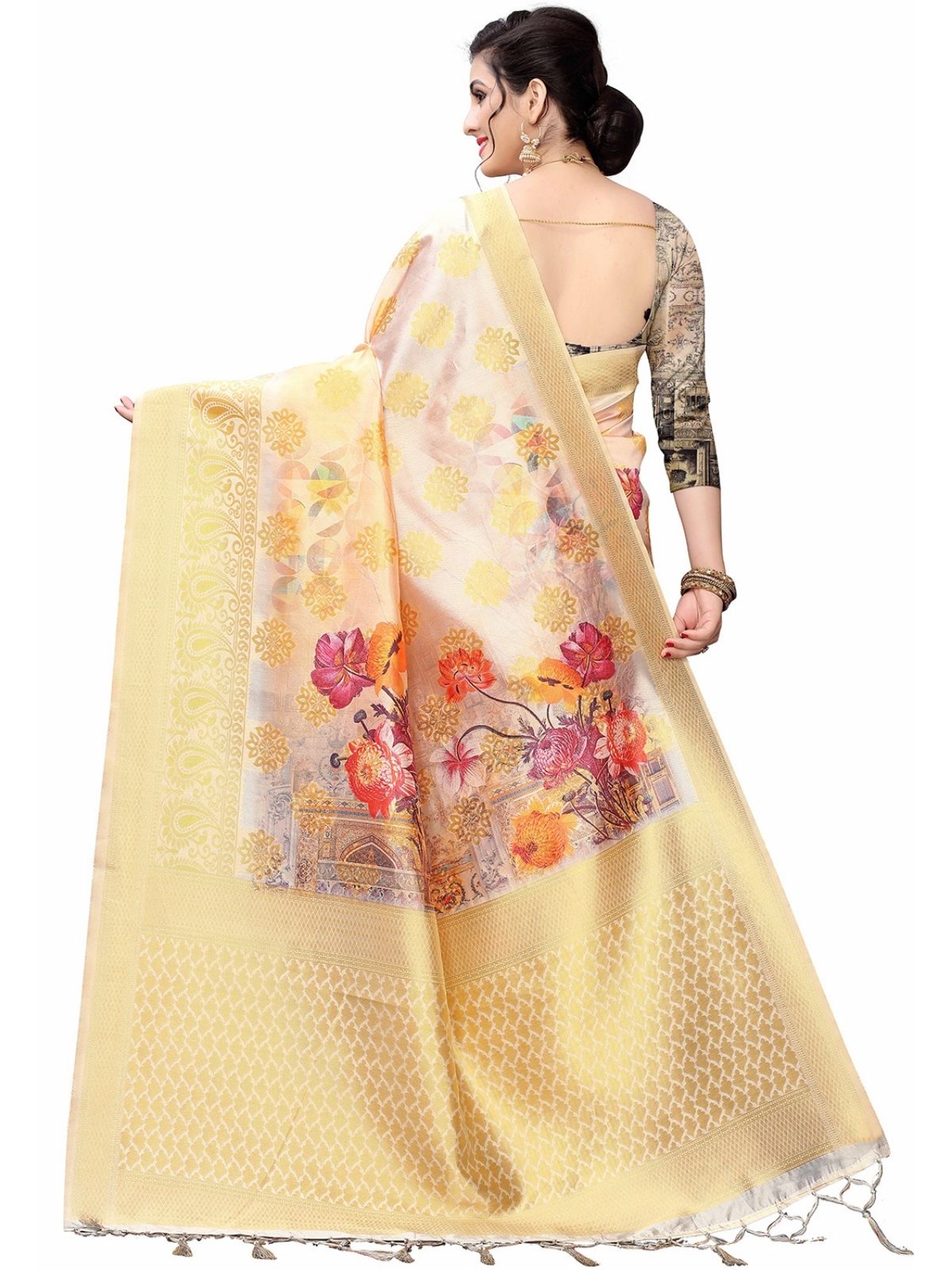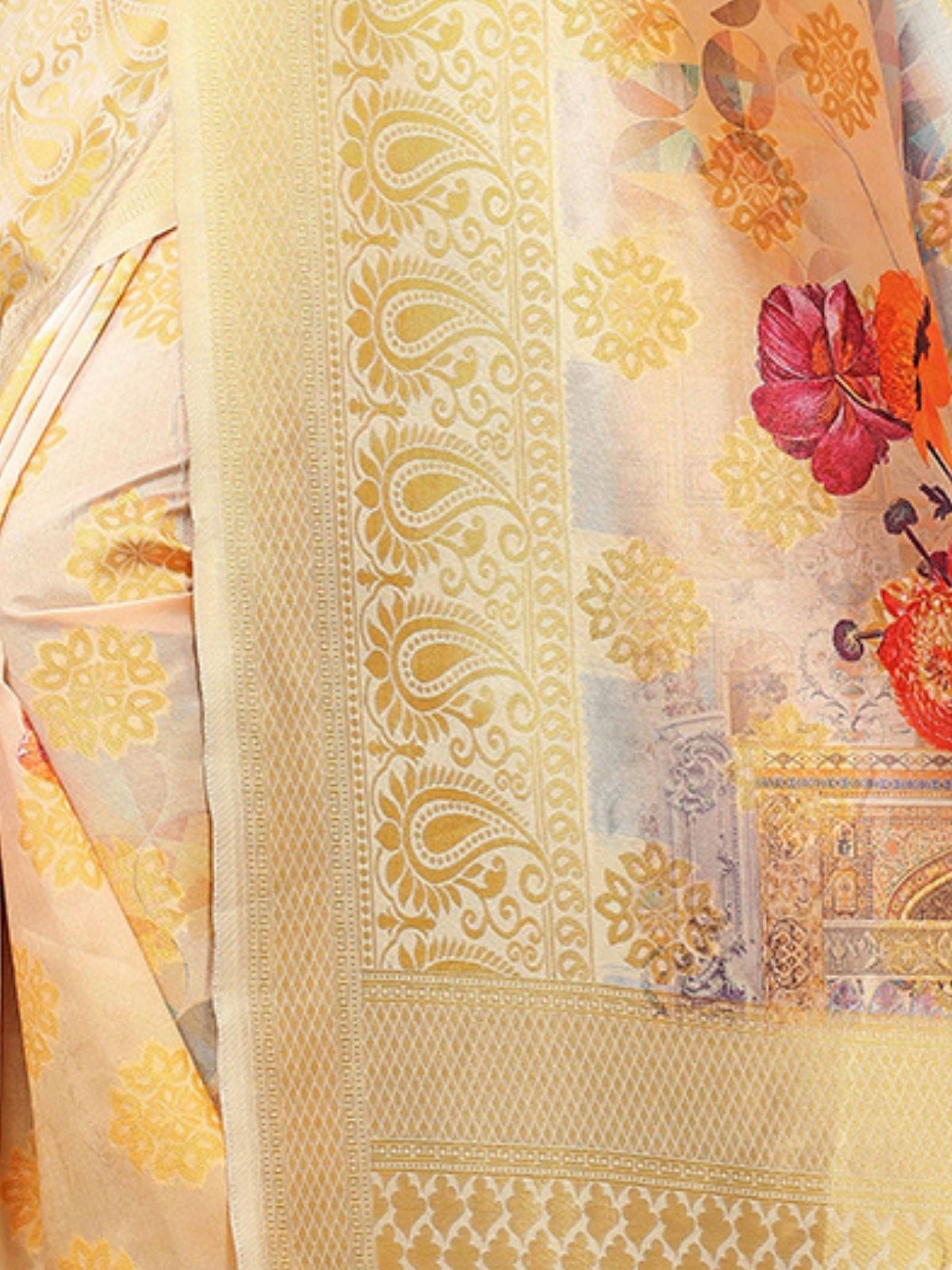 Odette Golden Silk Blend Floral Printed Saree For Women