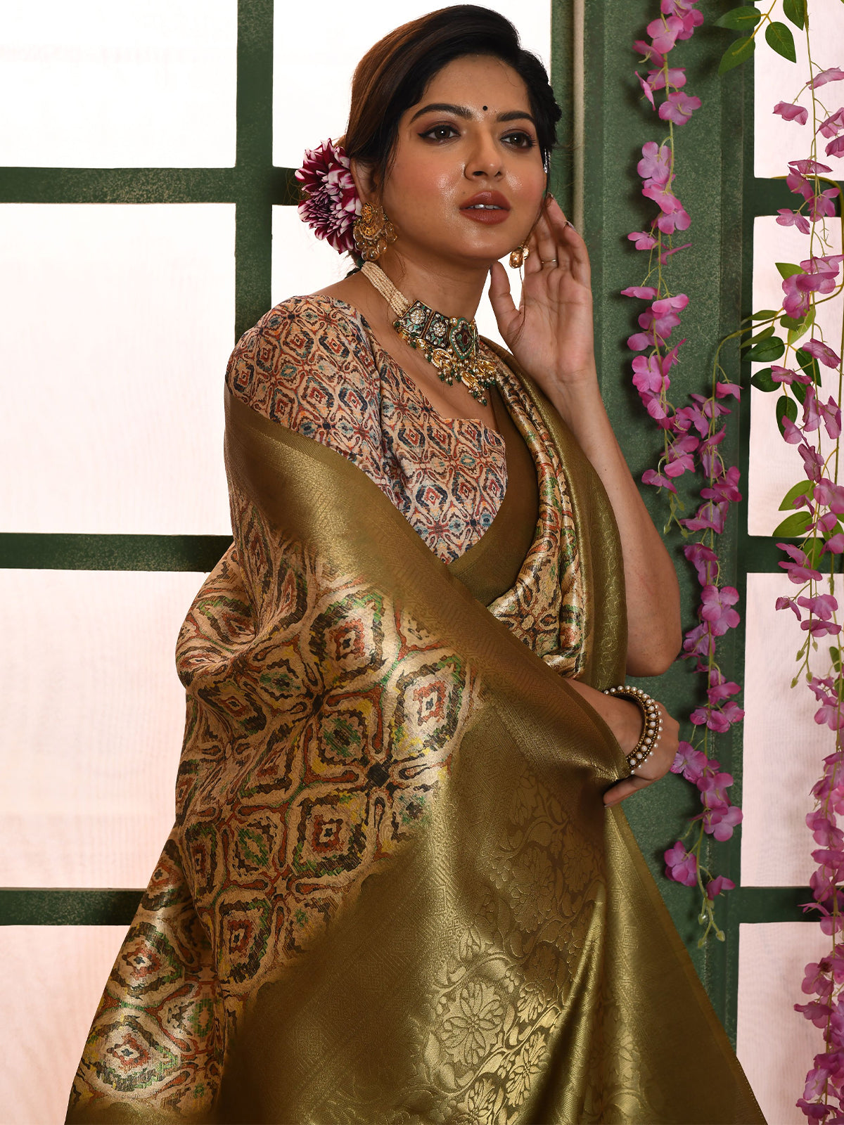 Odette Green Soft Silk Woven Saree With Unstitched Blouse For Women