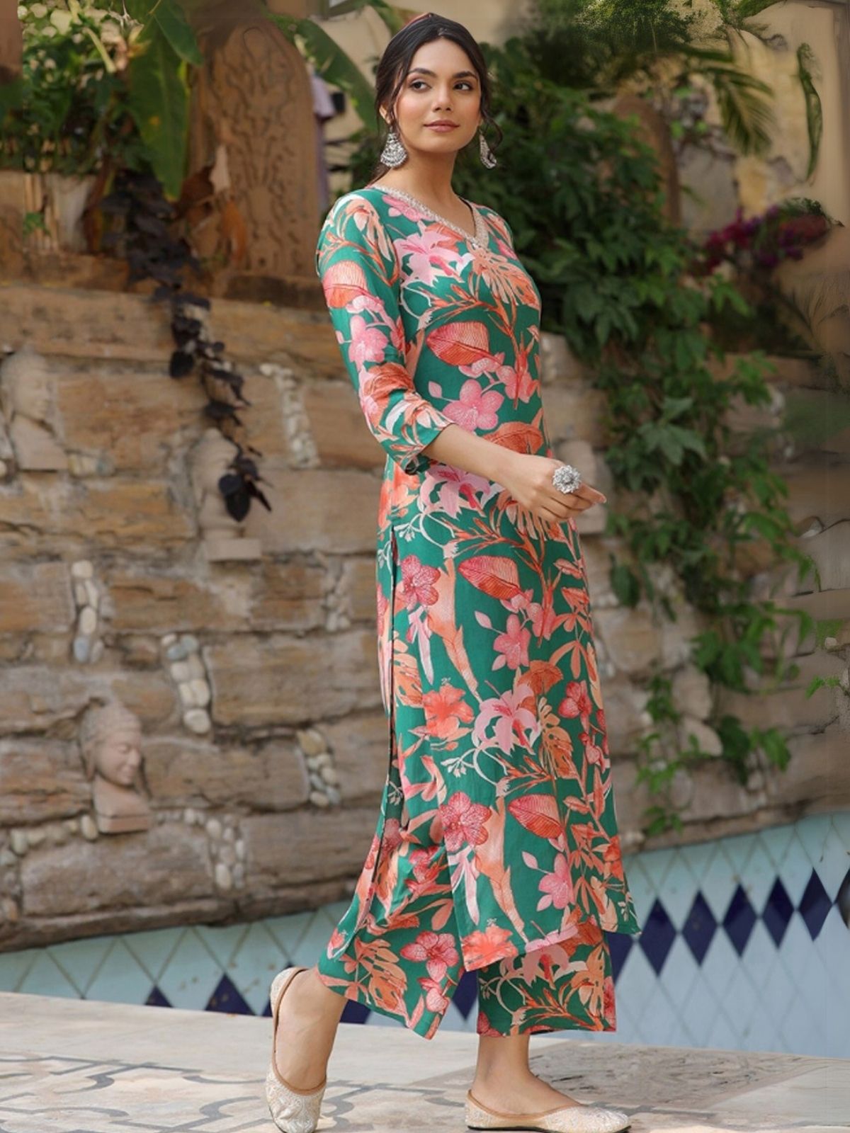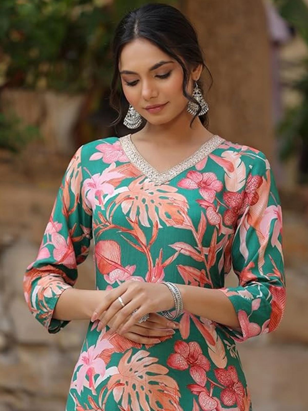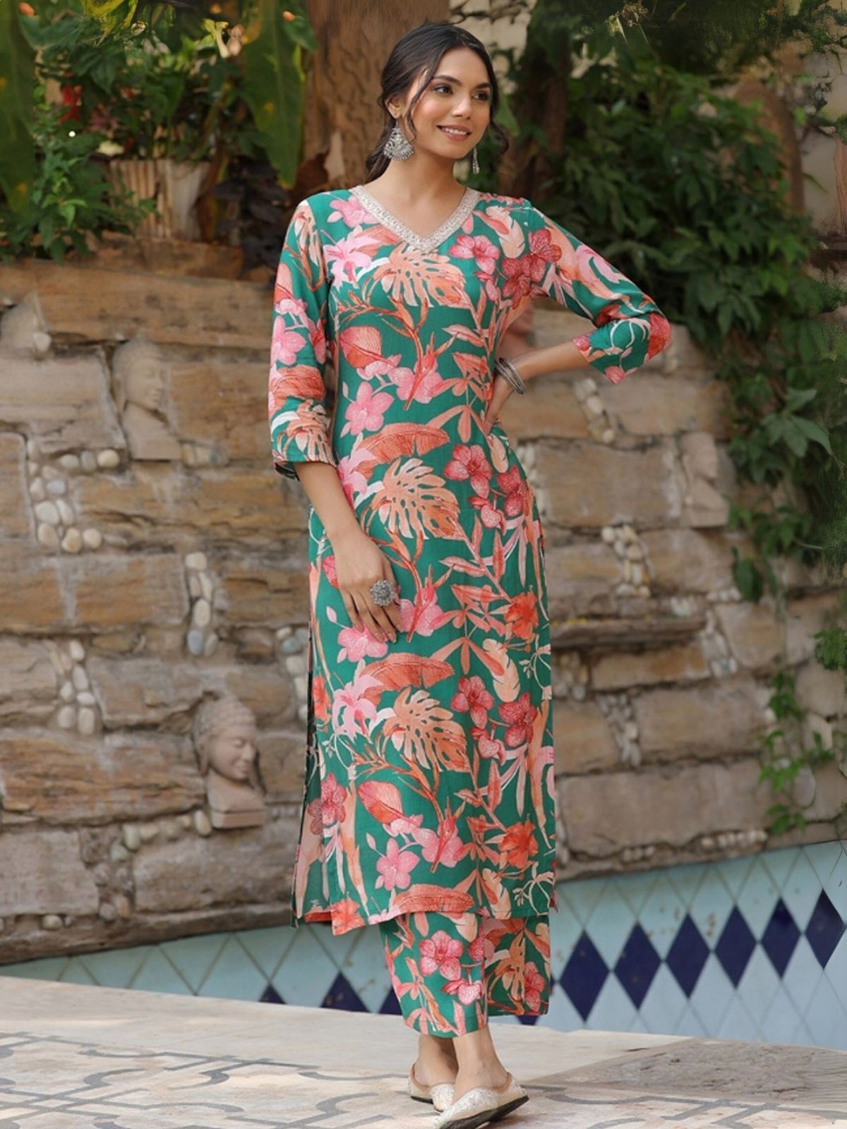 Odette Green Viscose Printed Stiched Kurta Set For Women