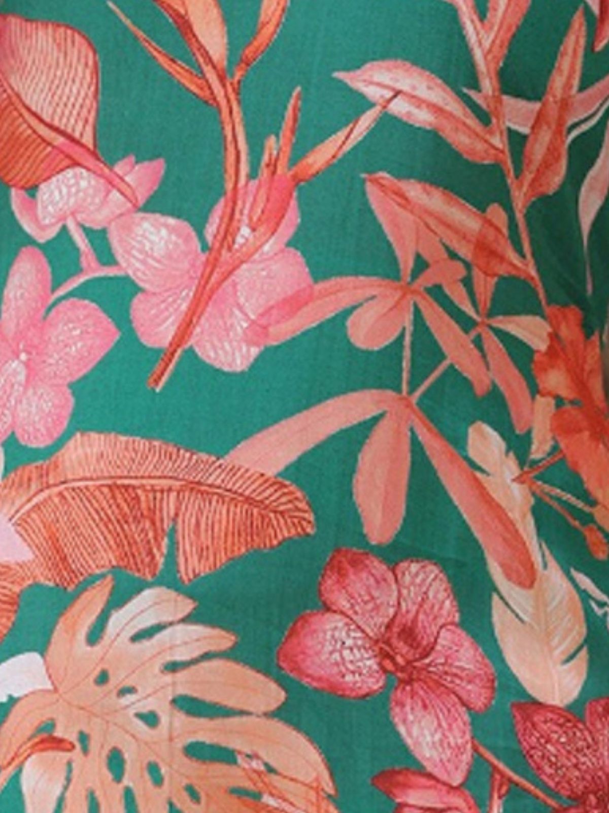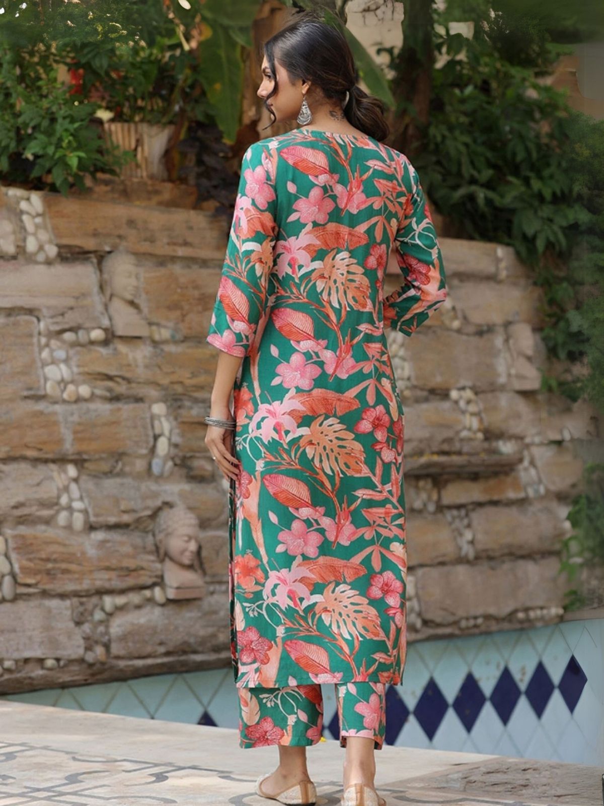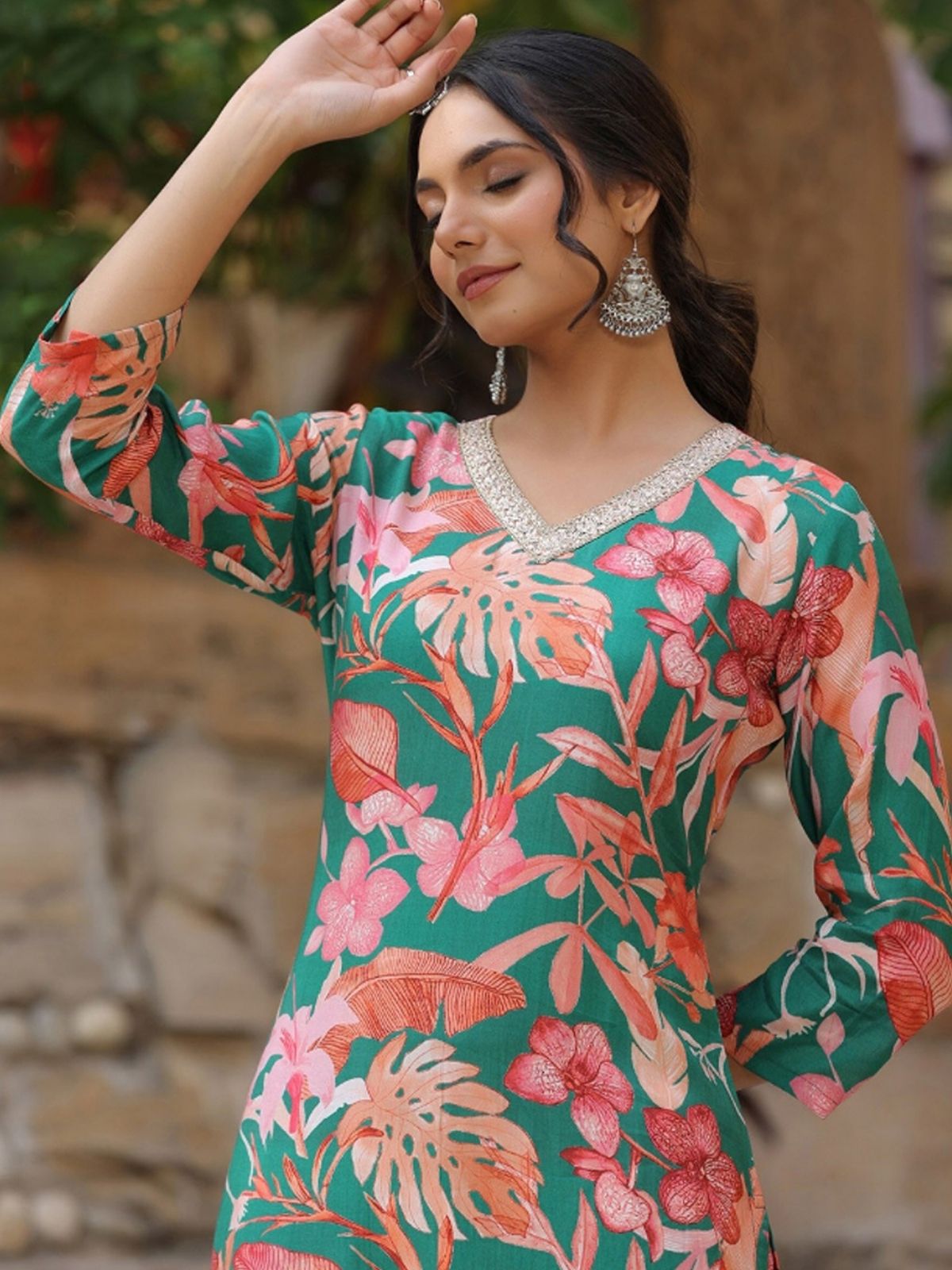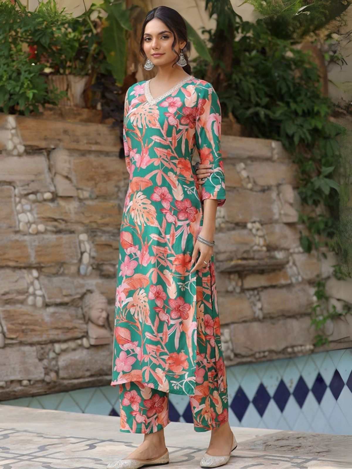 Odette Green Viscose Printed Stiched Kurta Set For Women