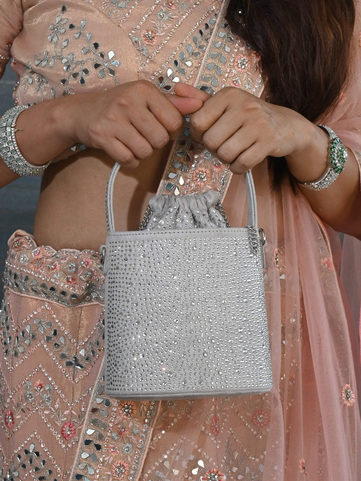 Make a fashion statement with Odette's Grey Embellished Potli Style Clutch for Women. Chic and versatile, it's the perfect accessory for any outfit. Shop now and elevate your look