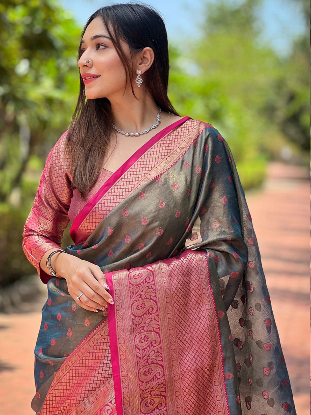 Re-Define Your Style In The Beautiful Woven Design Saree With A Matching Blouse Pieces. Match It With A Clutch And A Pair Of Heeled Sandals And You Are Ready To Slay.