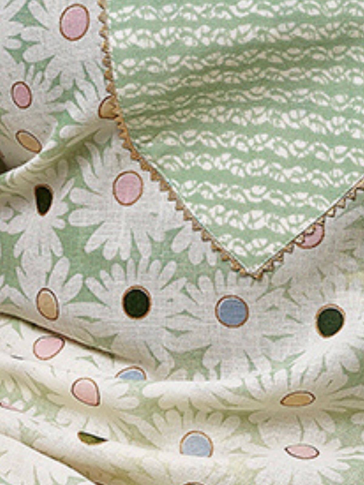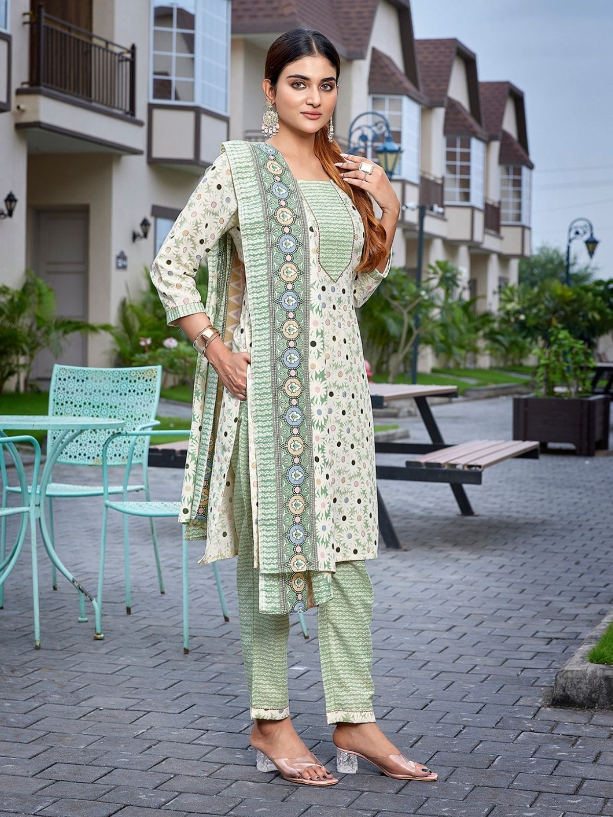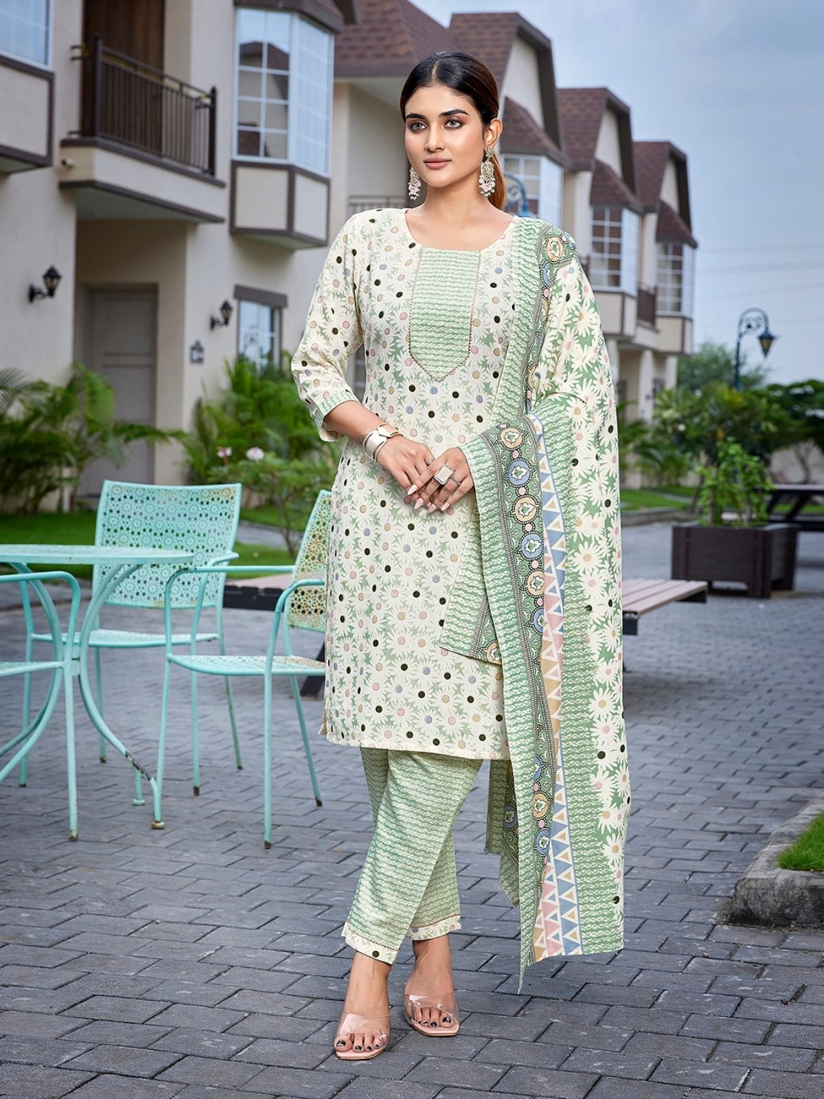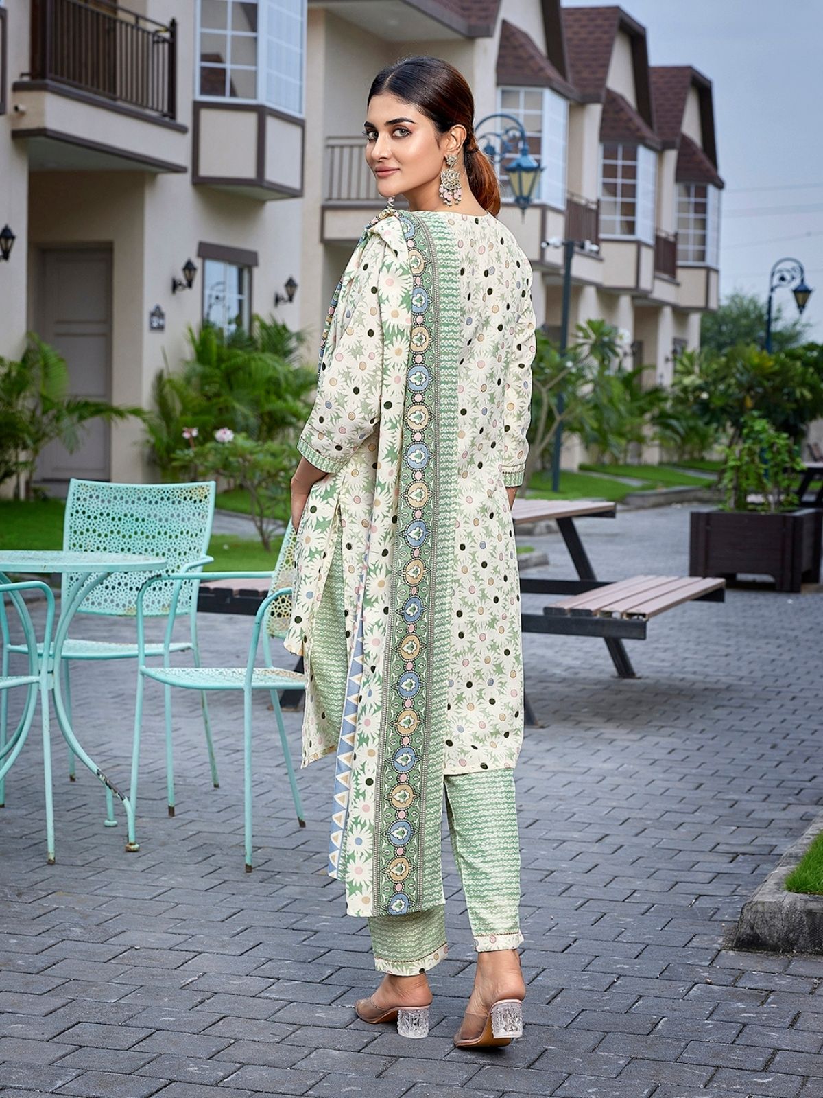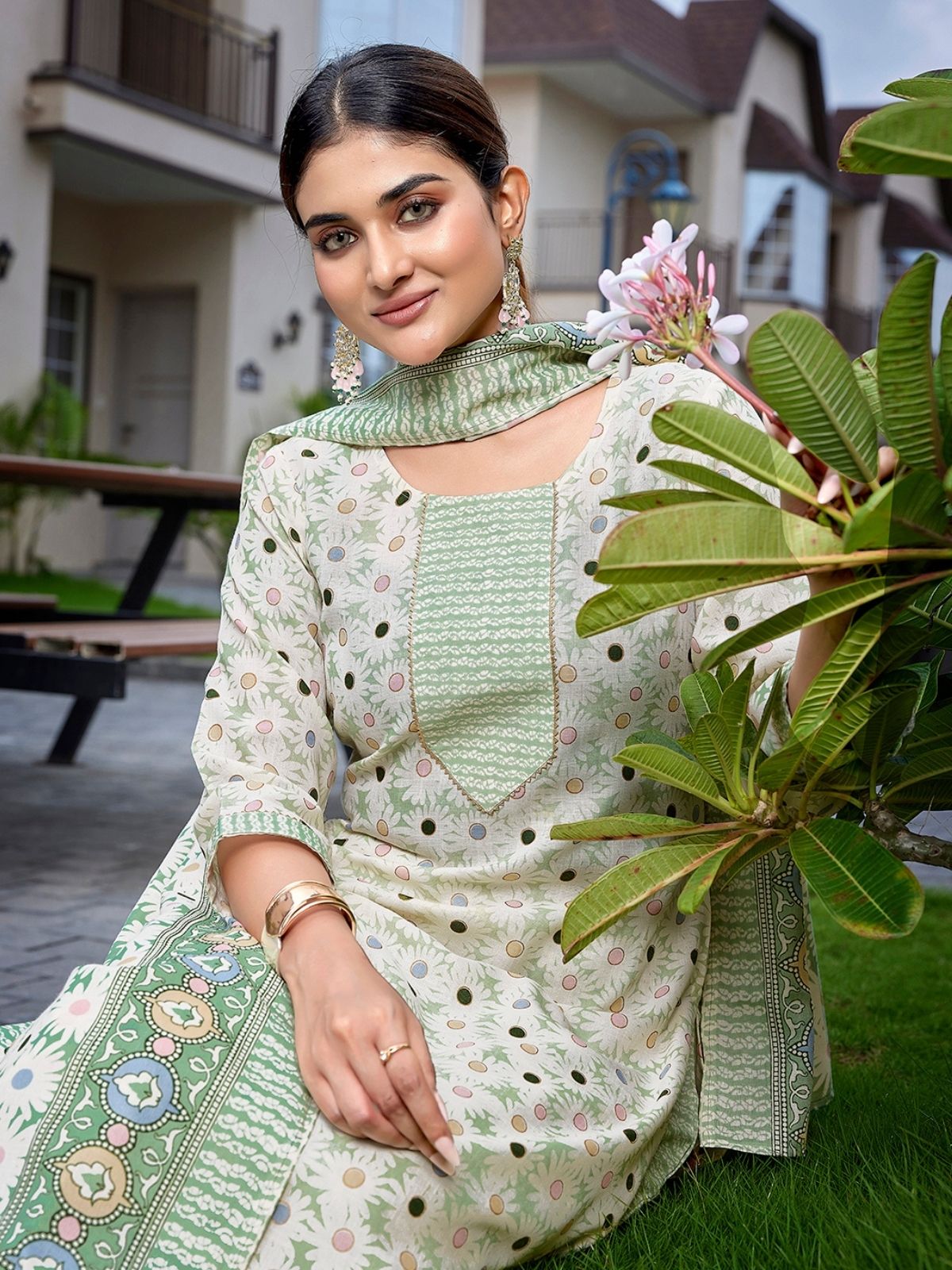 Odette Light Green Cotton Blend Printed Stiched Kurta Set For Women