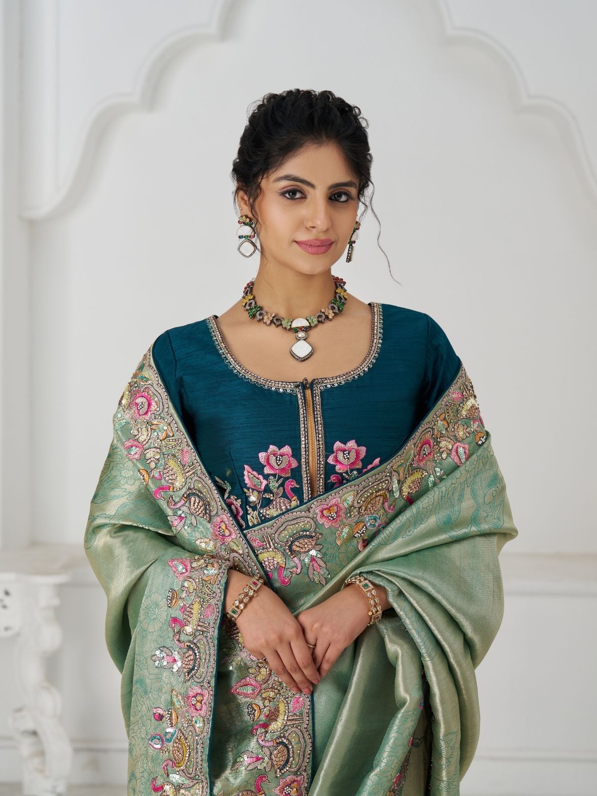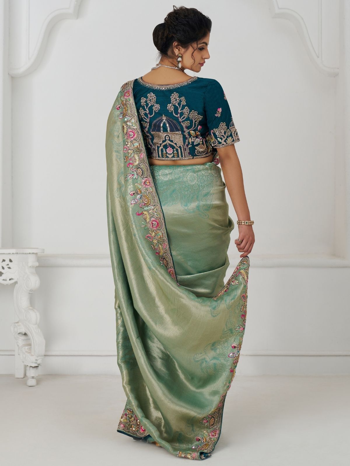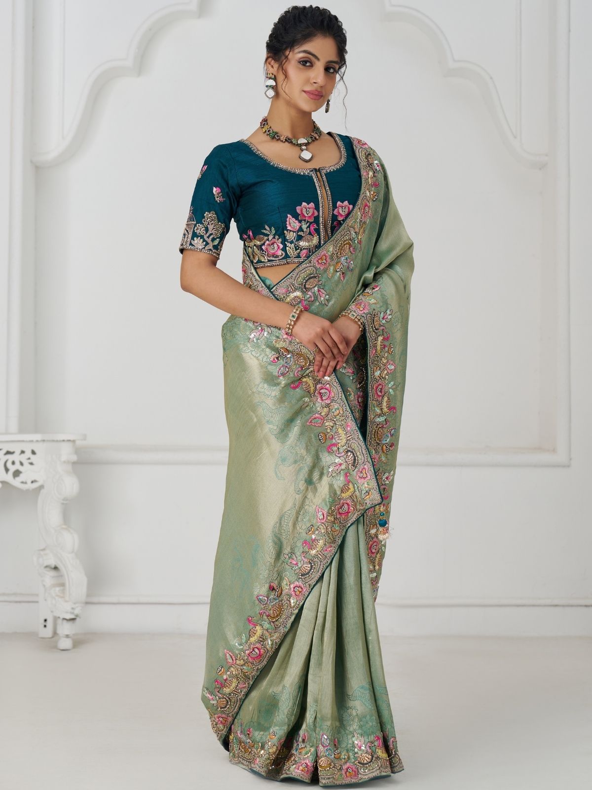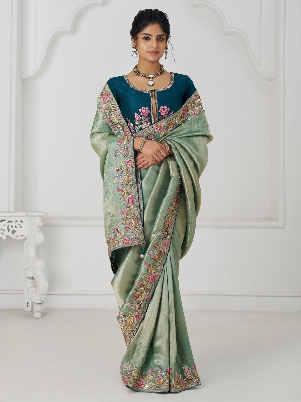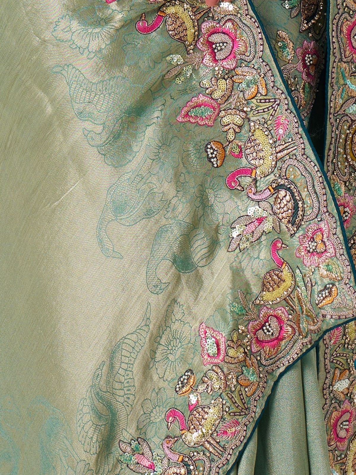 Odette Light Green Viscose Silk Embroidered Saree For Women