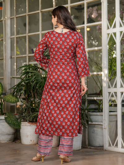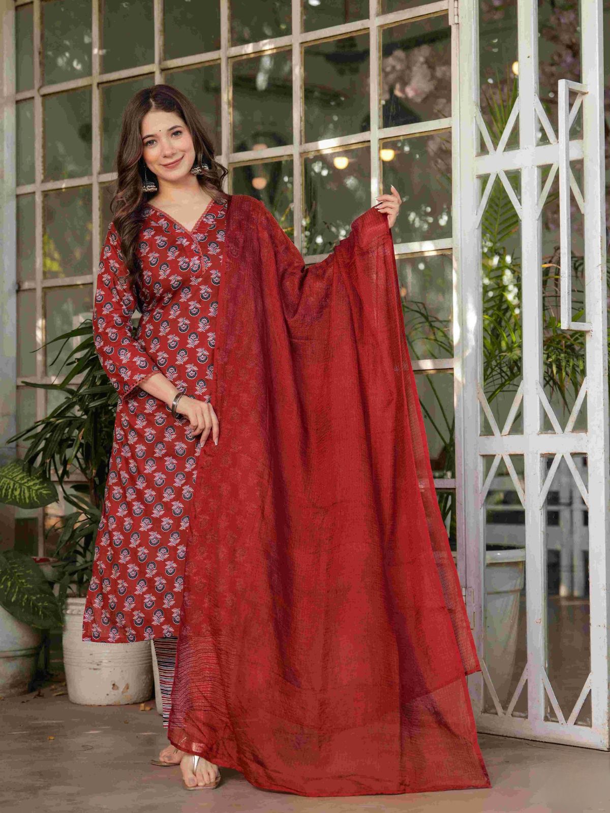 Odette Maroon Cotton Blend Printed Stitched Kurta Set For Women