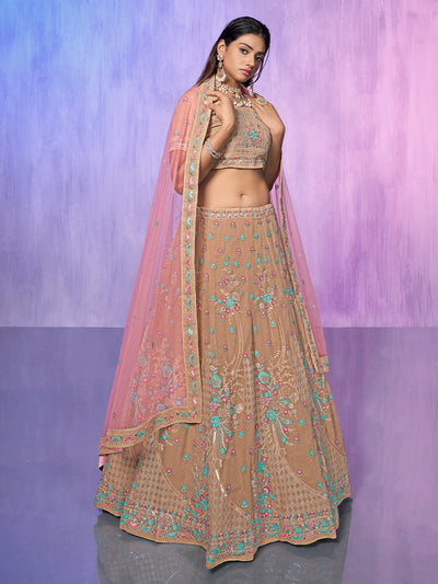 Odette Beige Embroidered Georgette Semi Stitched Lehenga With Unstitched Blouse For Women