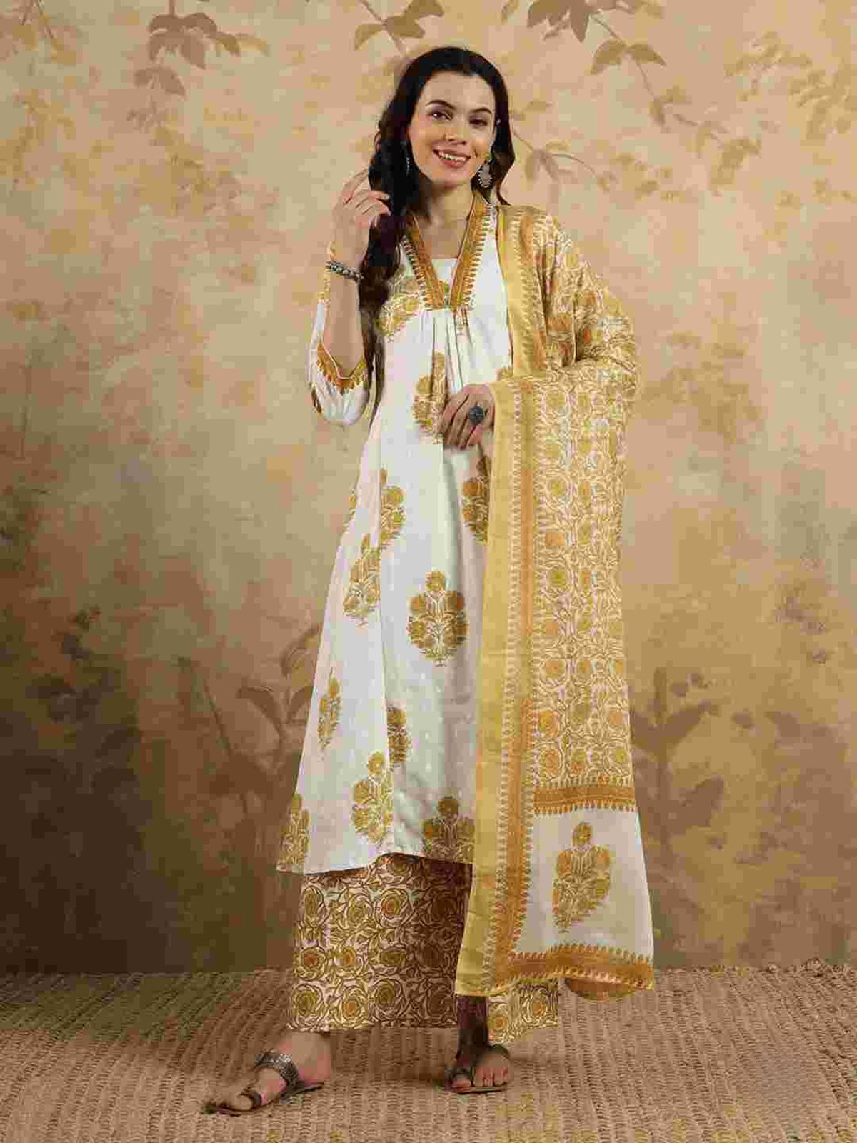Odette Off White Cotton Blend Printed Stitched Kurta Set For Women