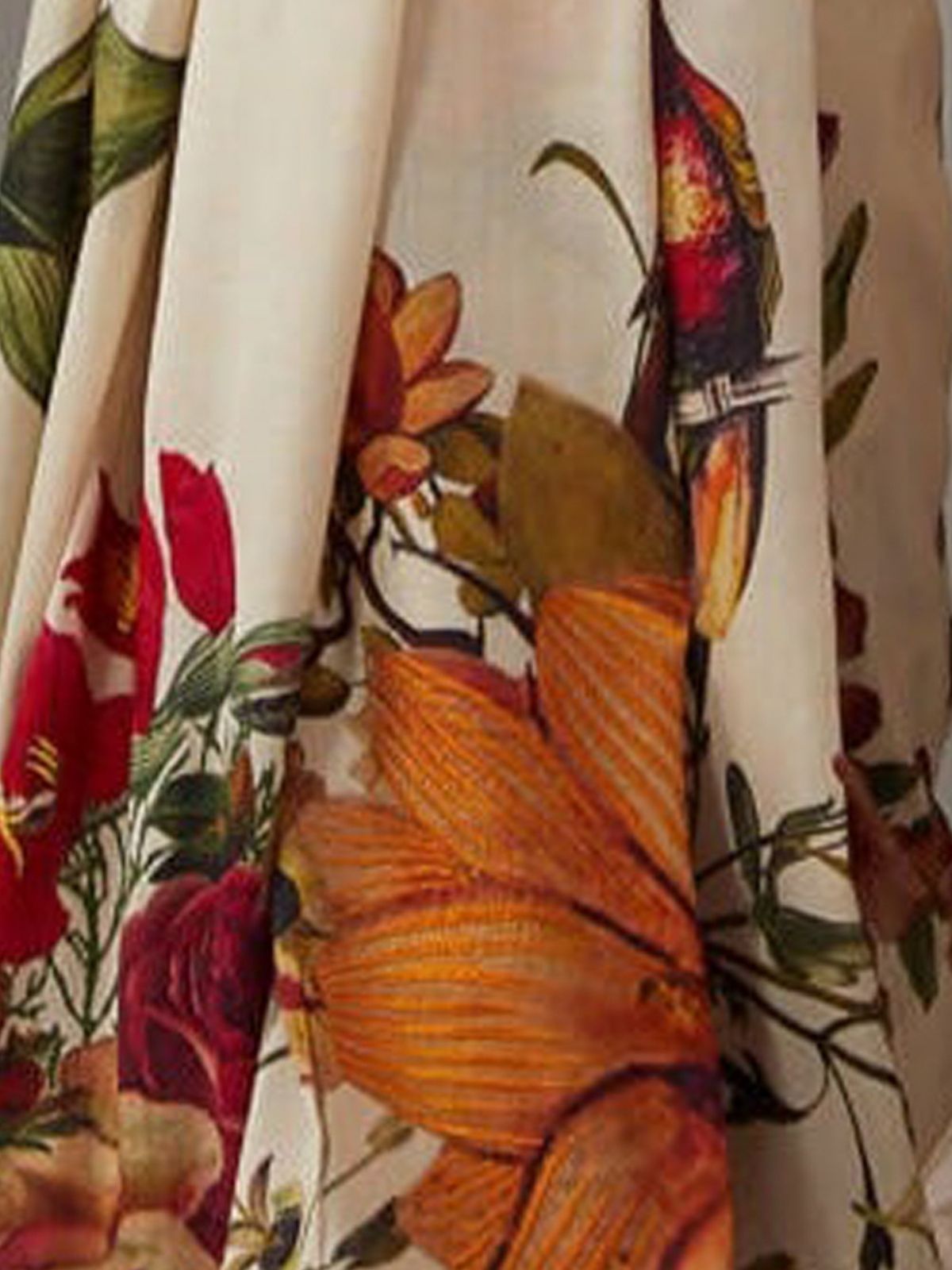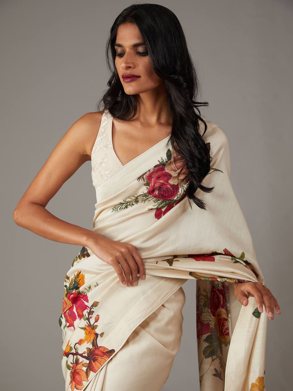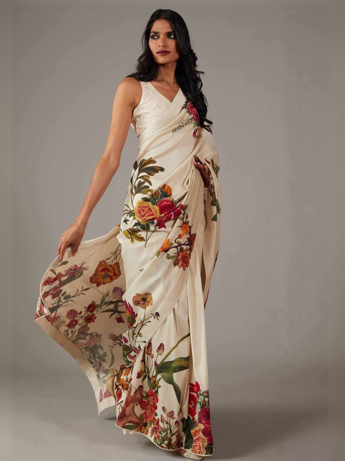 Odette Off White Georgette Floral Printed Saree With Unstitched Blouse For Women