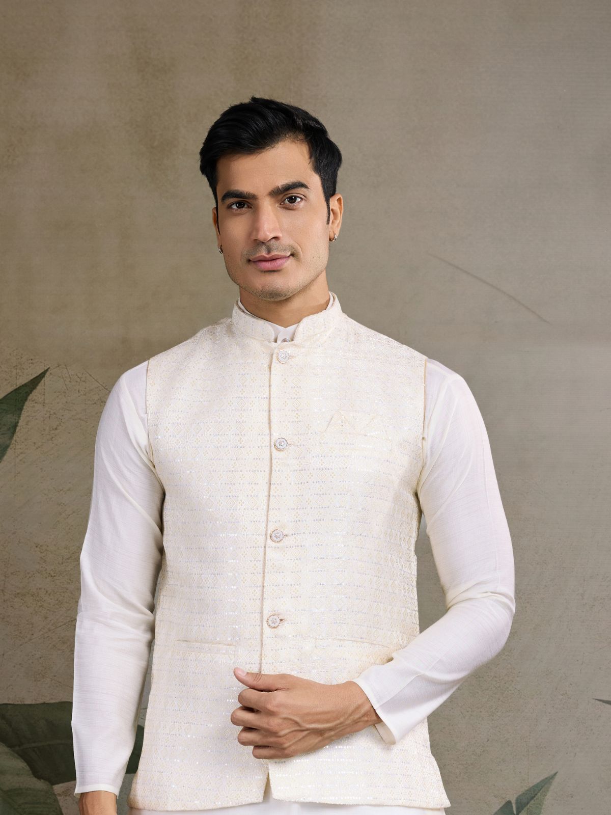 Odette Off White Viscose Silk  Woven Stitched Kurta For Men