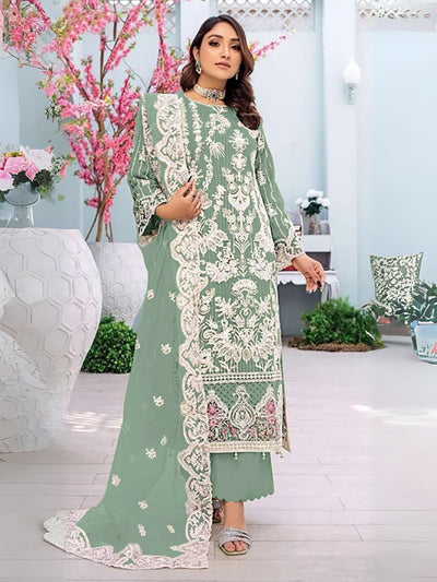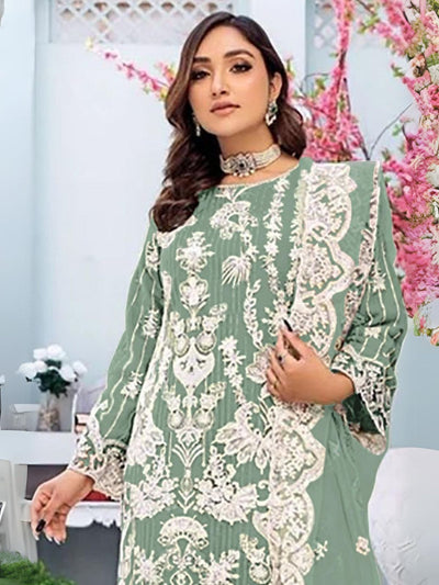 Odette Olive Embroidered Georgette Semi Stitched Kurta Set For Women