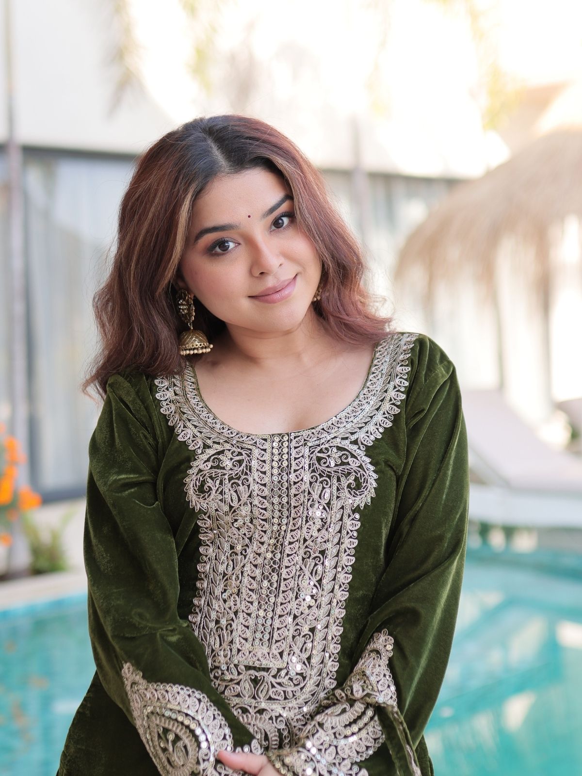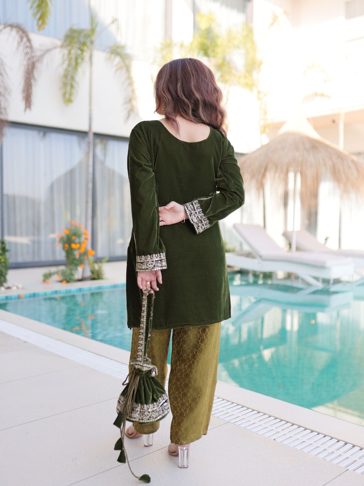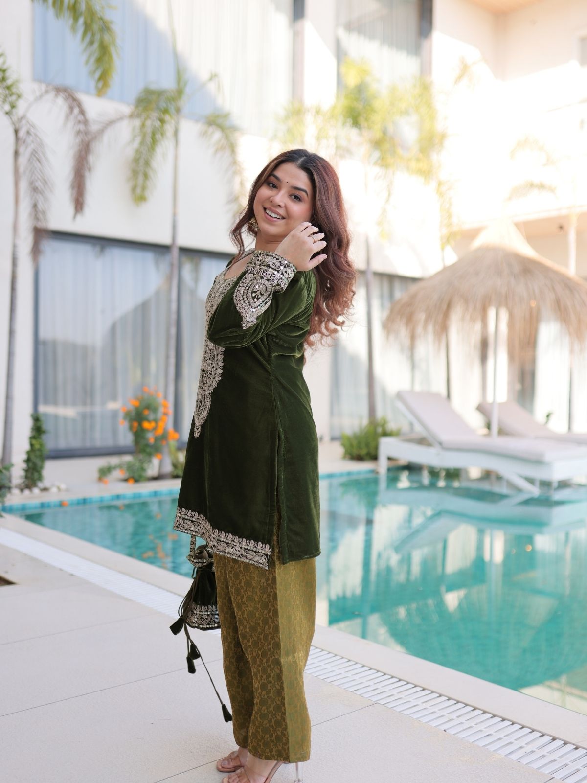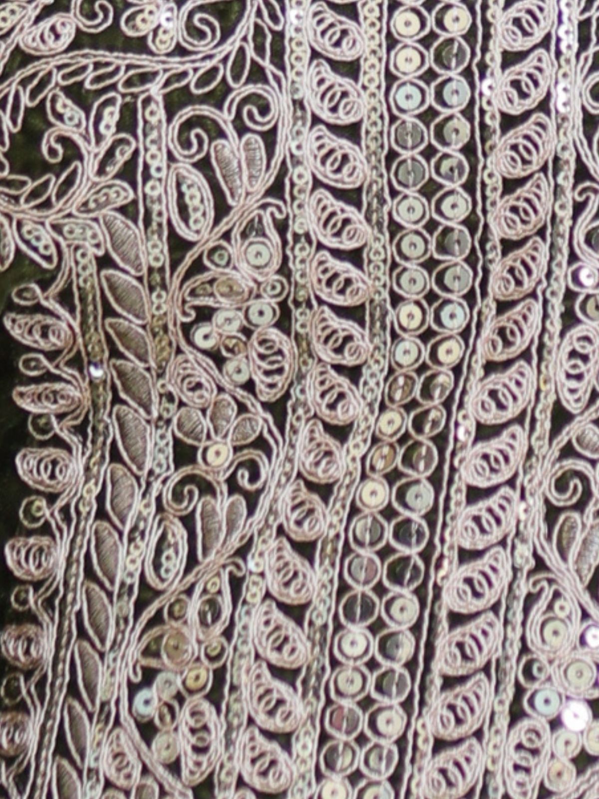 Odette Olive Velvet Embroidered Kurta Set For Women