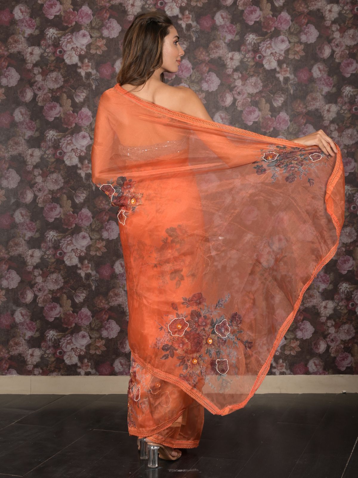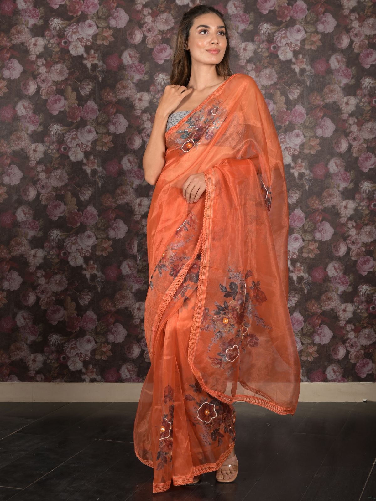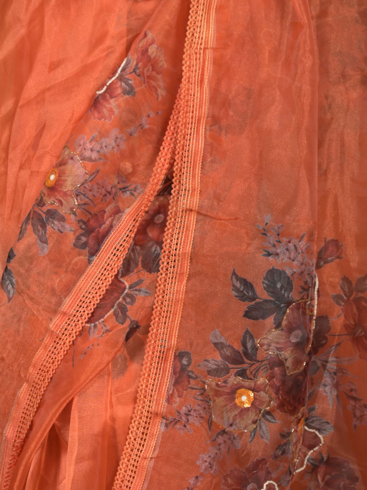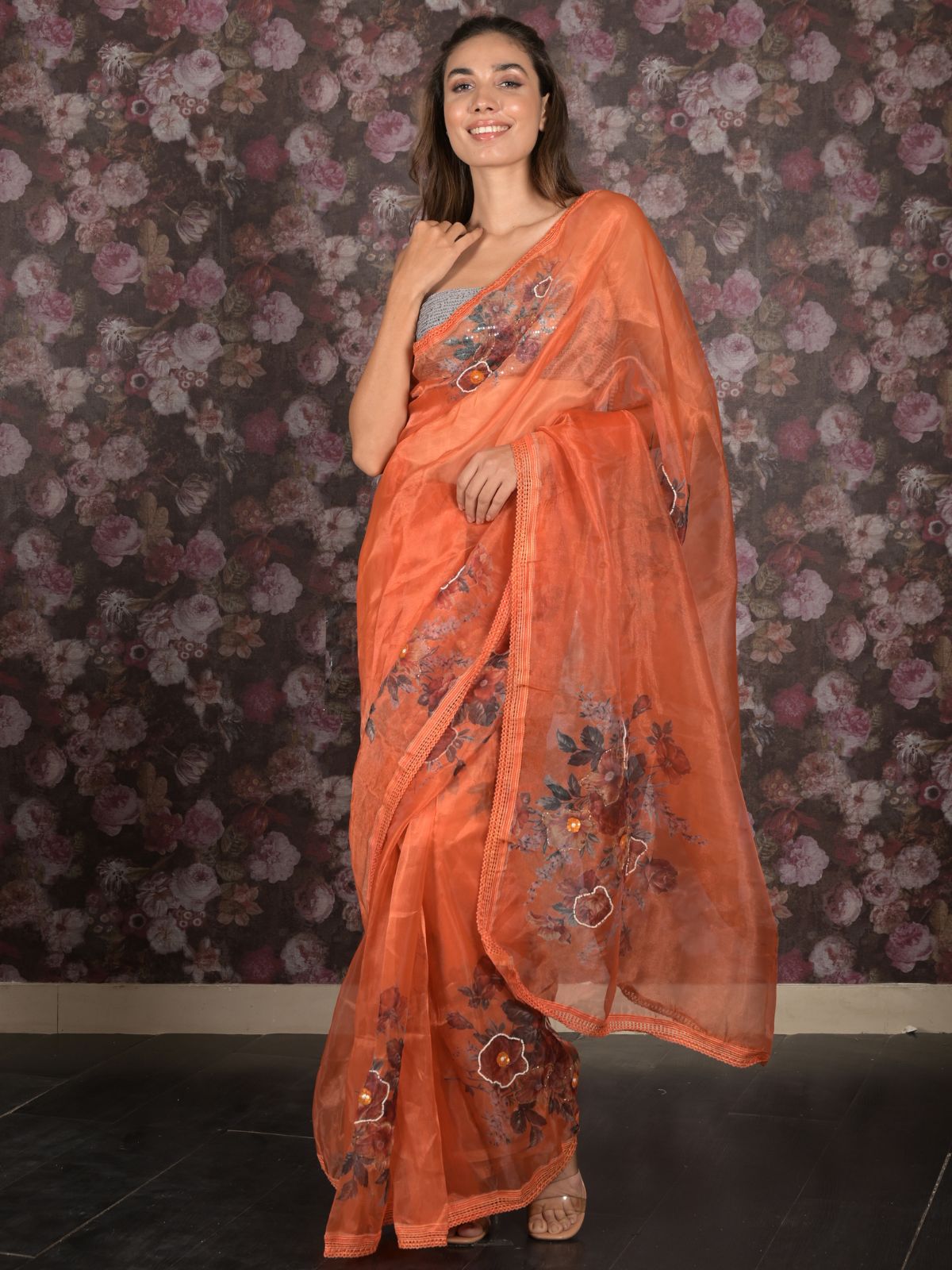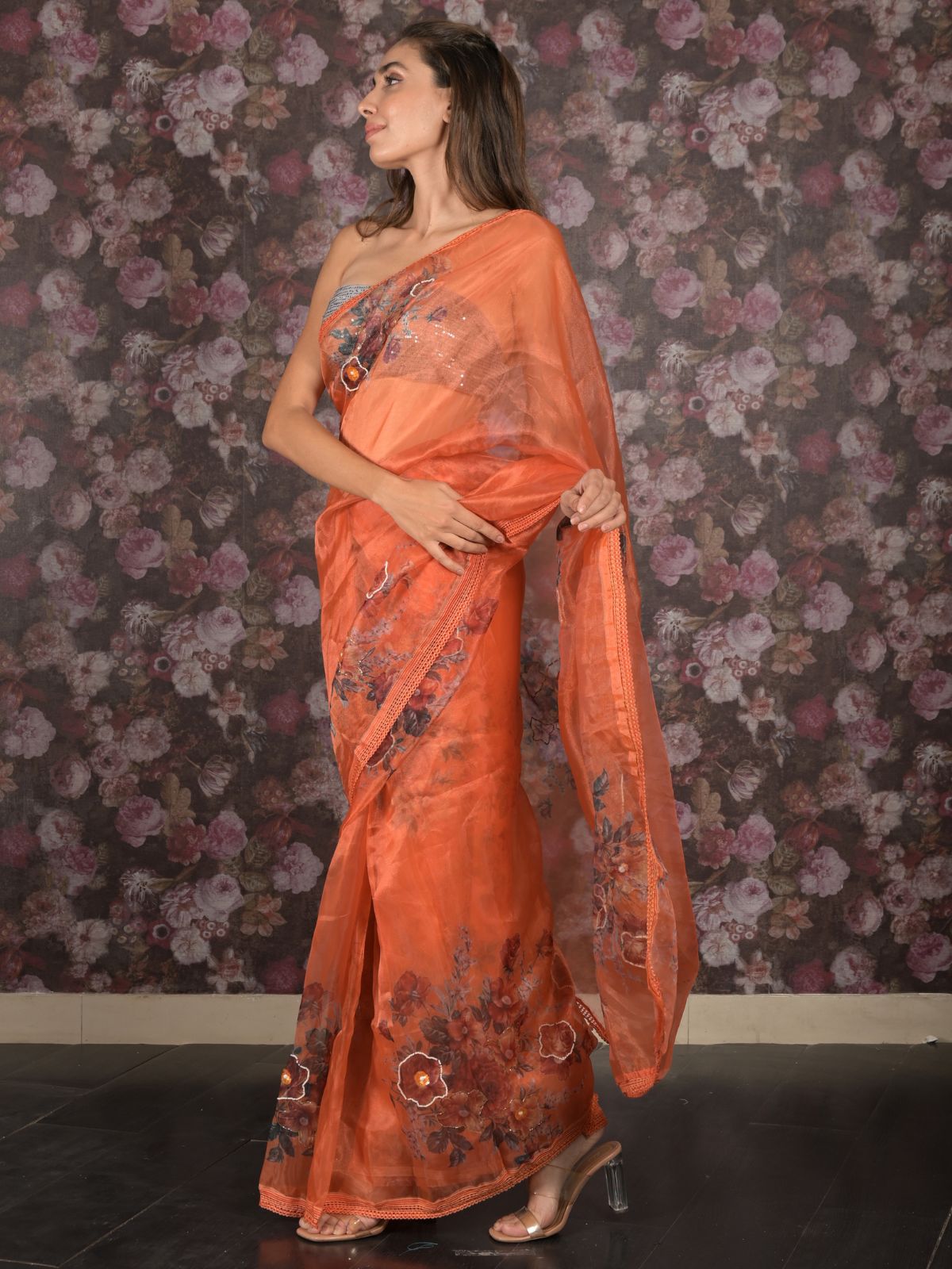 Odette Orange Printed Organza Saree With Unstitched Blouse For Women