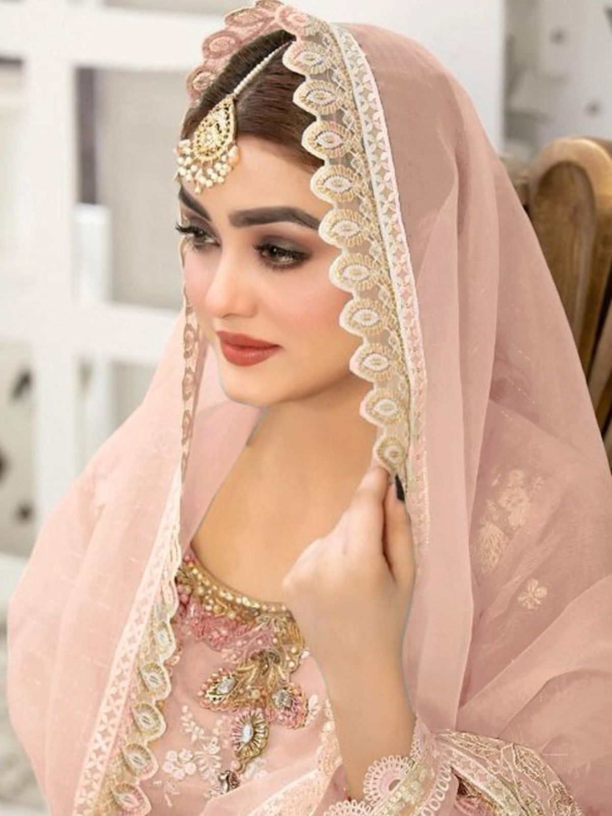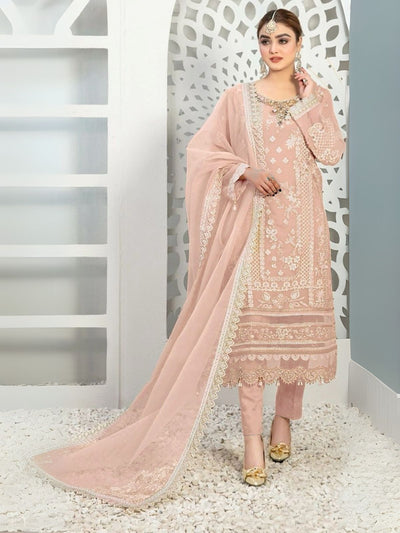 Odette Peach Organza Embroidered Semi-Stitched Kurta Set For Women