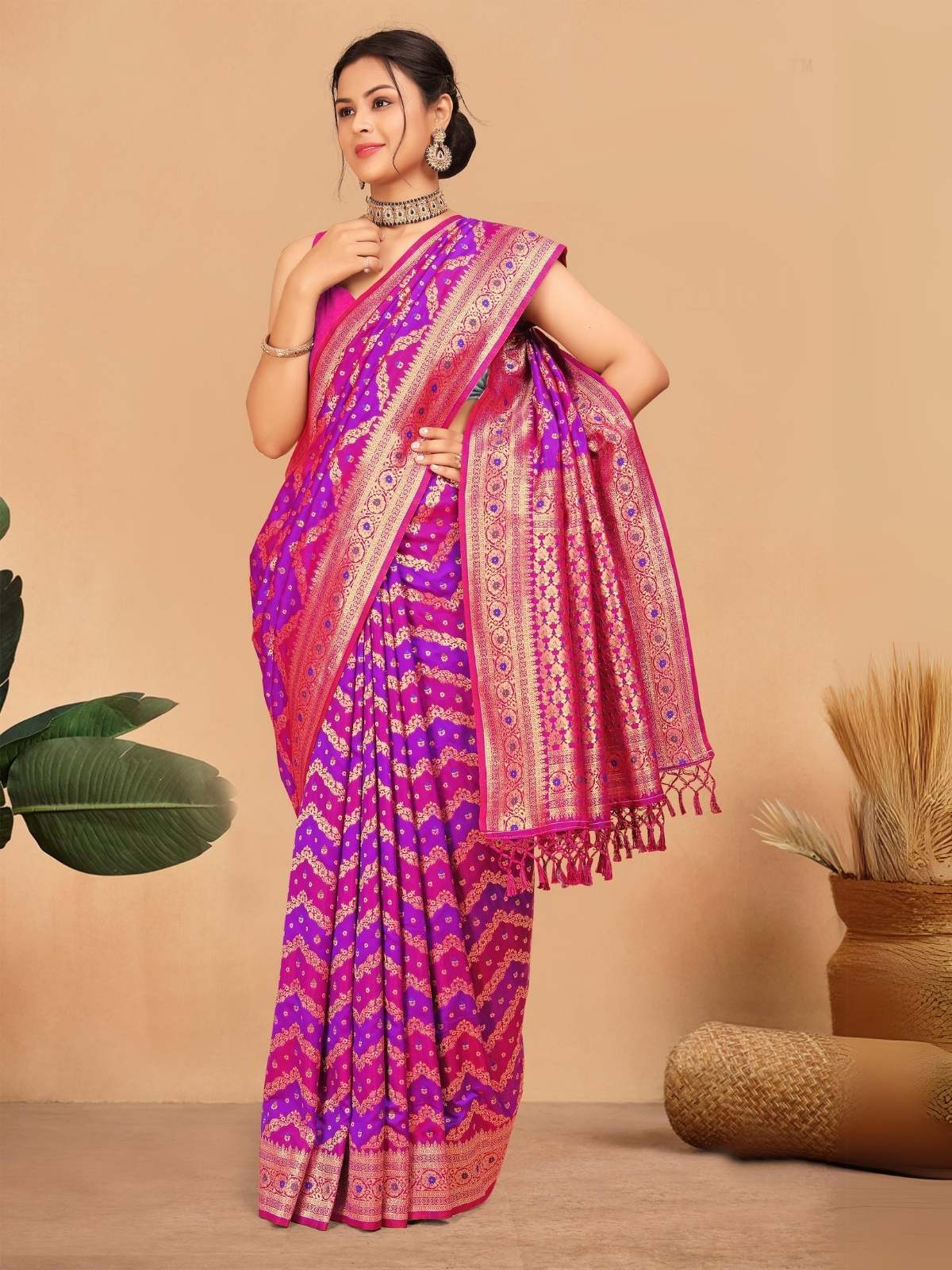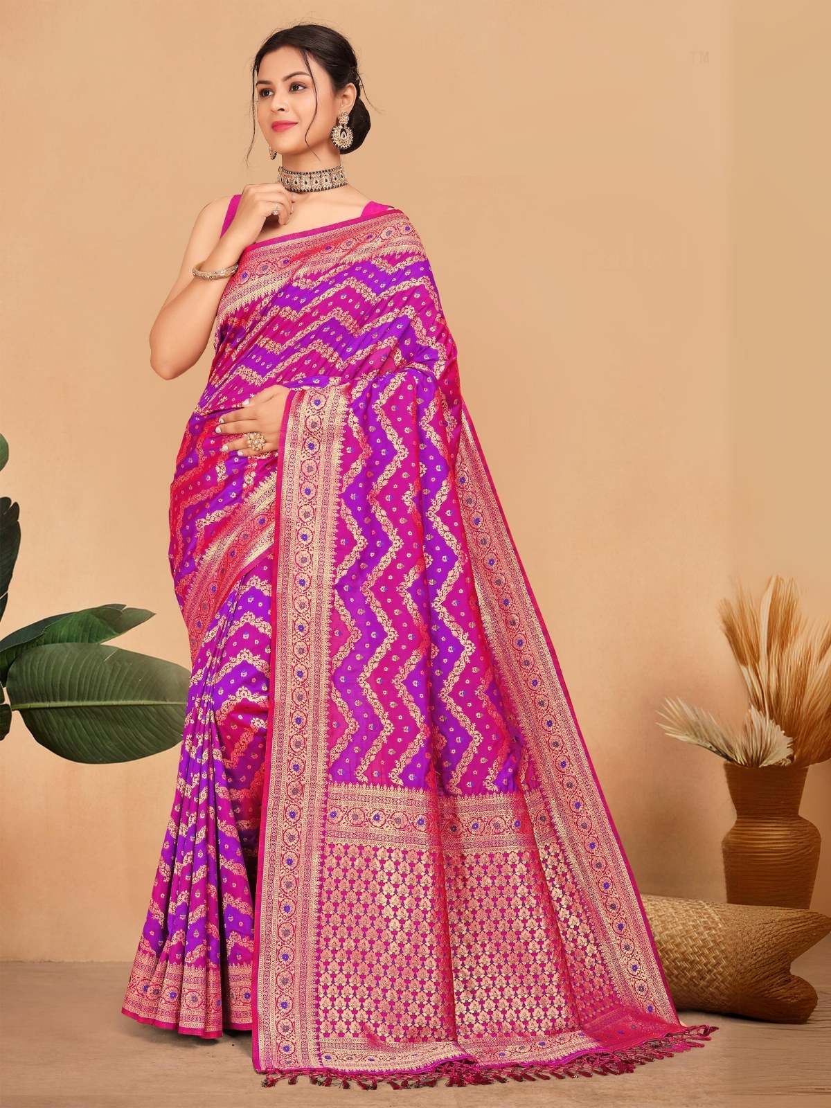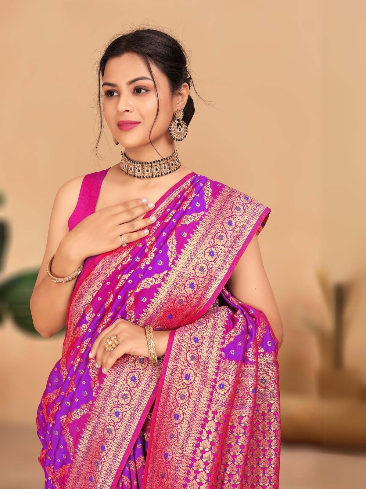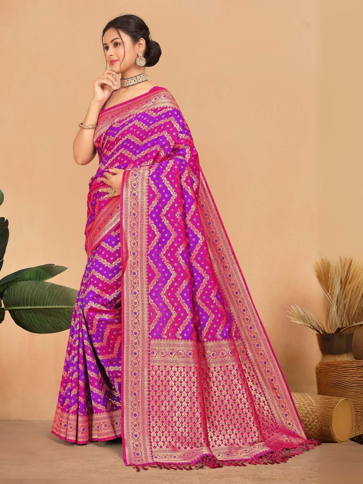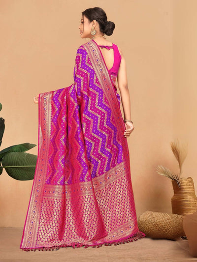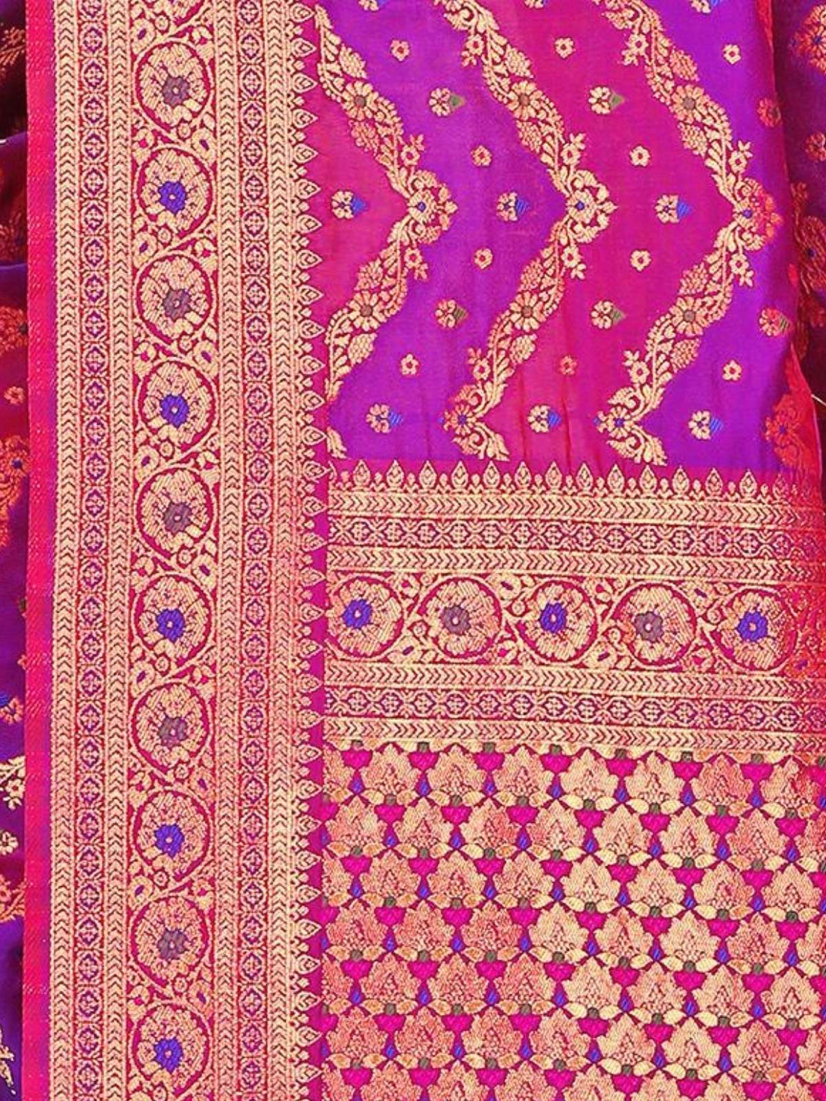 Odette Pink And Blue Woven Banarasi Silk Saree With Unstitched Blouse for Women