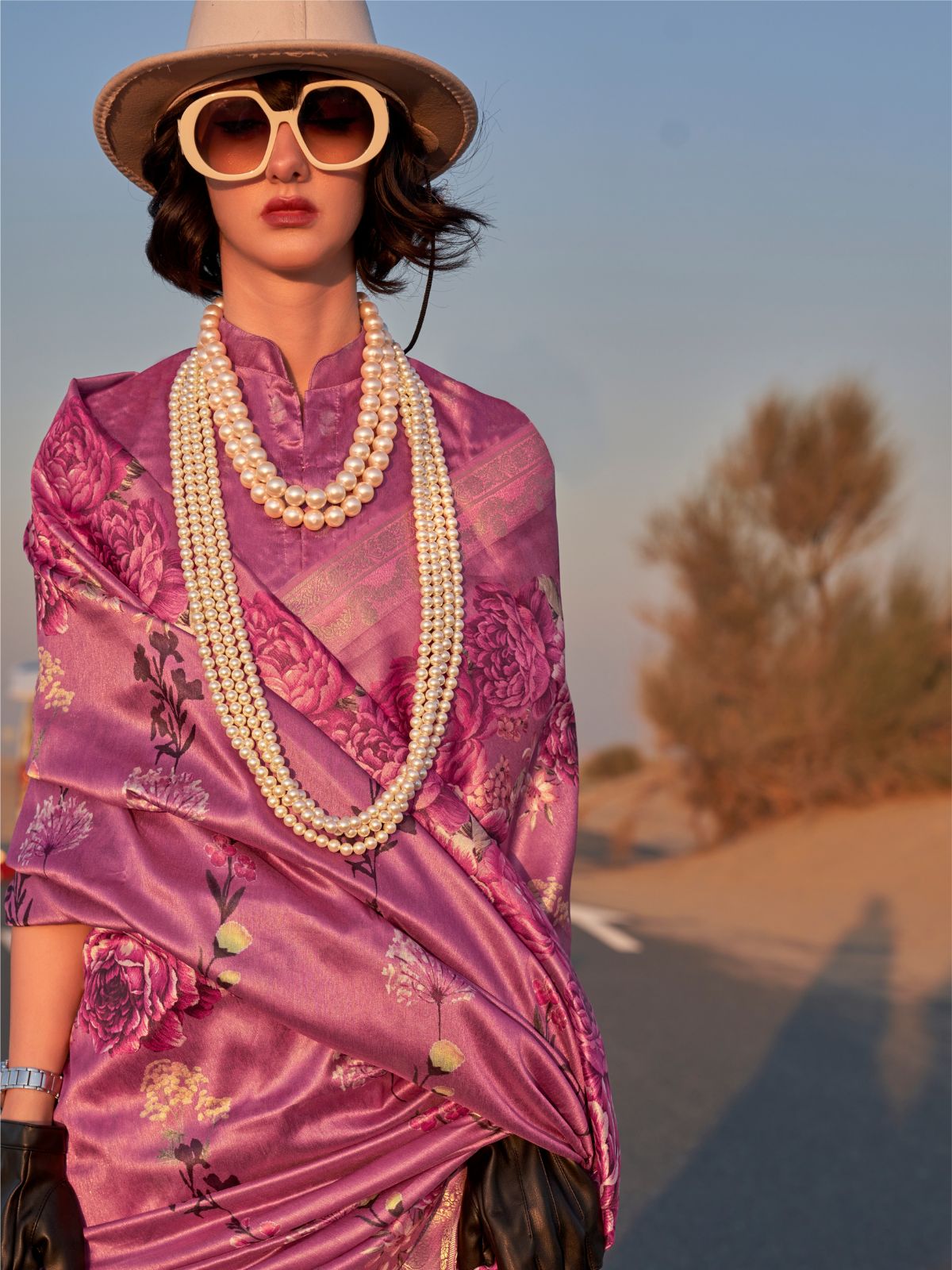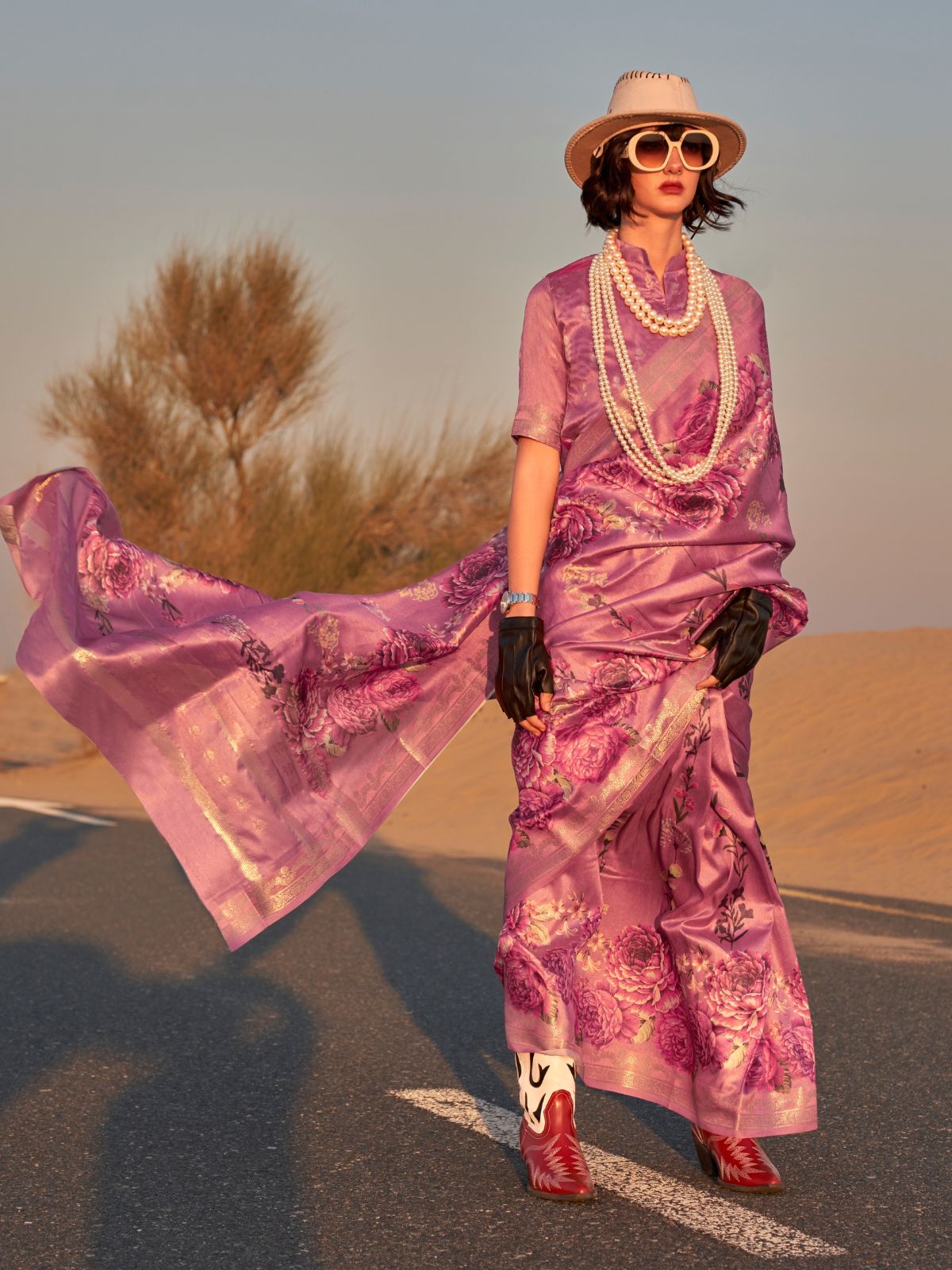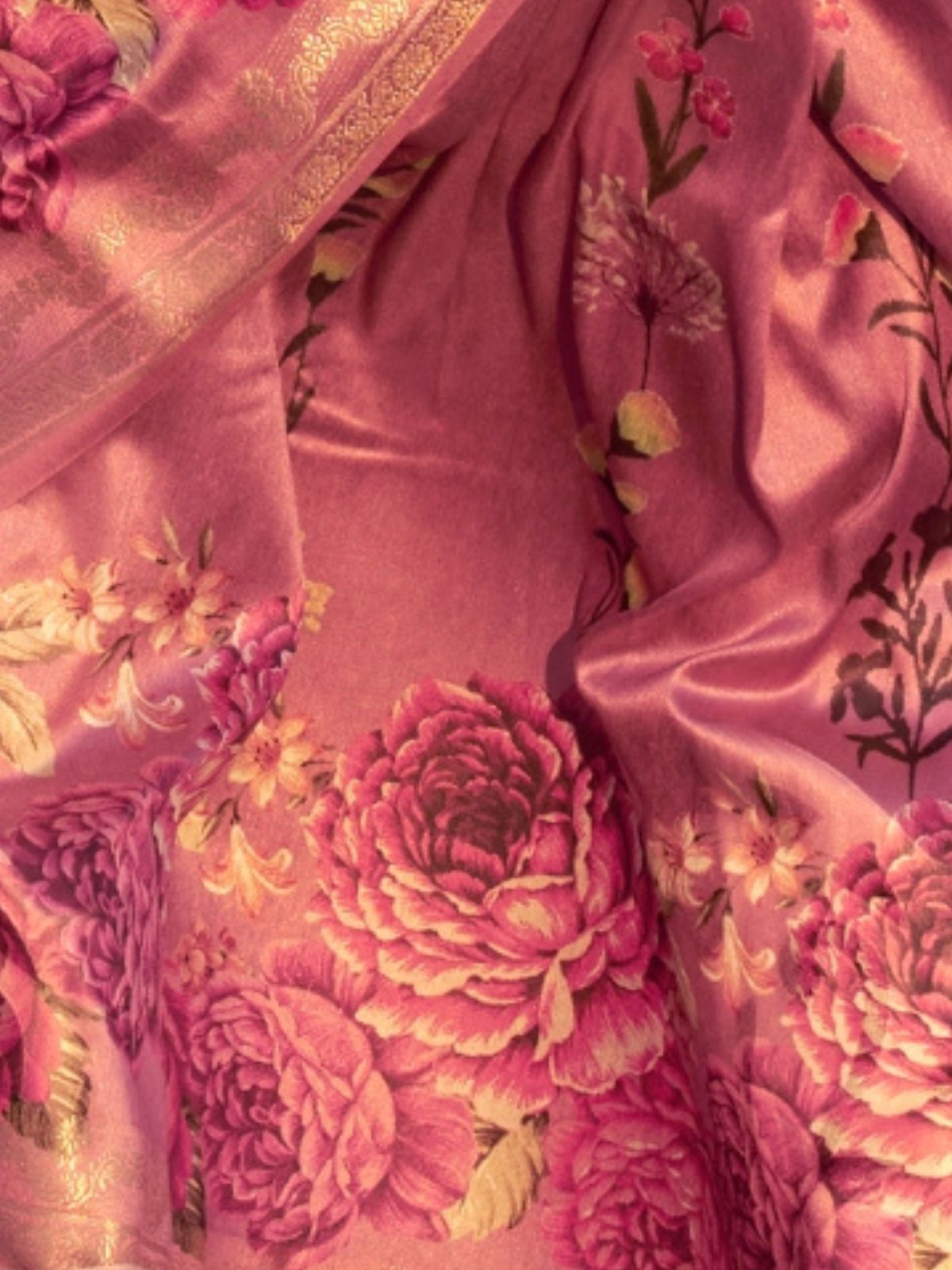 Odette Pink Silk Blend Printed Saree With Unstitched Blouse For Women